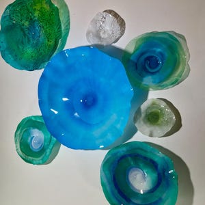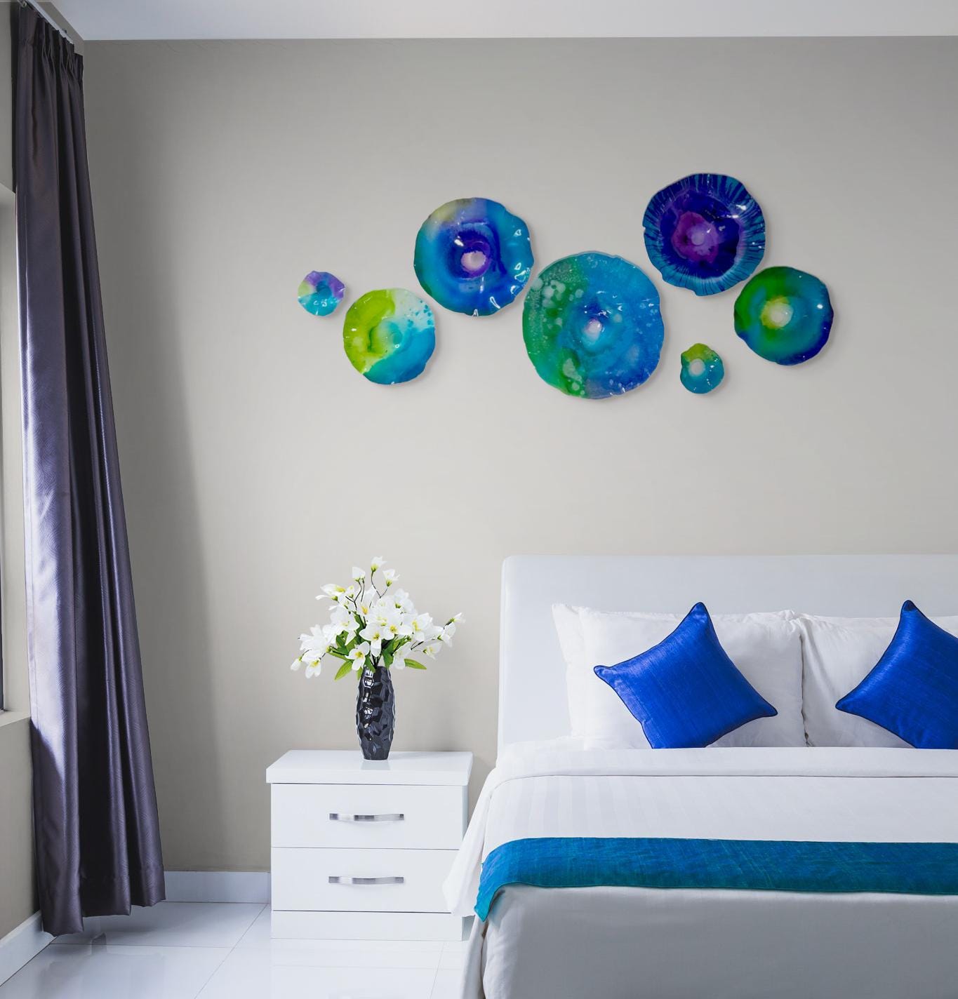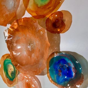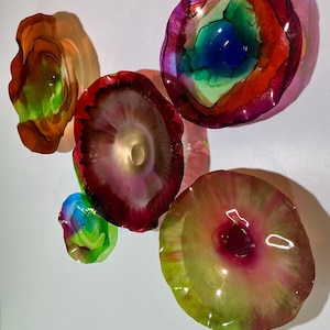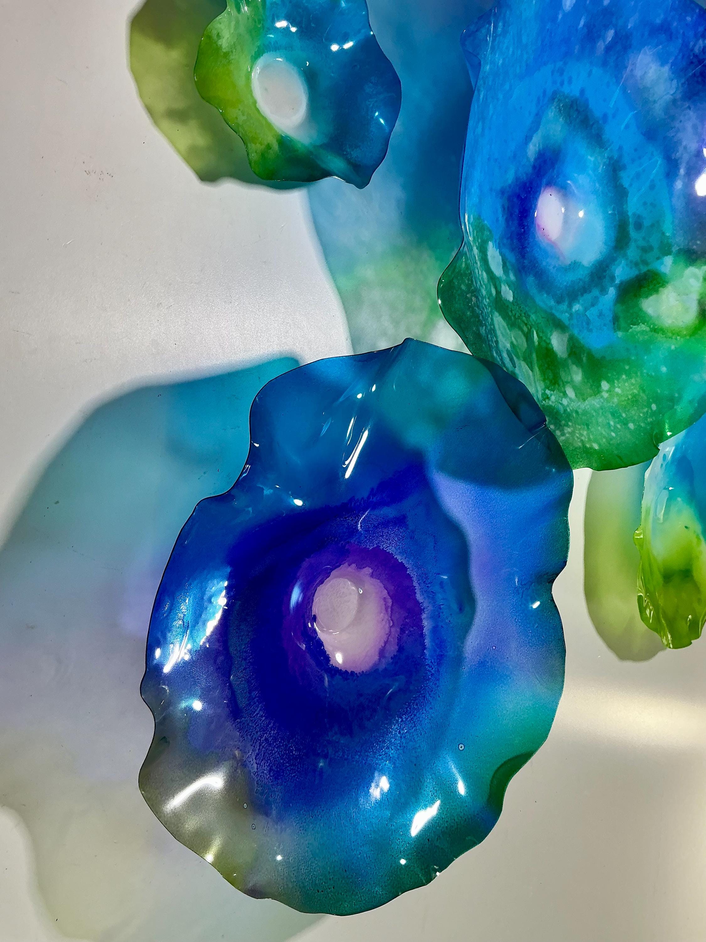 From the wall, they look like glass. The bonuses are that these flowers are light, unbreakable, environmentally friendly, easy to hang, and have no damage to the wall due to drilling for would-be-heavy traditional glass flowers.