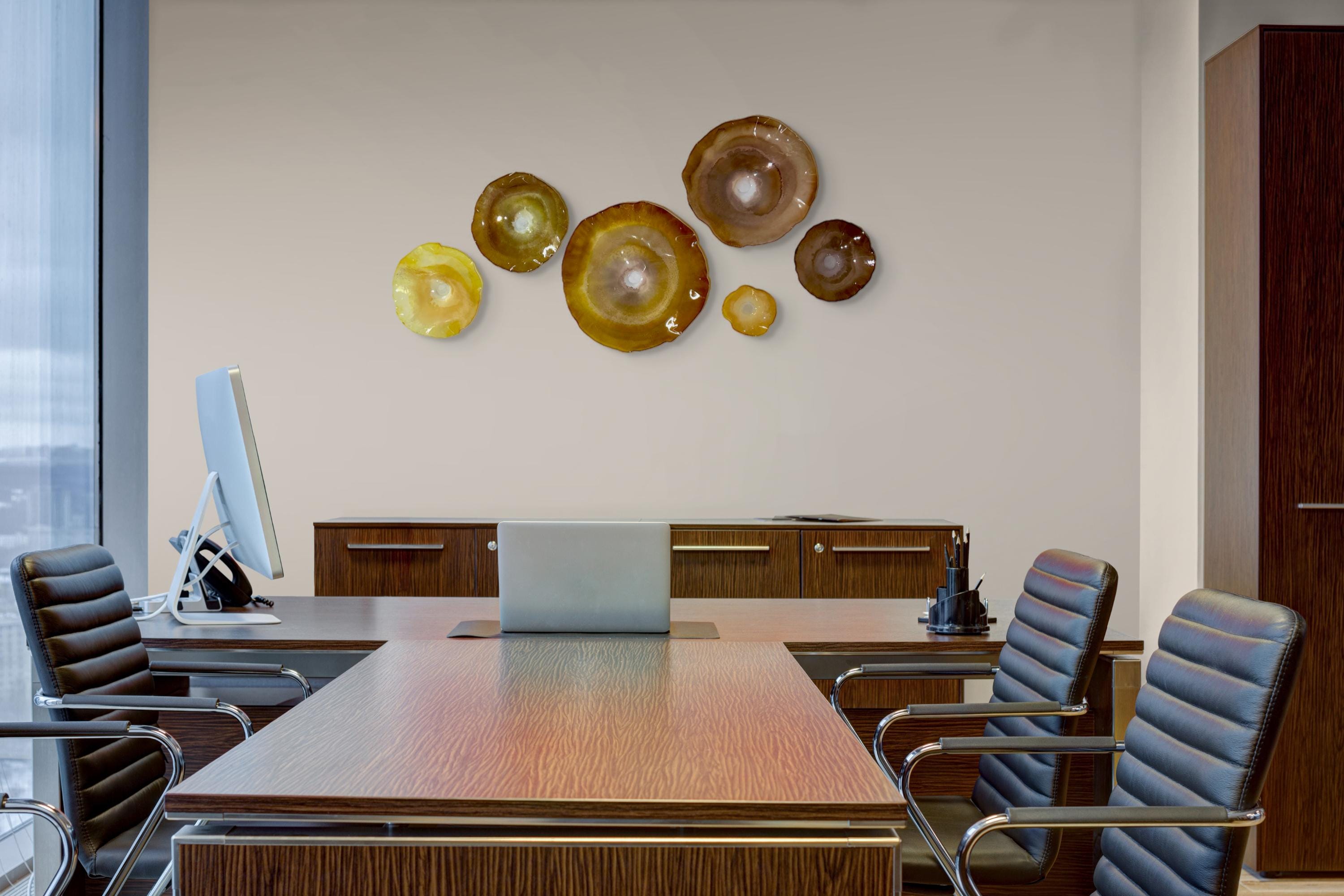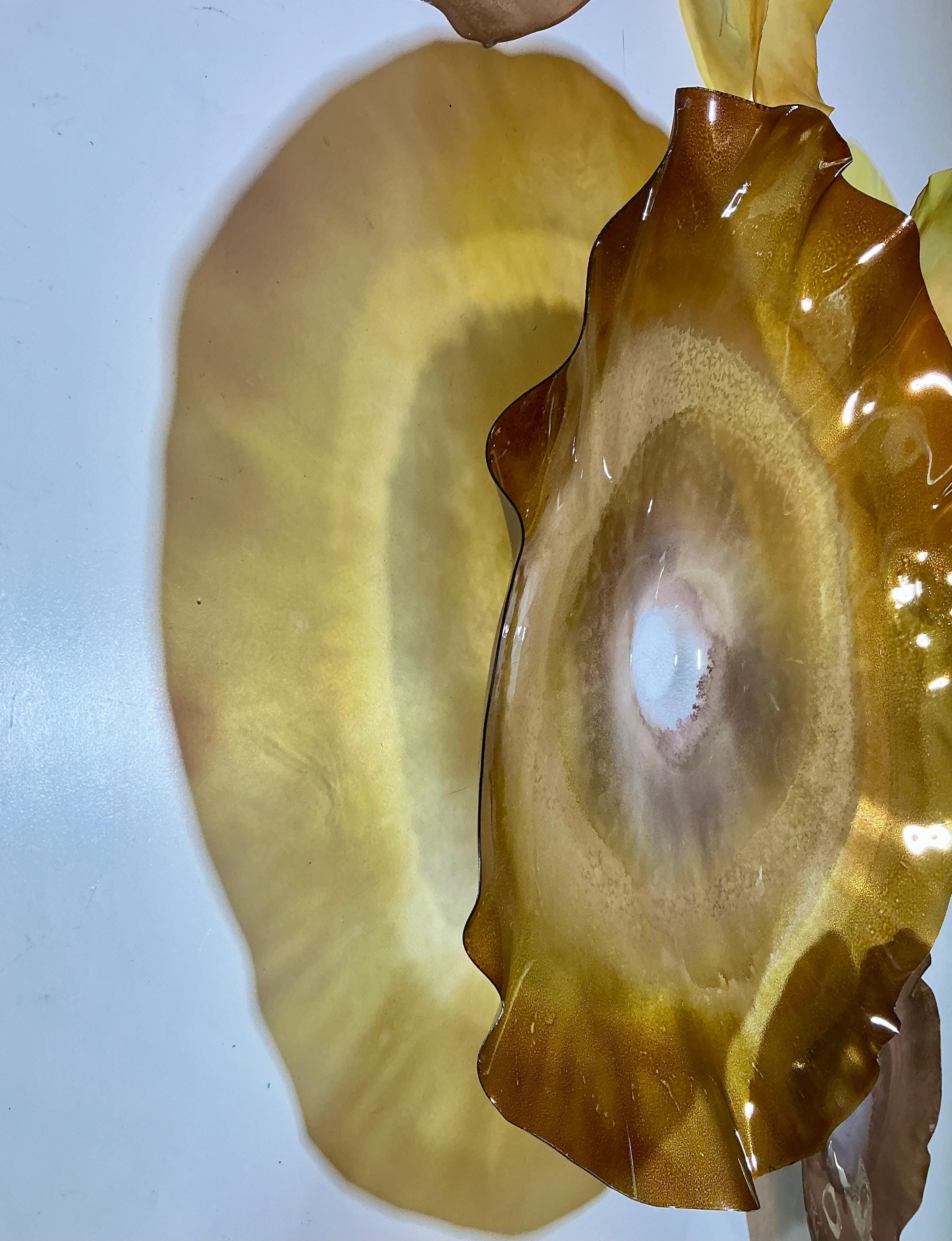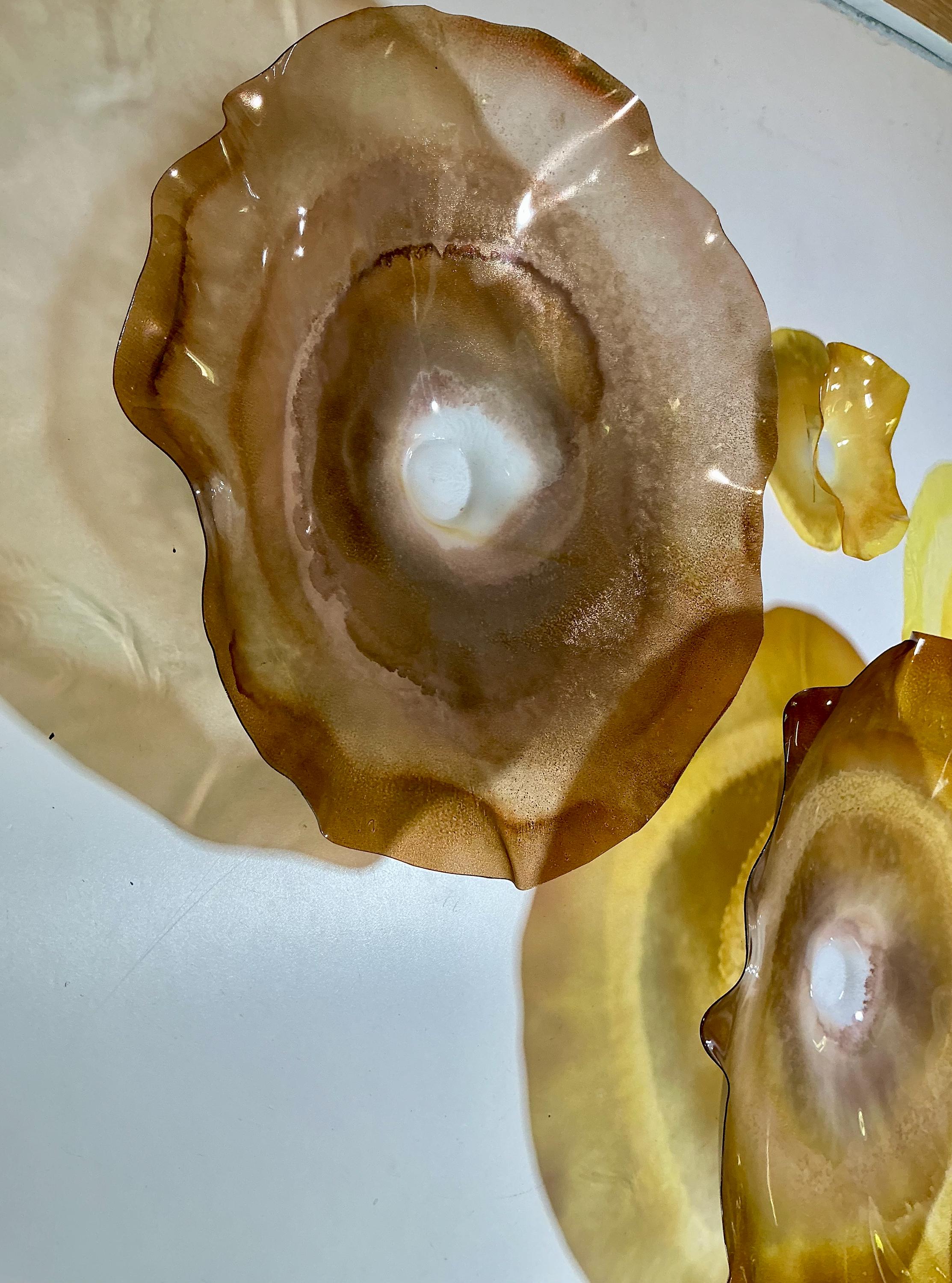From the wall, they look like glass. The bonuses are that these flowers are light, unbreakable, environmentally friendly, easy to hang, and have no damage to the wall due to drilling for would-be-heavy traditional glass flowers.