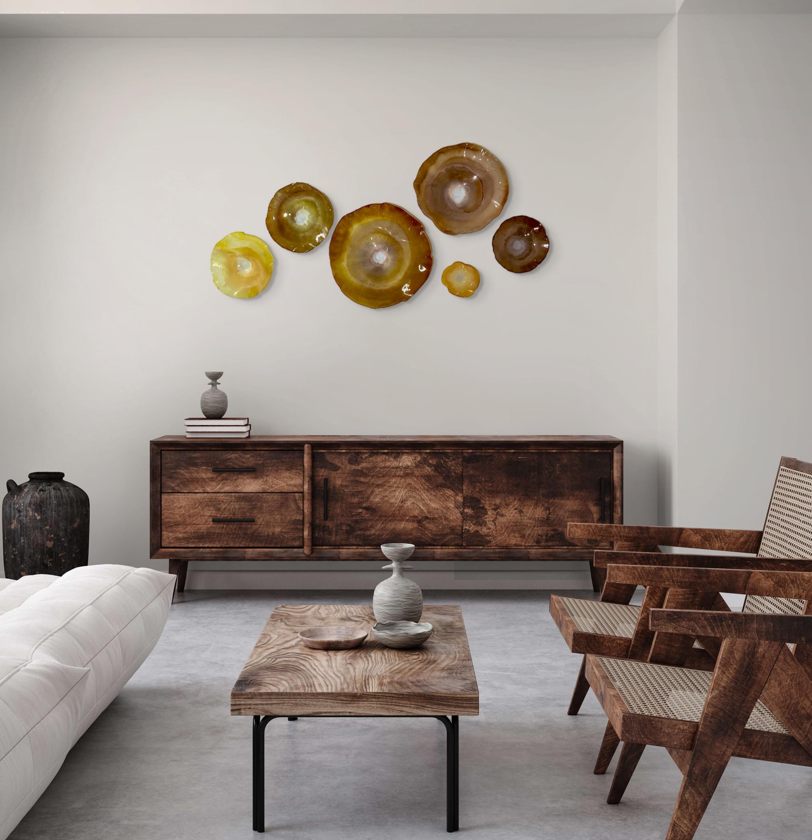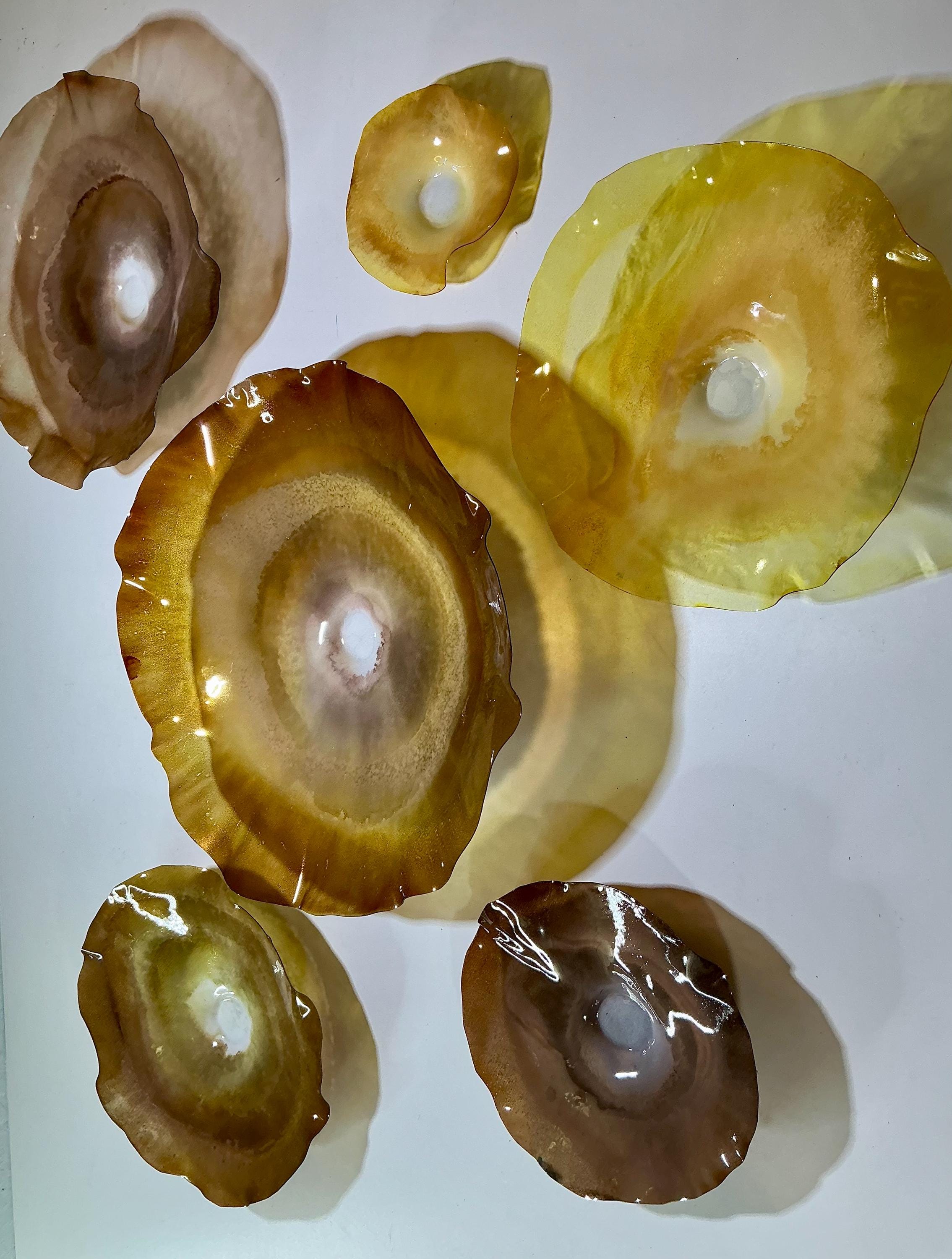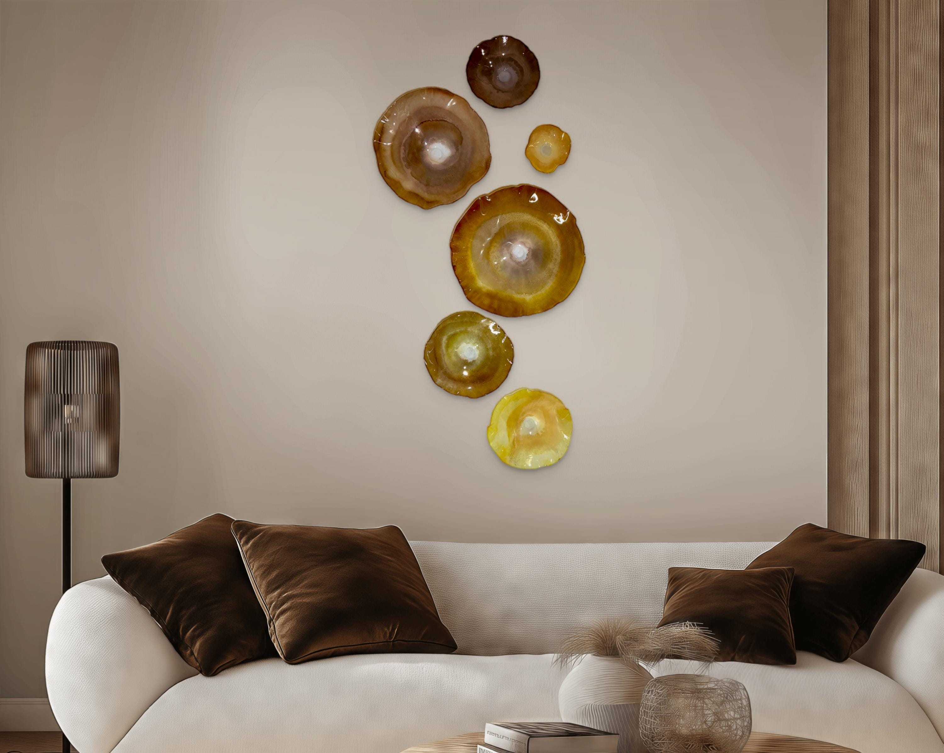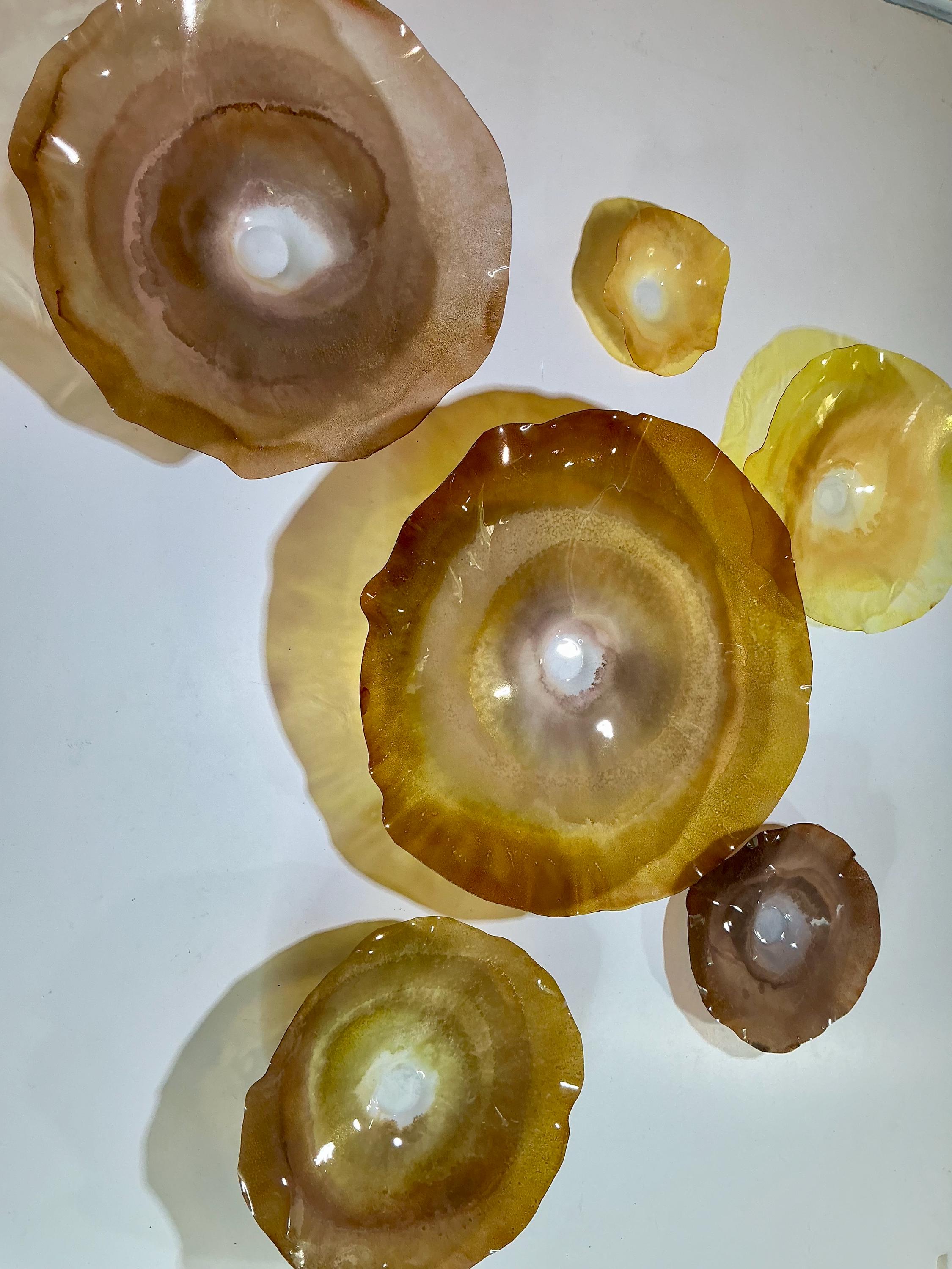 From the wall, they look like glass. The bonuses are that these flowers are light, unbreakable, environmentally friendly, easy to hang, and have no damage to the wall due to drilling for would-be-heavy traditional glass flowers.