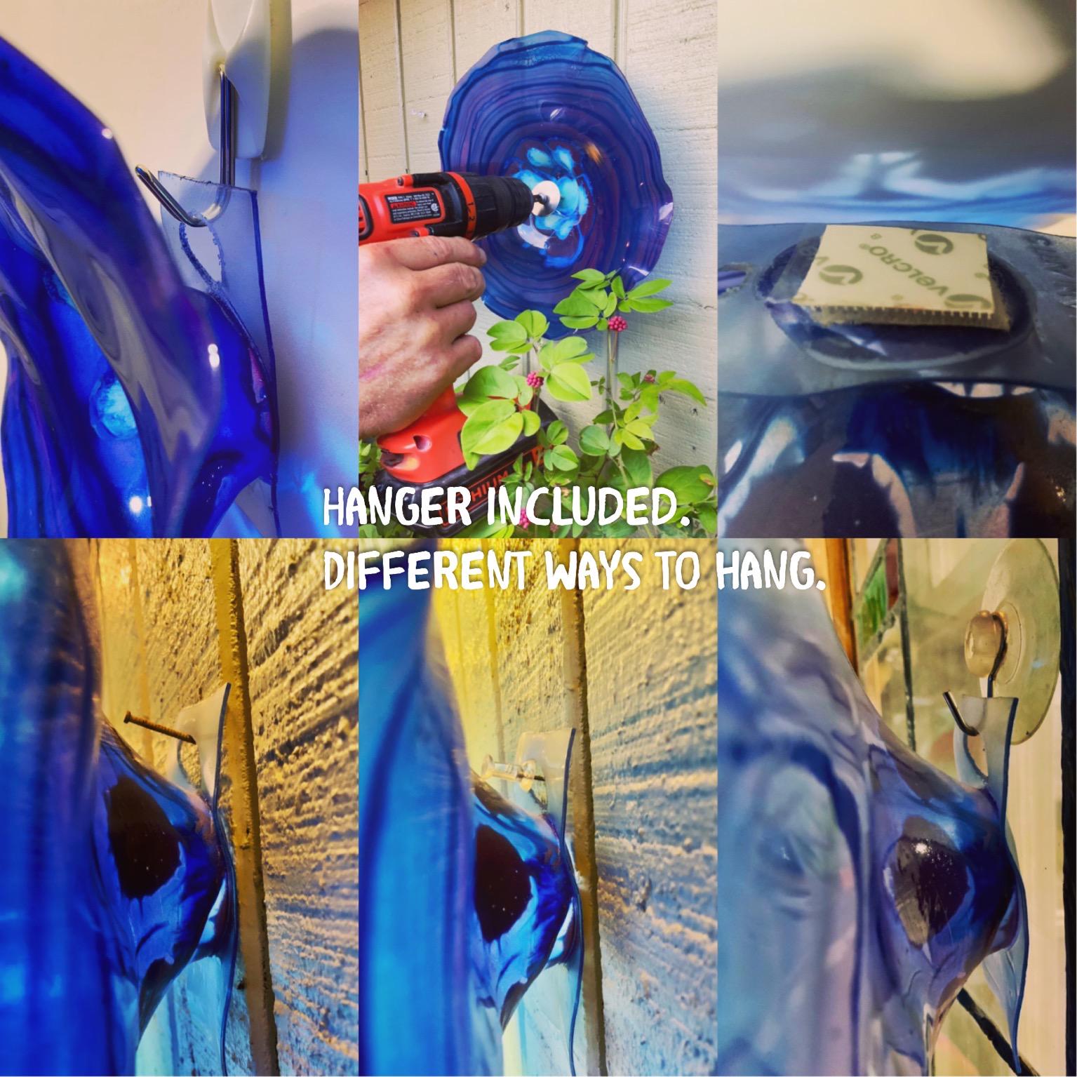 Each flower come with a hanger with a hole in the back for easy hanging. Each piece is light weight and all you will need is a small nail to hang it from. If you can hang a picture, you can hang these plates. Each order comes with a set of hanging instructions. For outdoor or commercial areas, please request our free hardware. For ceiling hanging please request velcro.