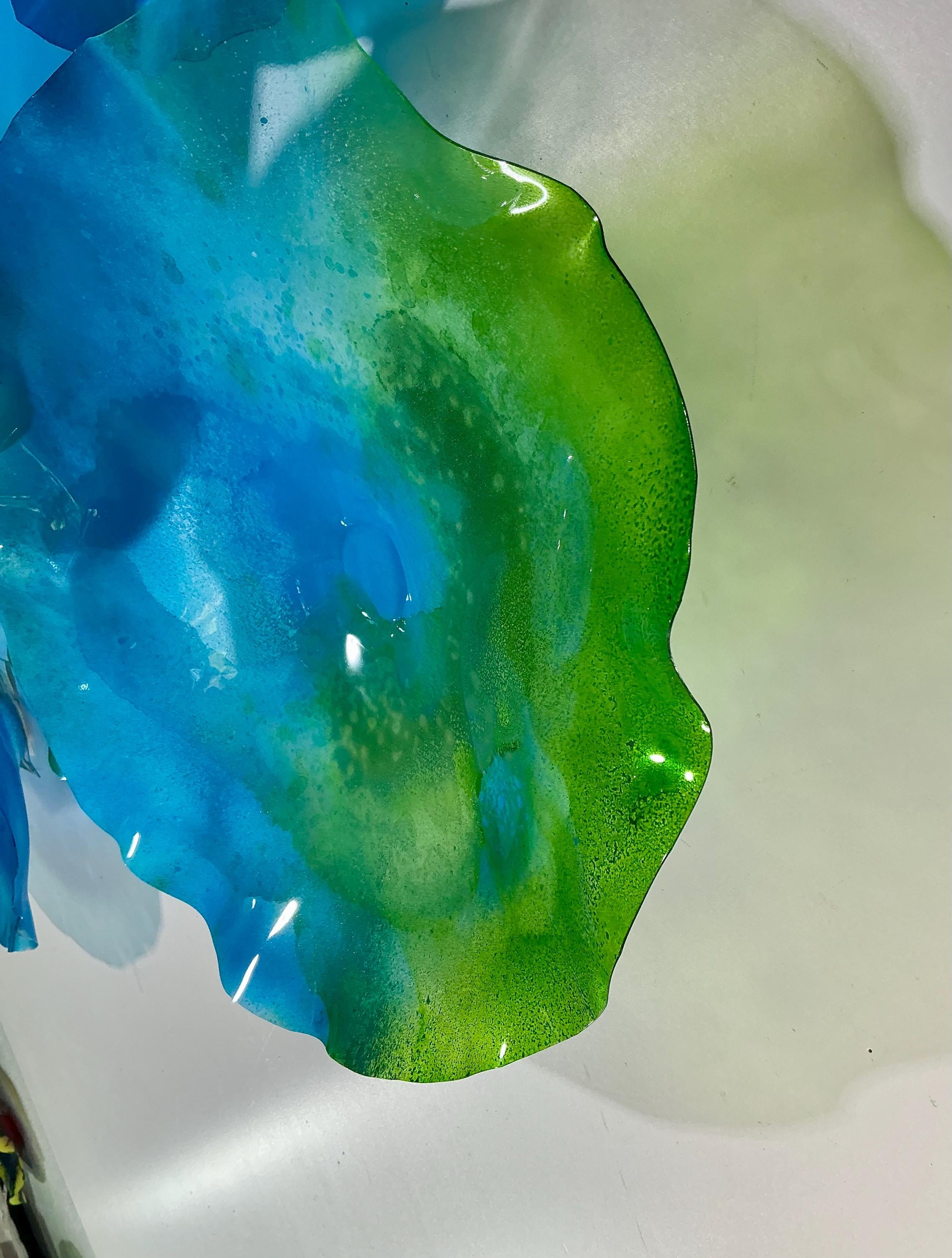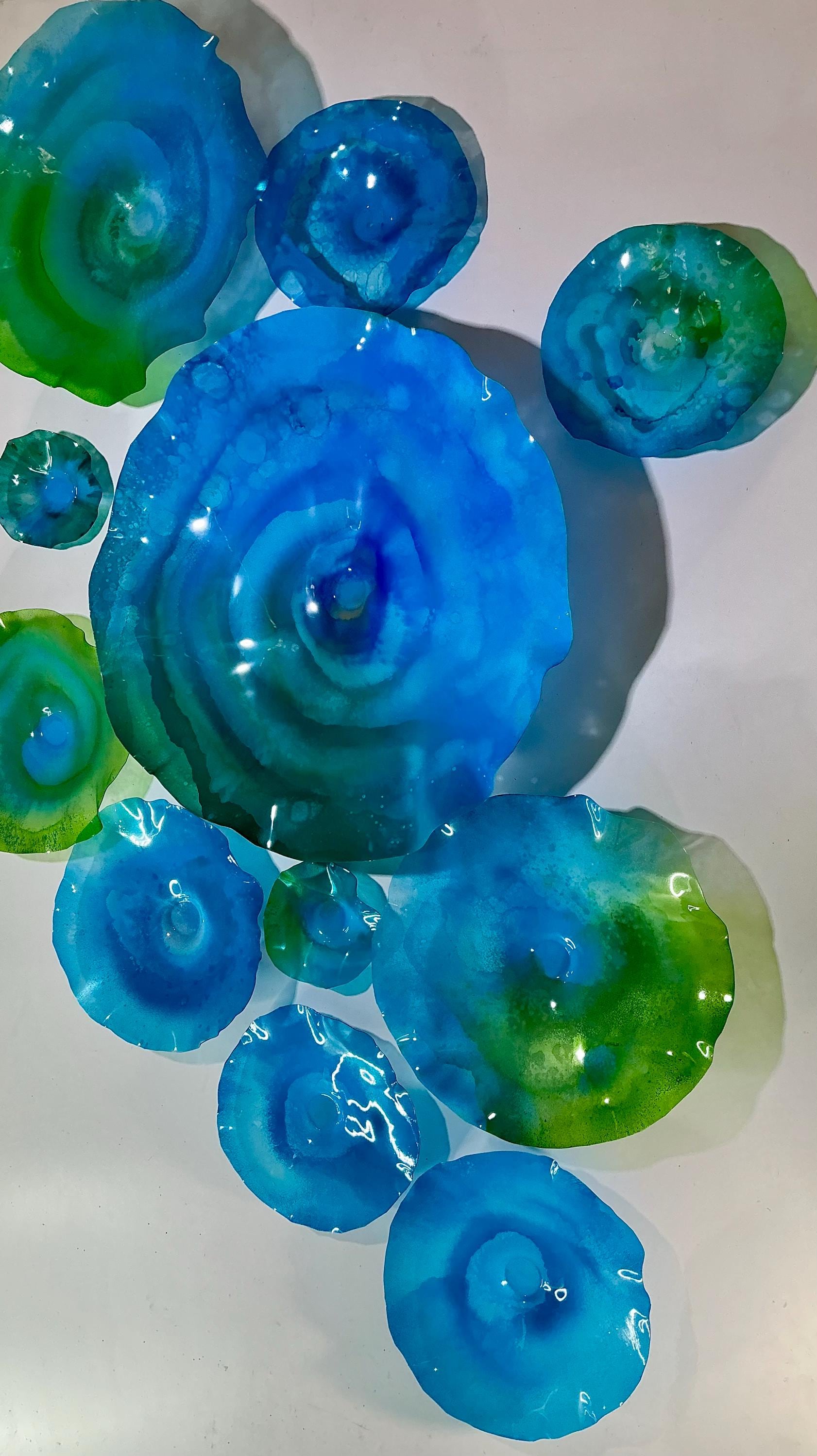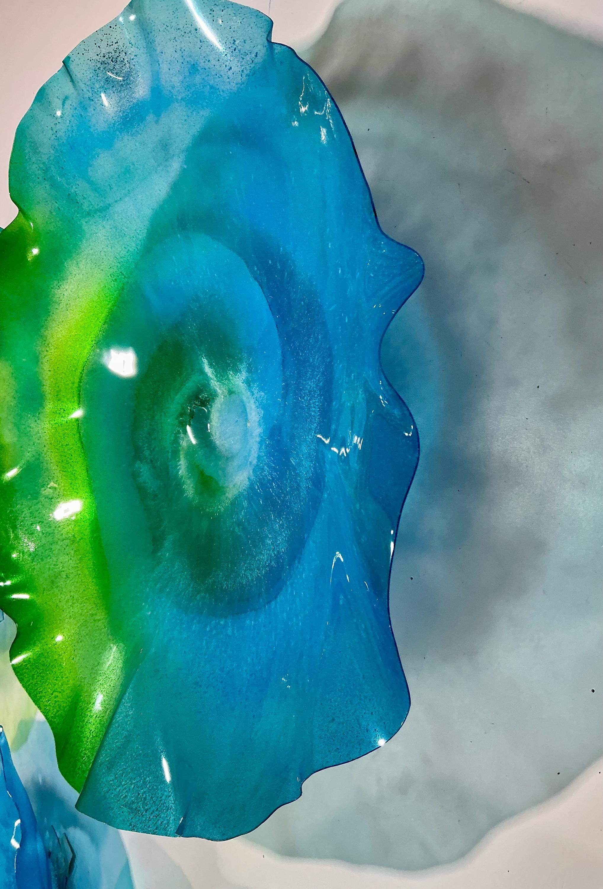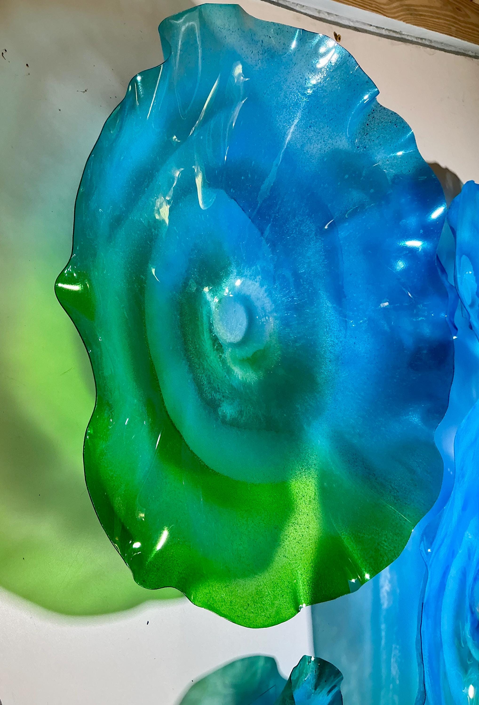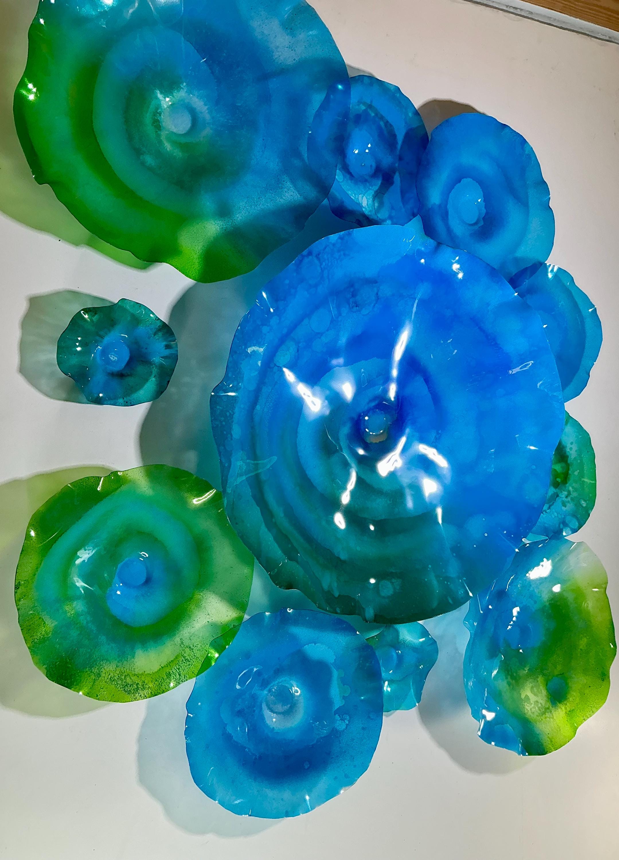 From the wall, they look like glass. The bonuses are that these flowers are light, unbreakable, environmentally friendly, easy to hang, and have no damage to the wall due to drilling for would-be-heavy traditional glass flowers.