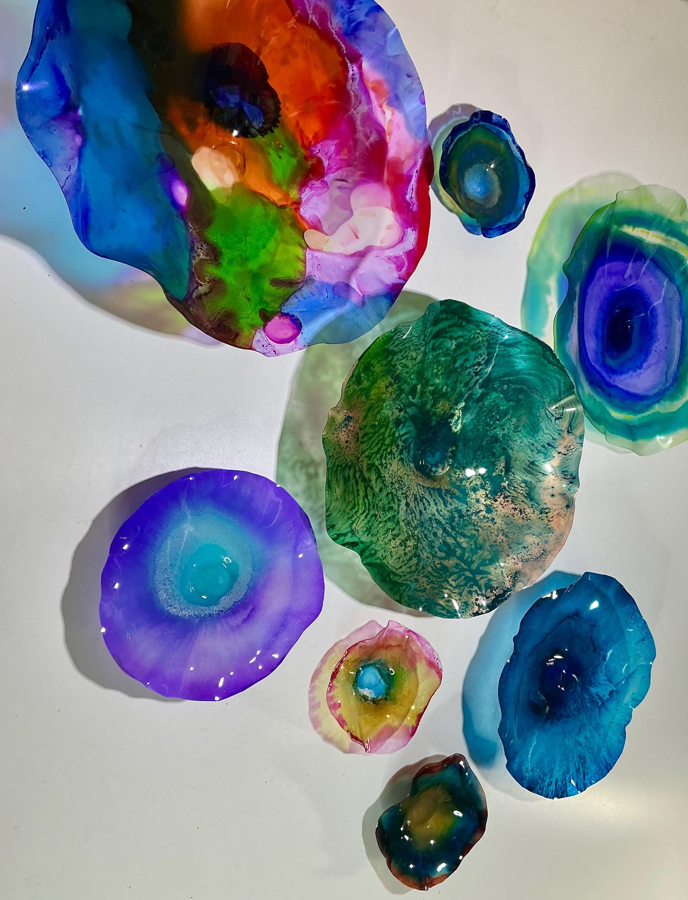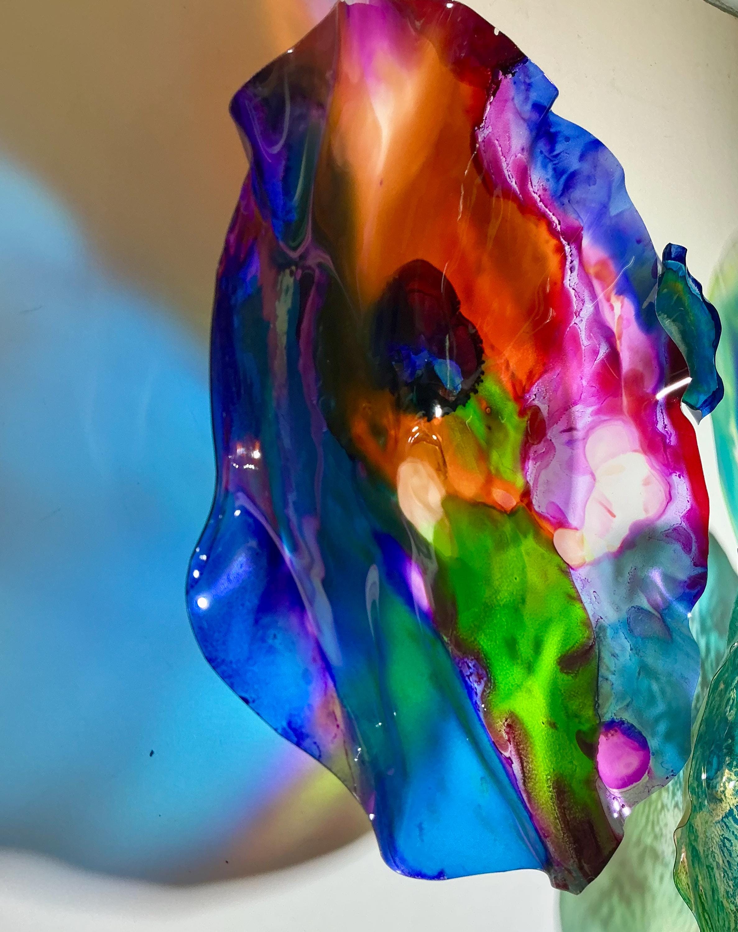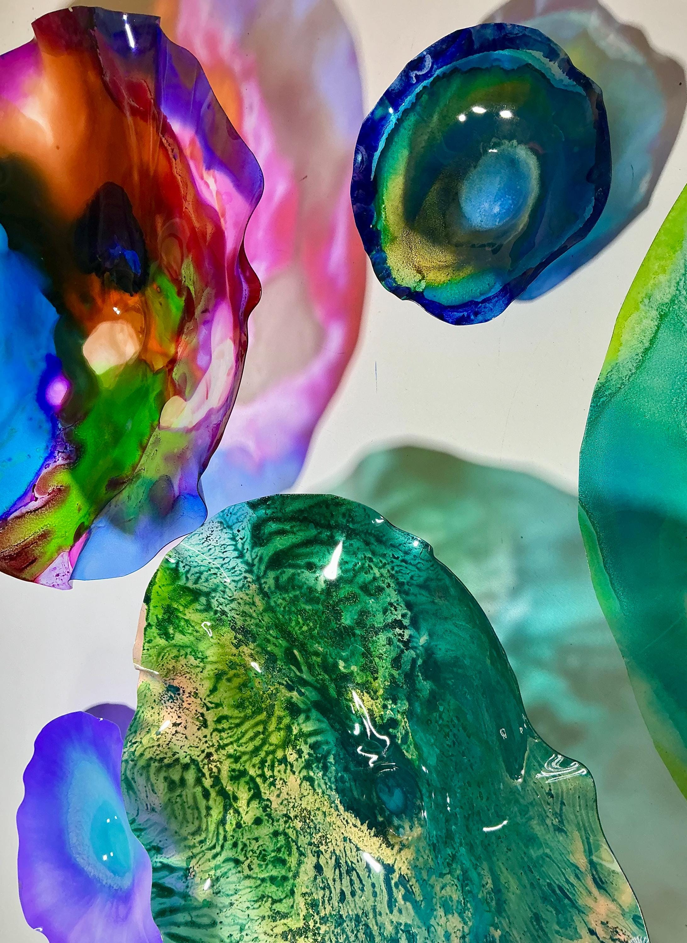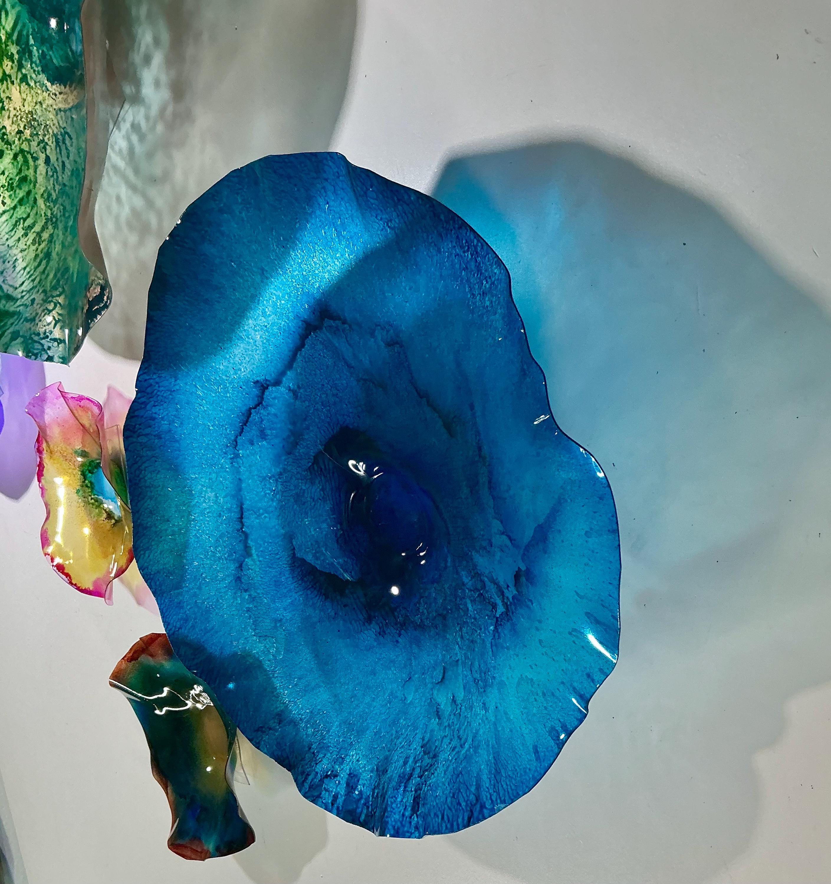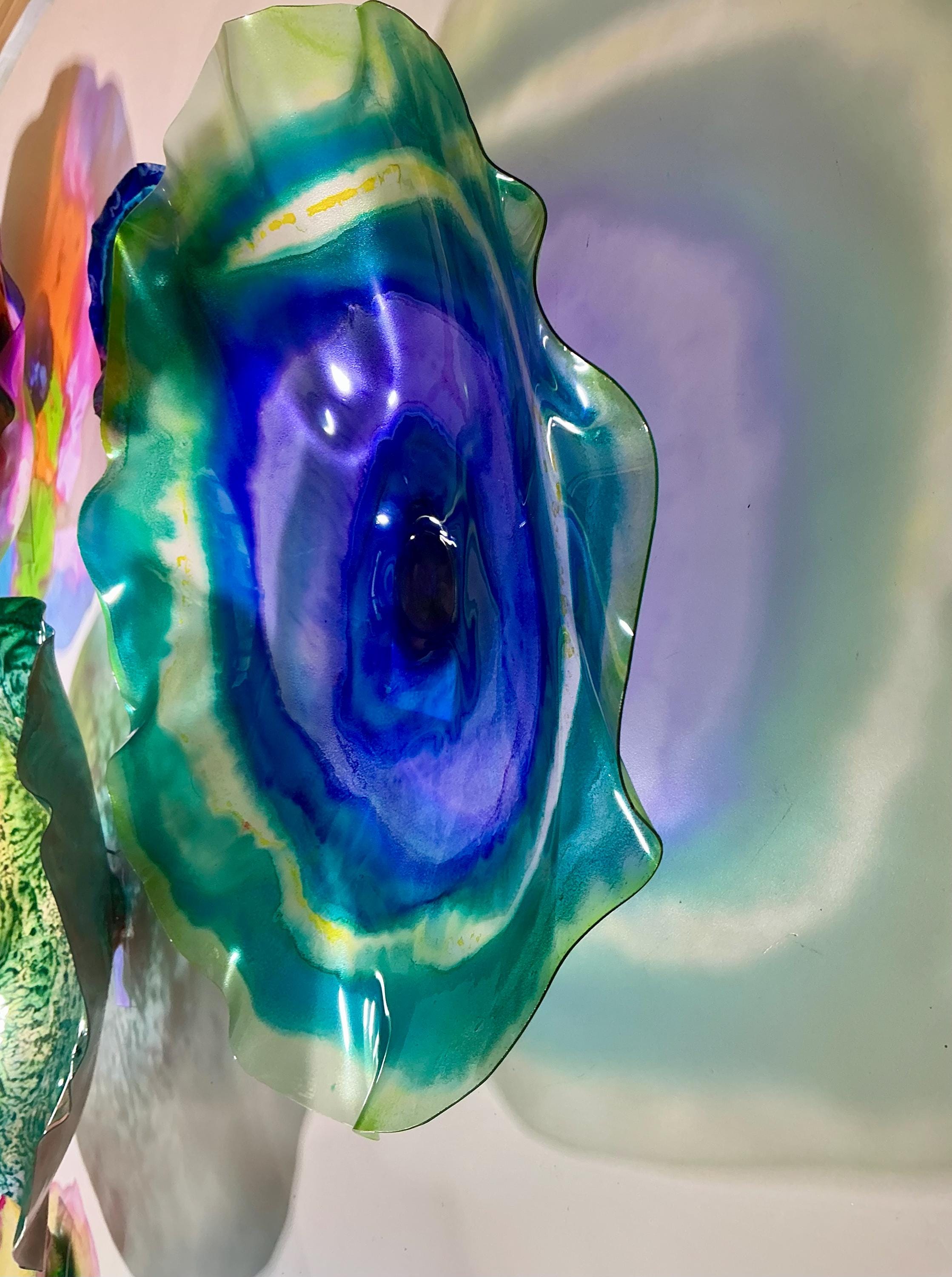 From the wall, they look like glass. The bonuses are that these flowers are light, unbreakable, environmentally friendly, easy to hang, and have no damage to the wall due to drilling for would-be-heavy traditional glass flowers.