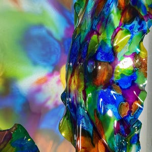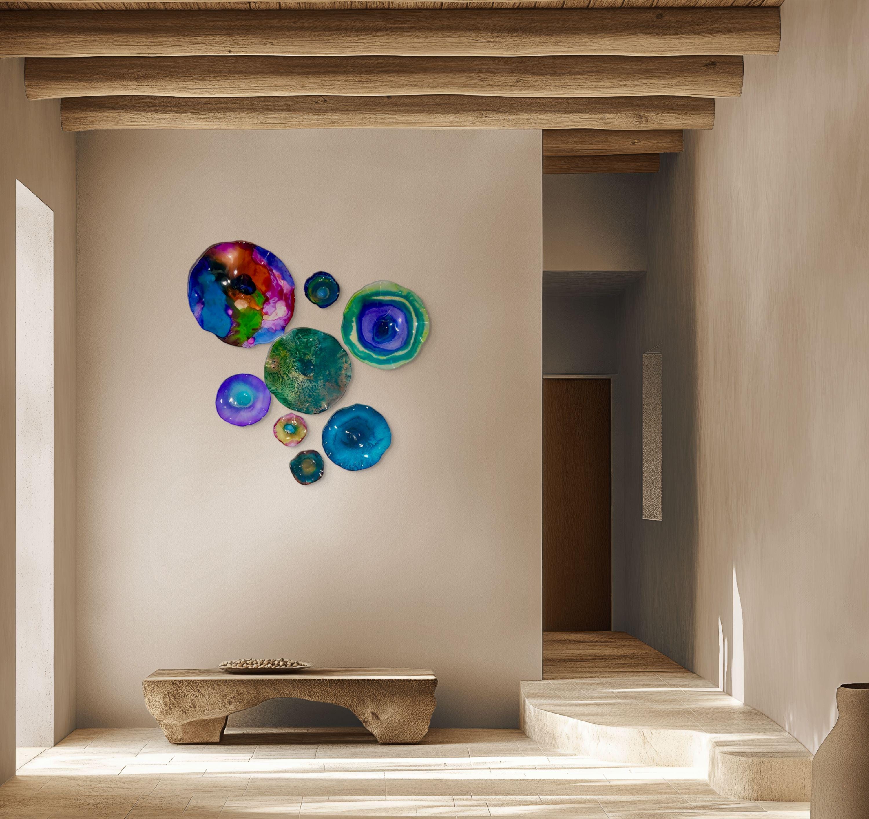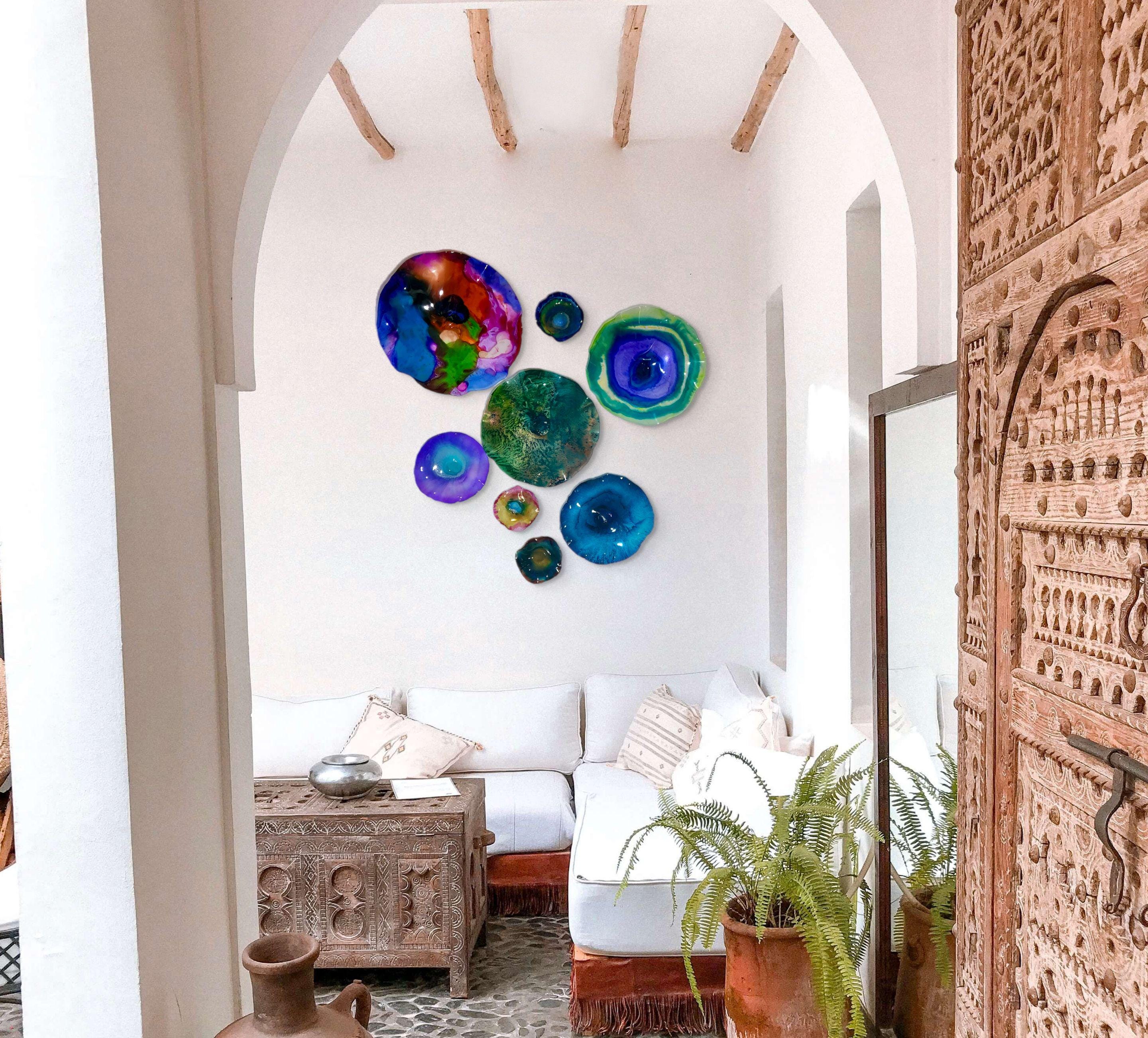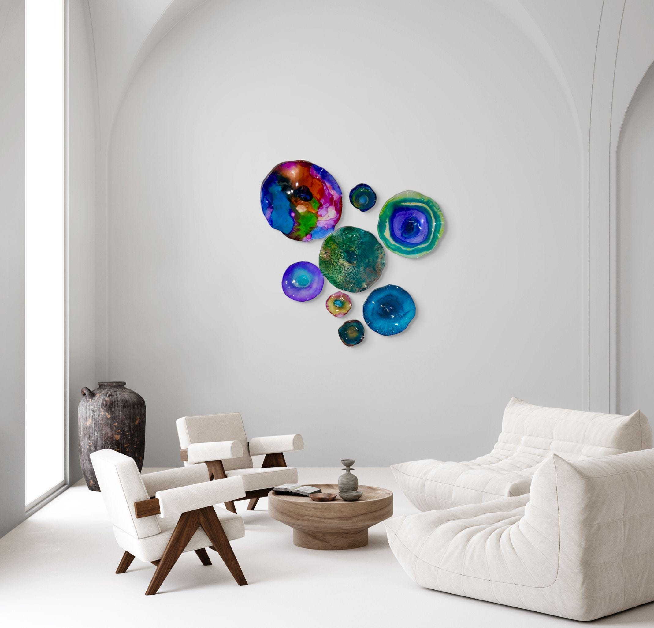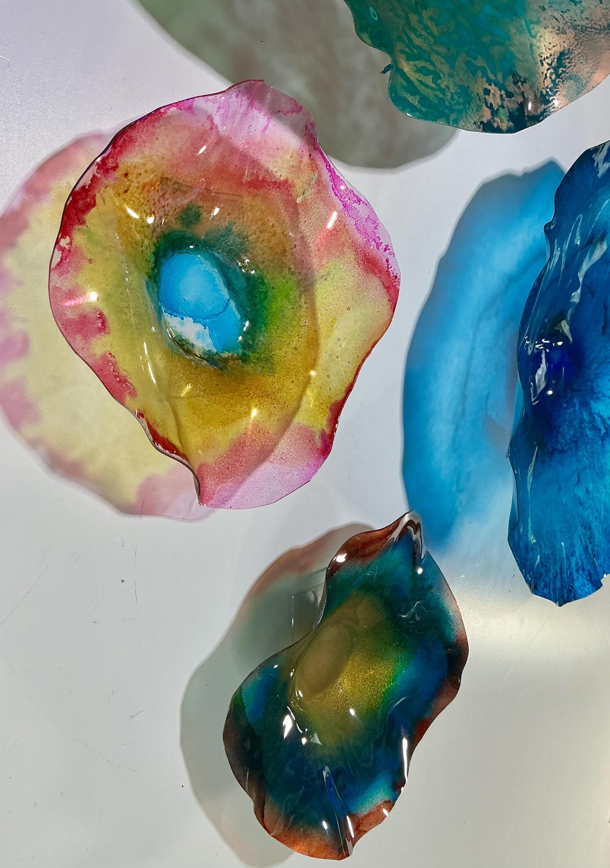 From the wall, they look like glass. The bonuses are that these flowers are light, unbreakable, environmentally friendly, easy to hang, and have no damage to the wall due to drilling for would-be-heavy traditional glass flowers.