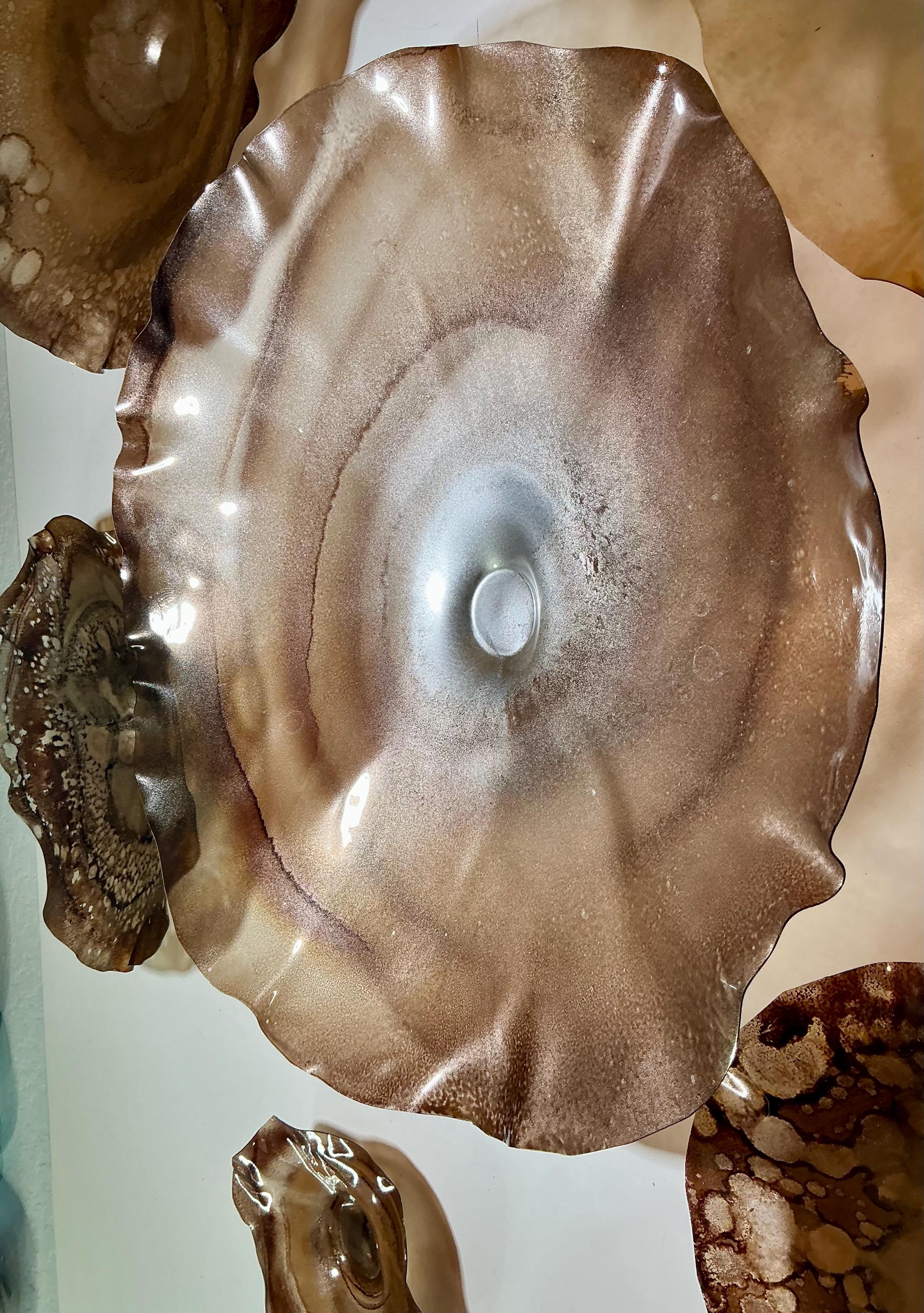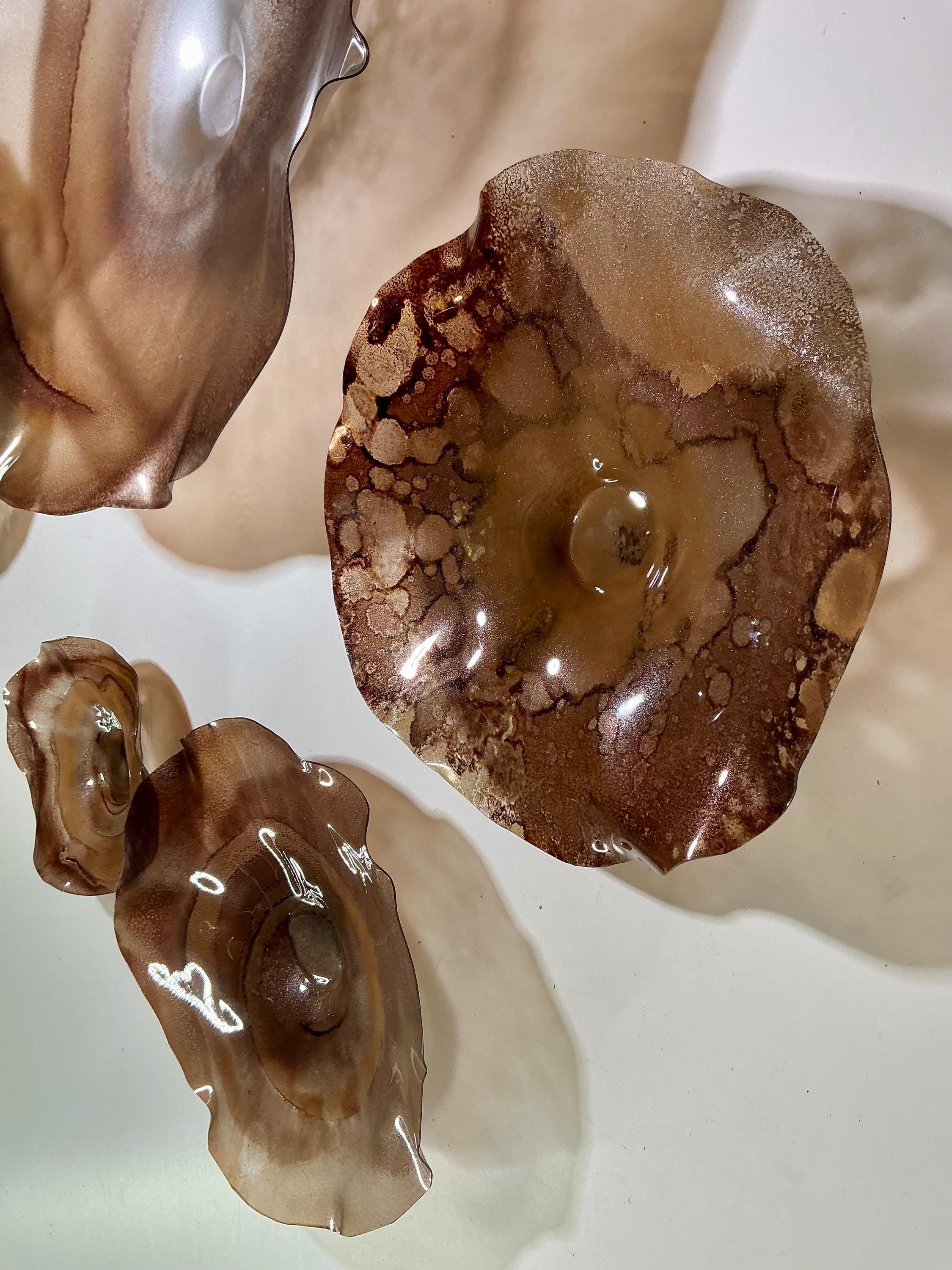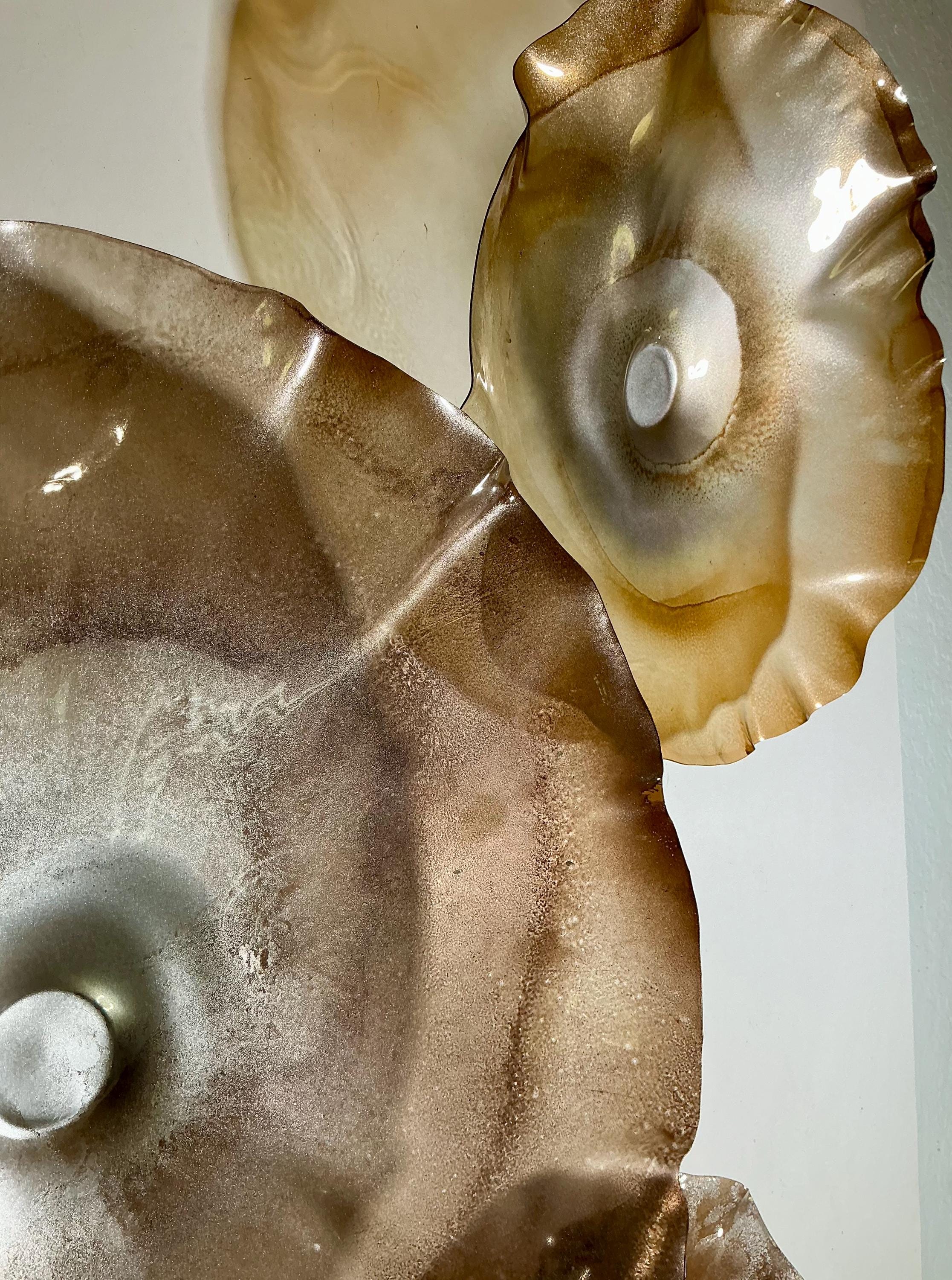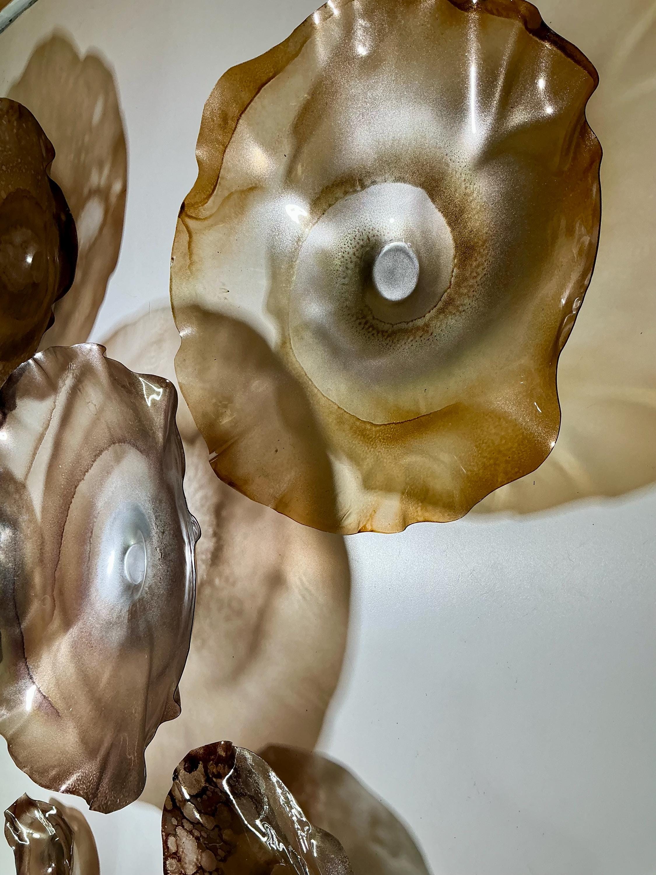 From the wall, they look like glass. The bonuses are that these flowers are light, unbreakable, environmentally friendly, easy to hang, and have no damage to the wall due to drilling for would-be-heavy traditional glass flowers.