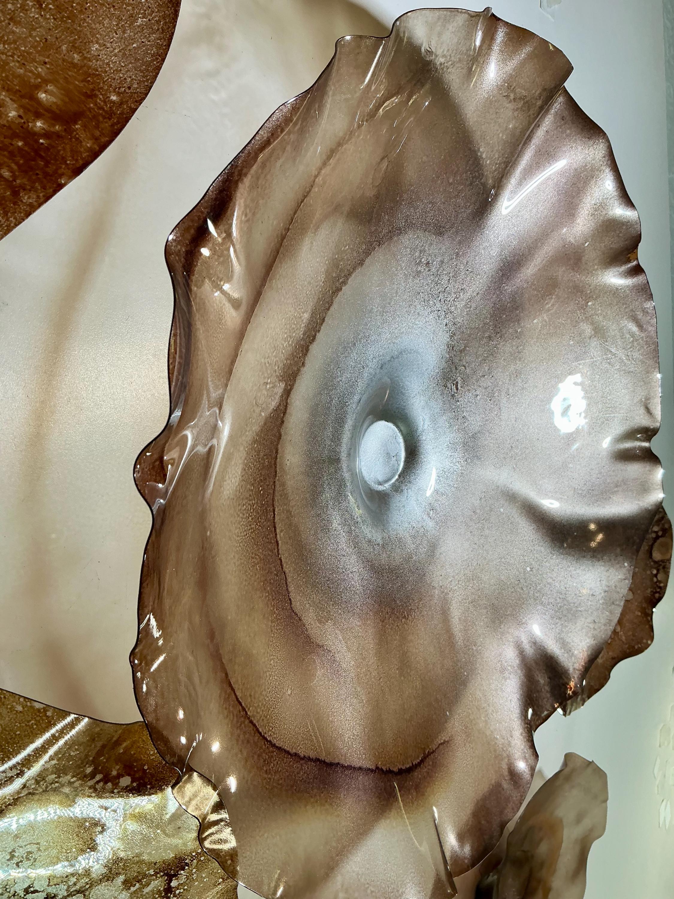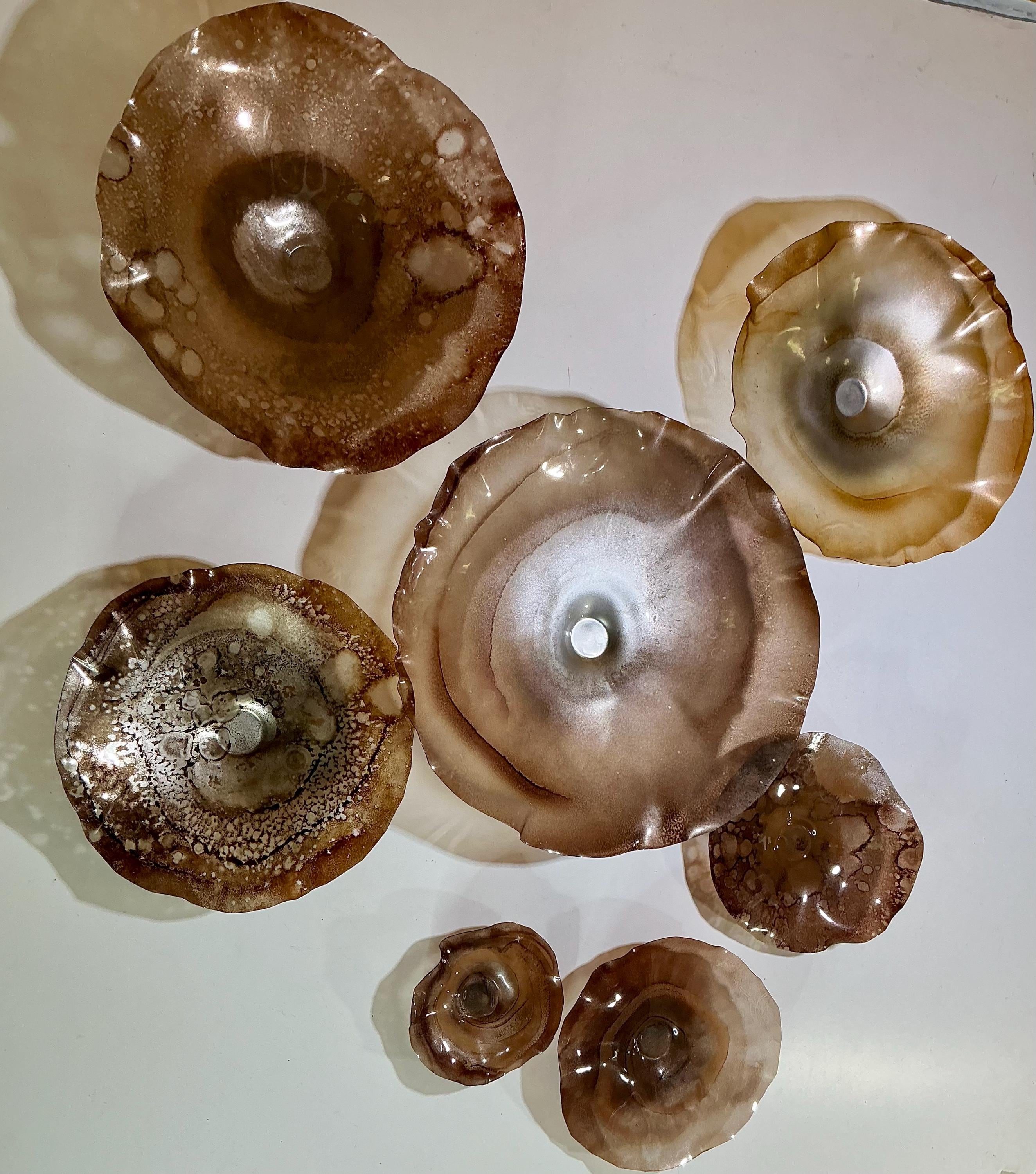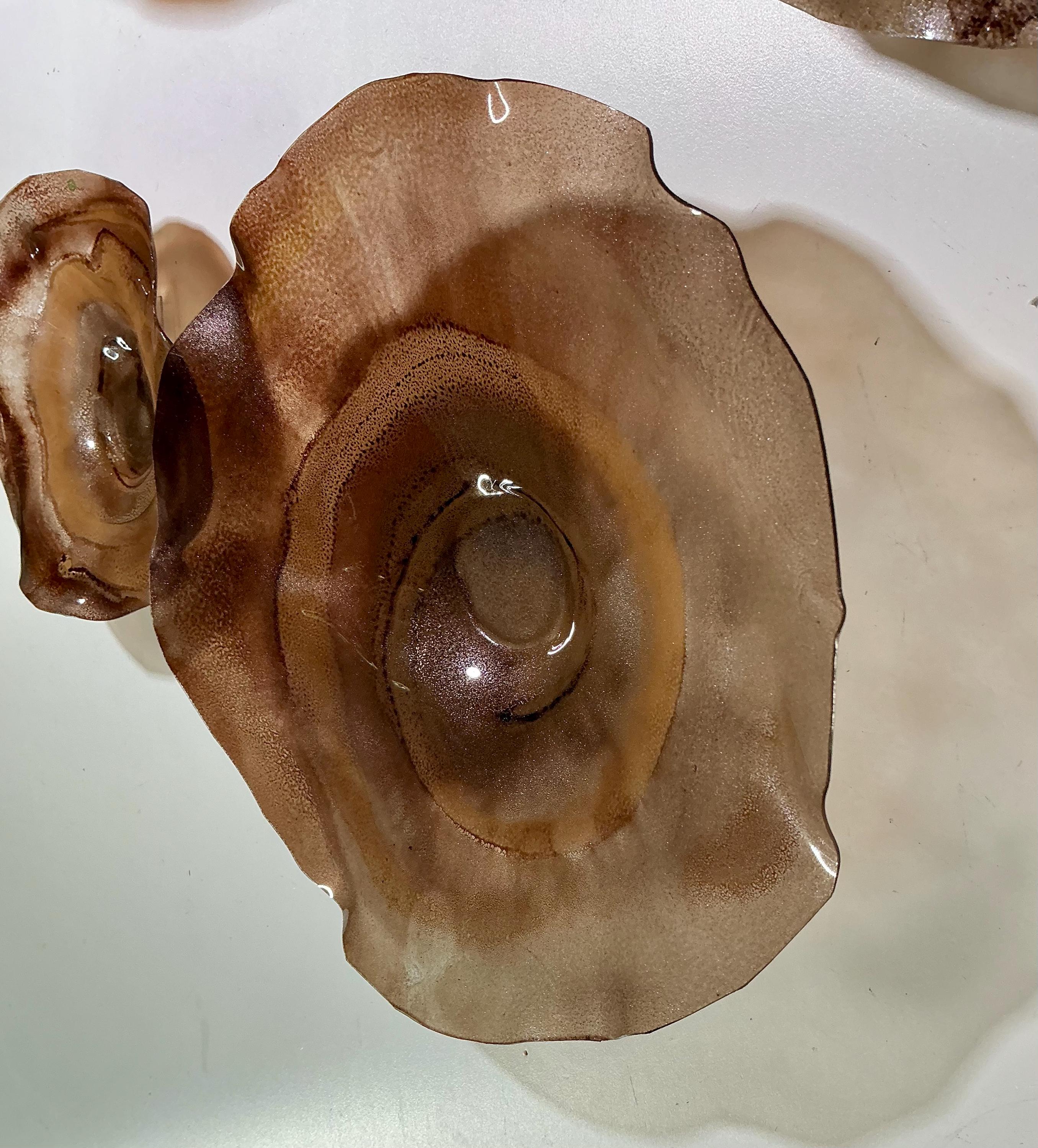 From the wall, they look like glass. The bonuses are that these flowers are light, unbreakable, environmentally friendly, easy to hang, and have no damage to the wall due to drilling for would-be-heavy traditional glass flowers.