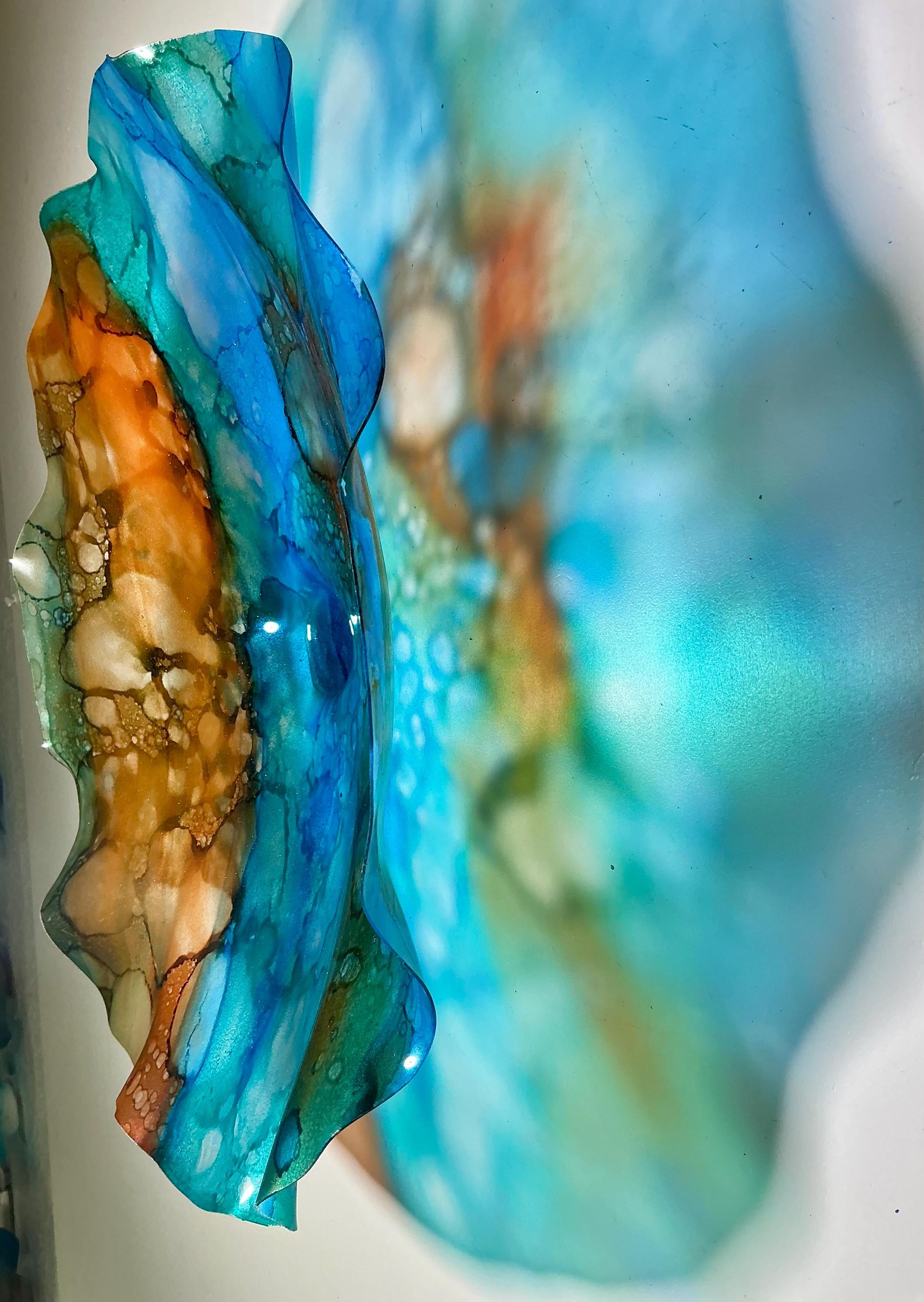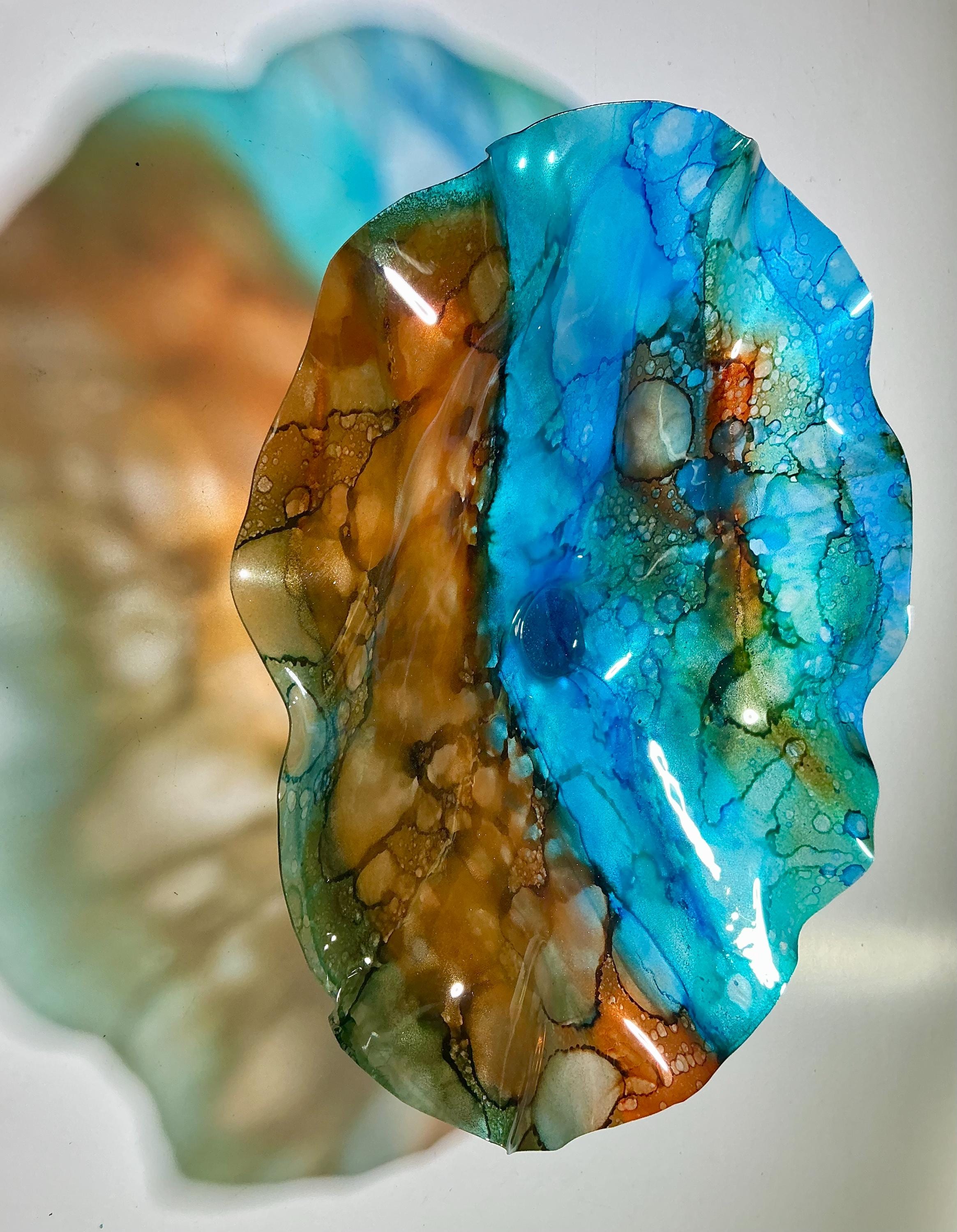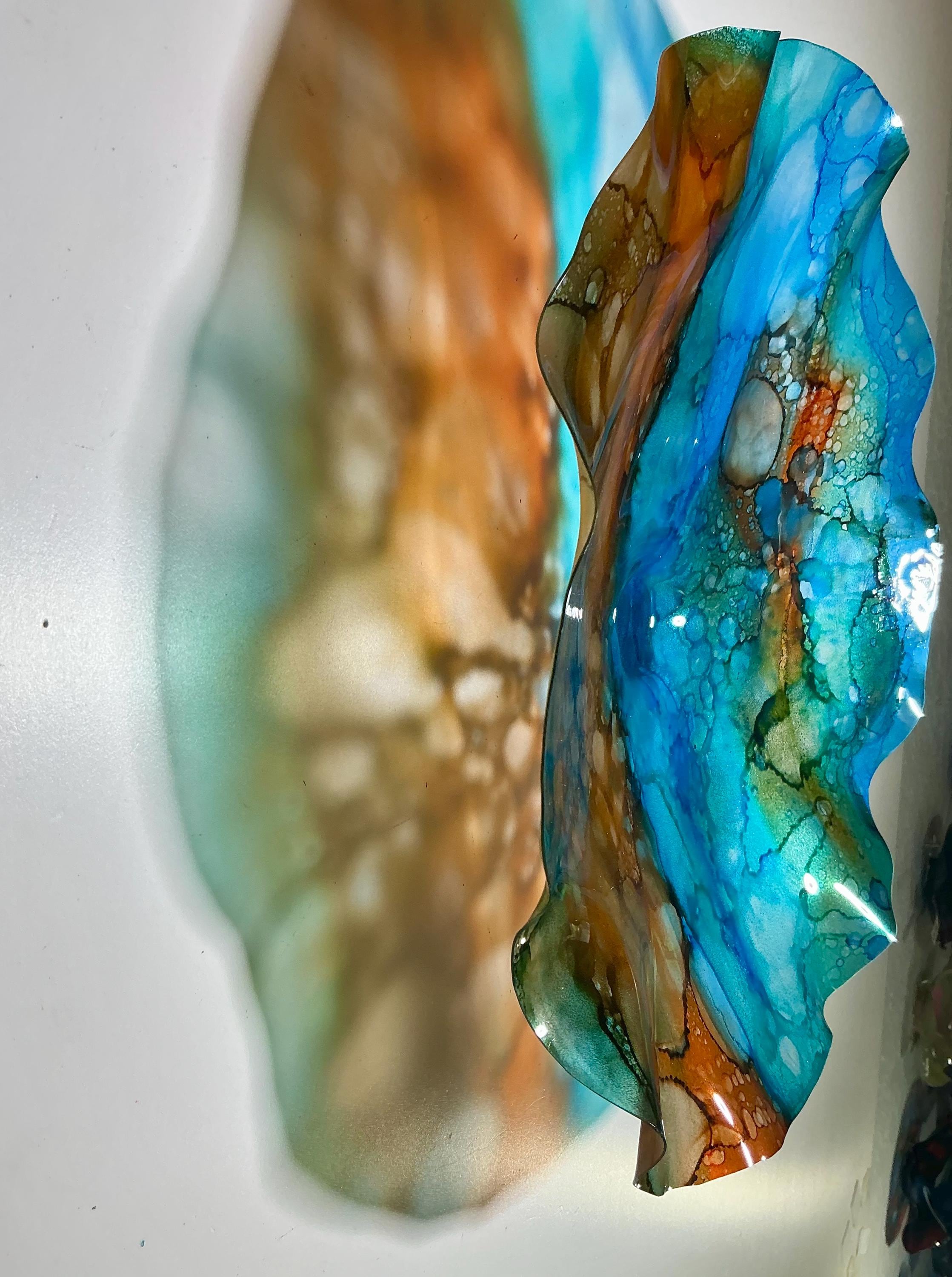 Each collectible piece is unique, no two are alike. This permanent, colorful, eye catching art looks like glass. It shimmers in the light resembling water. They are very DURABLE AND LIGHTWEIGHT. Great for indoor or outdoor decorating.