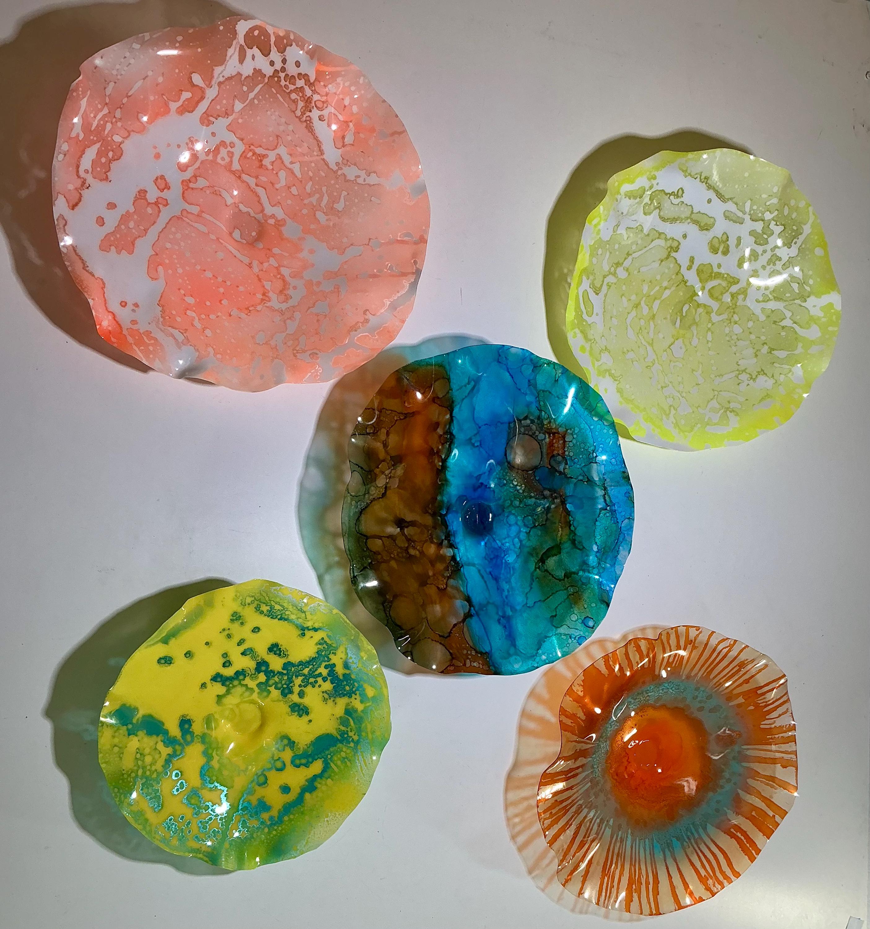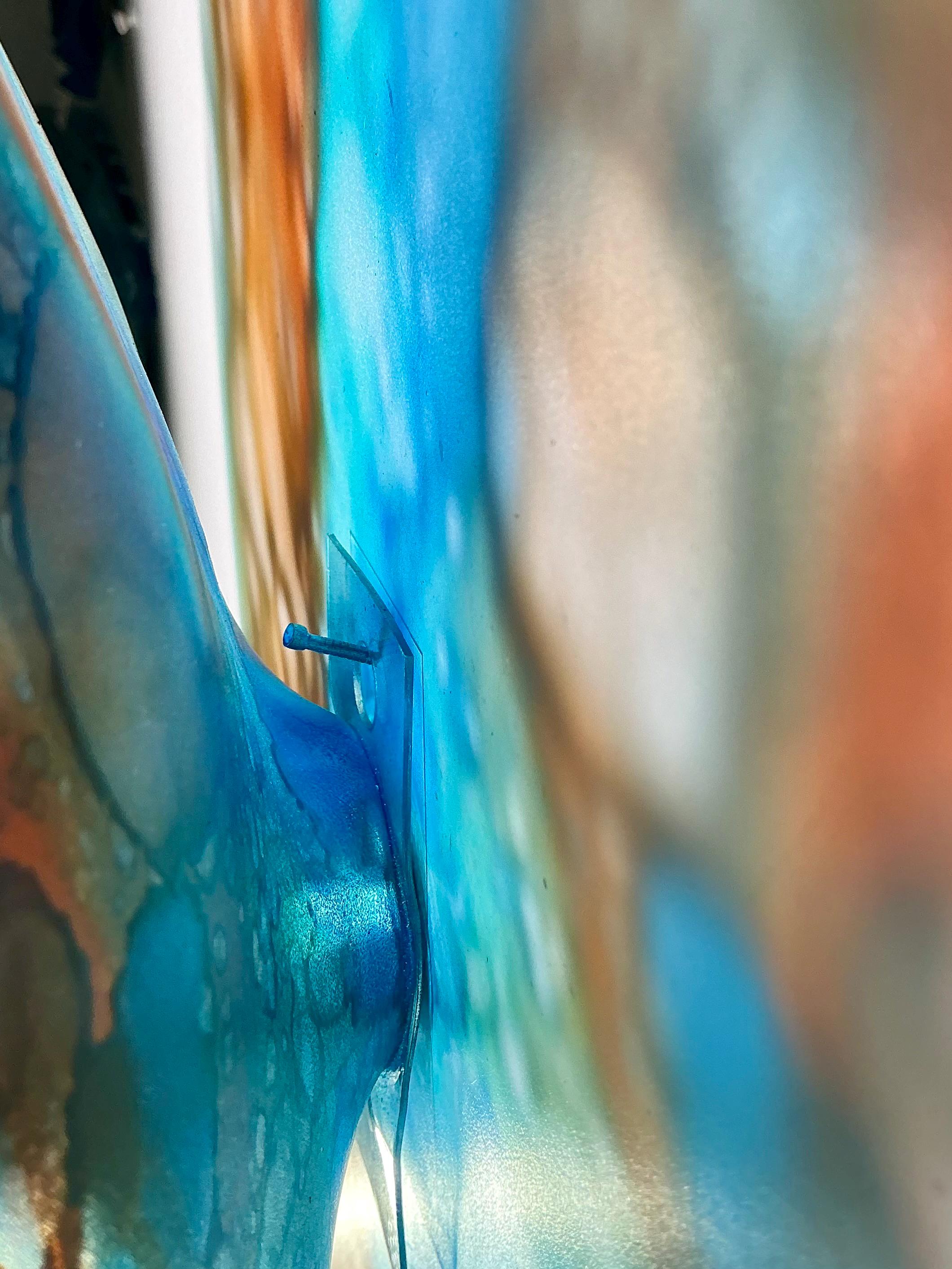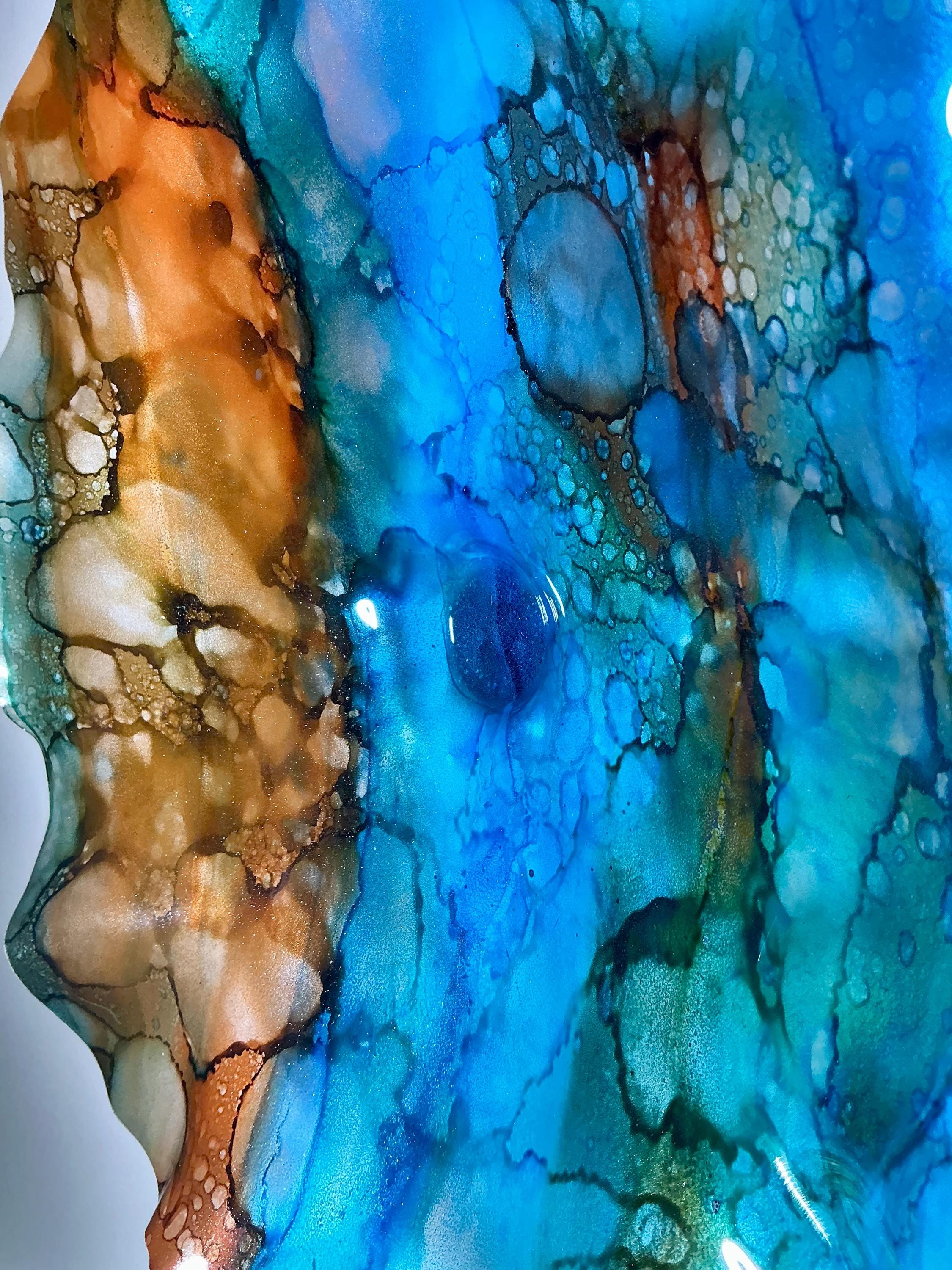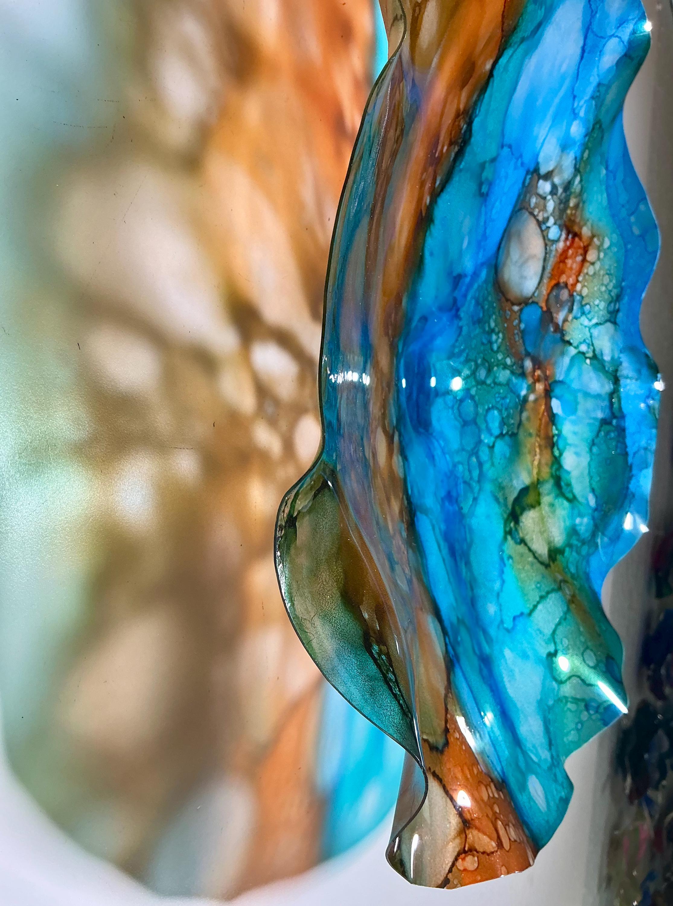 Each collectible piece is unique, no two are alike. This permanent, colorful, eye catching art looks like glass. It shimmers in the light resembling water. They are very DURABLE AND LIGHTWEIGHT. Great for indoor or outdoor decorating.