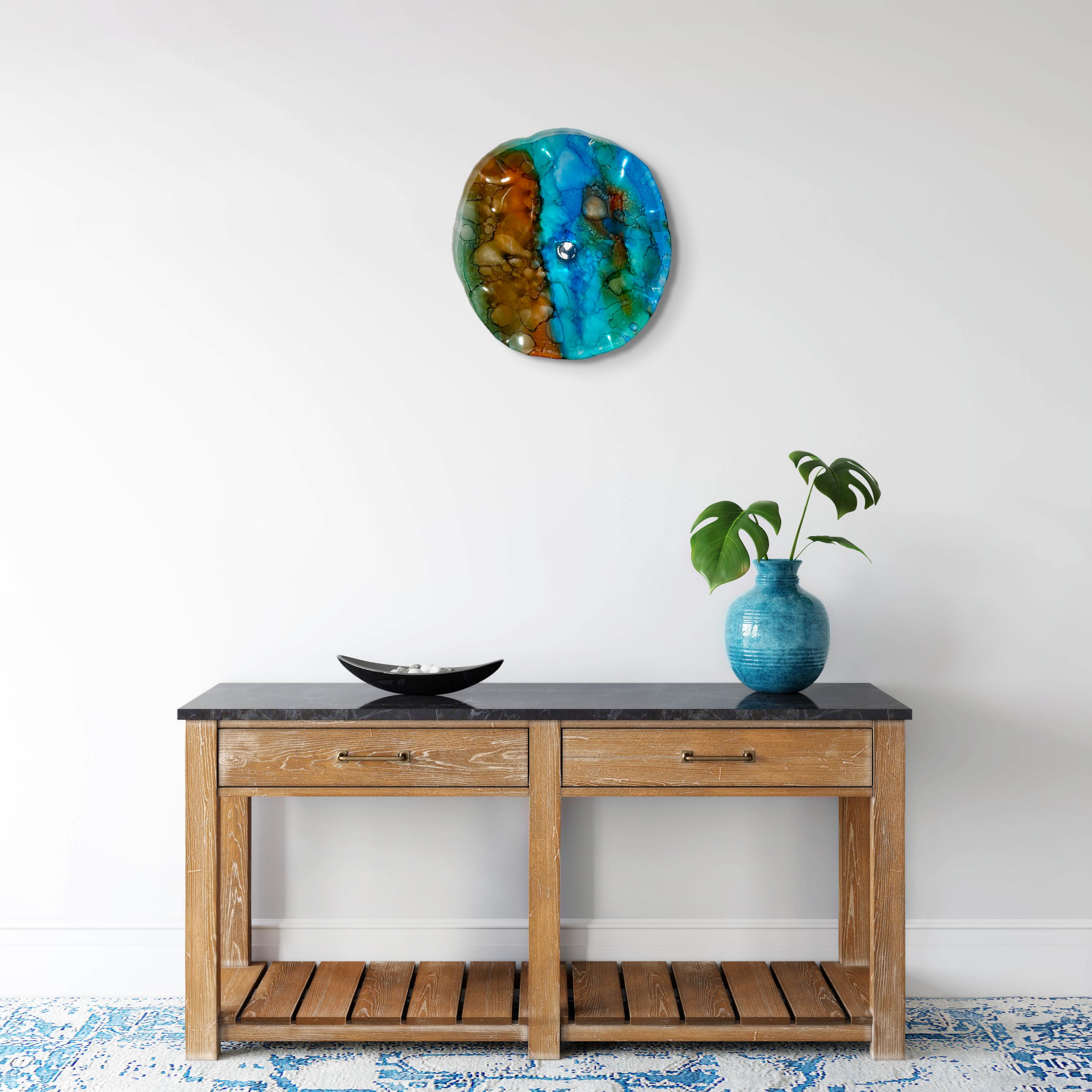 Stunning wall flower sculpture large 15 to 16 inches. Transform your space with our stunning brown, blue, and burnt orange wall art! Crafted from upcycled polymer, this unique piece offers a vibrant touch to your home decor or commercial setting. Its glass-like appearance adds sophistication and charm, making it a conversation starter. Perfect for modern and eclectic interiors, this art piece beautifully blends colors to create an eye-catching focal point. Elevate your environment with this eco-friendly masterpiece!