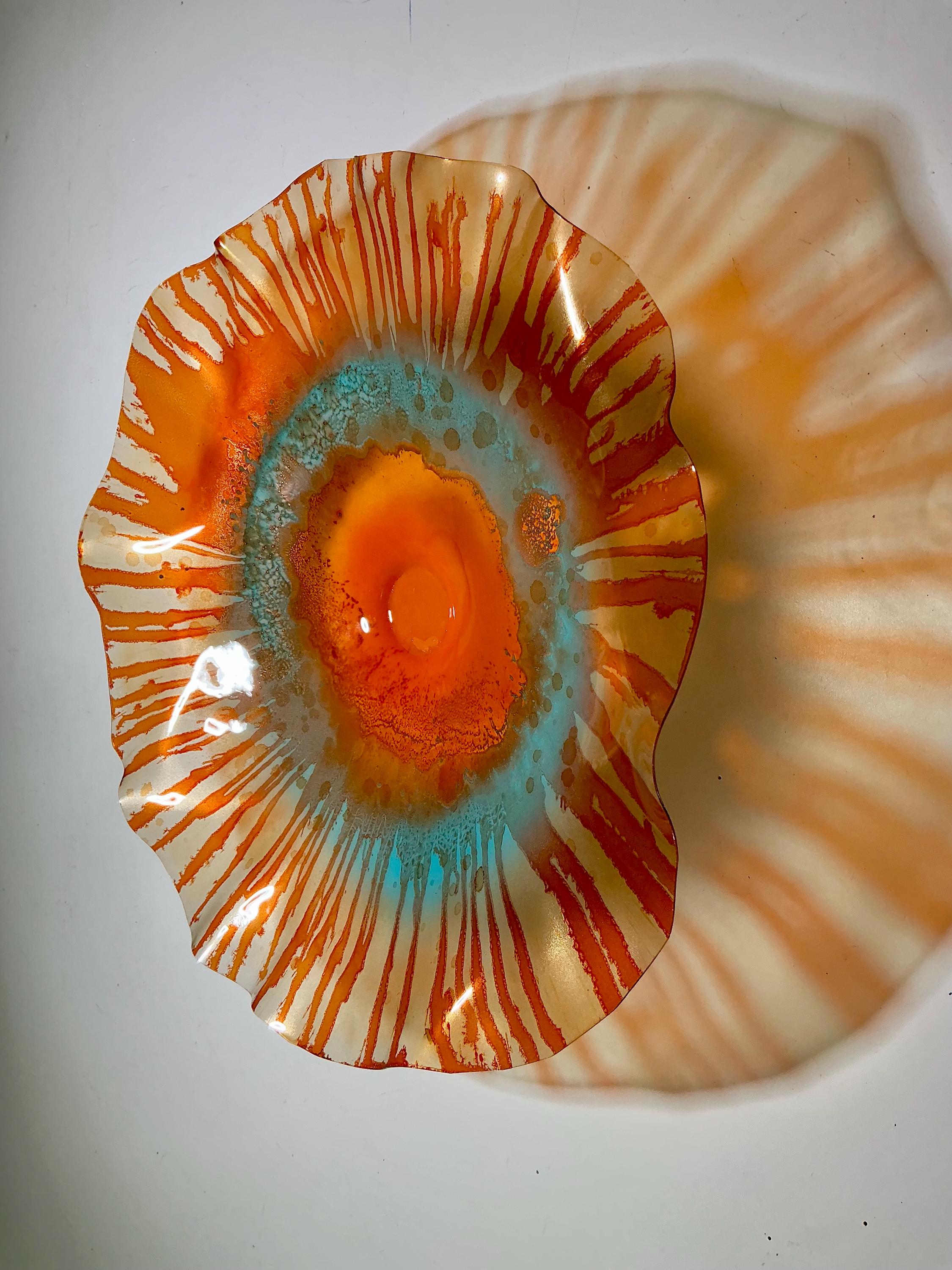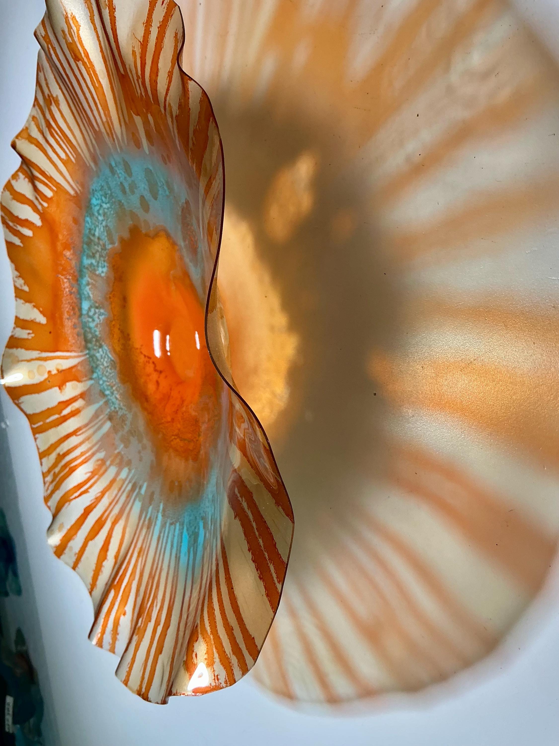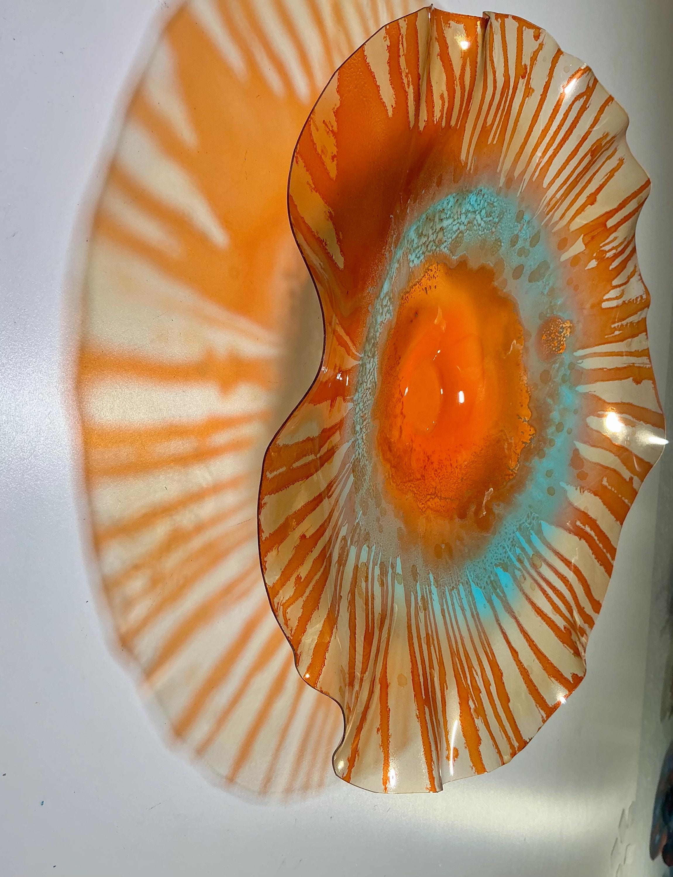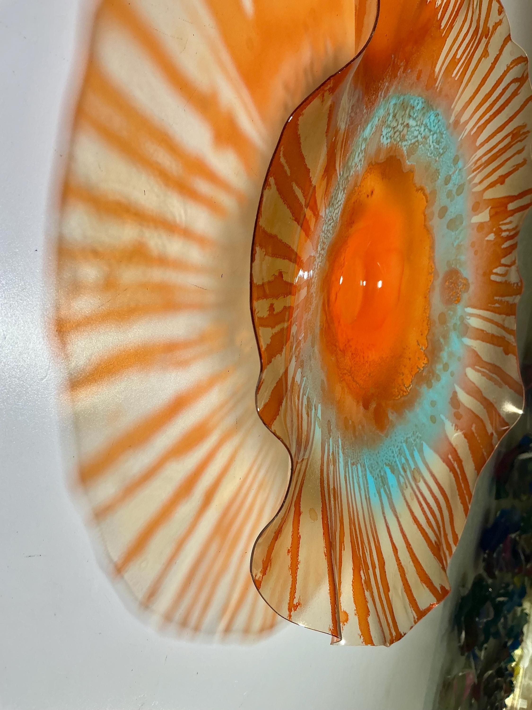 Large Wall flower sculpture. Amazing translucent, orange and aqua blue. large size 15 to 16 inch wide 3 inches deep. The light filters through casting a colorful effect on the hanging surface.
