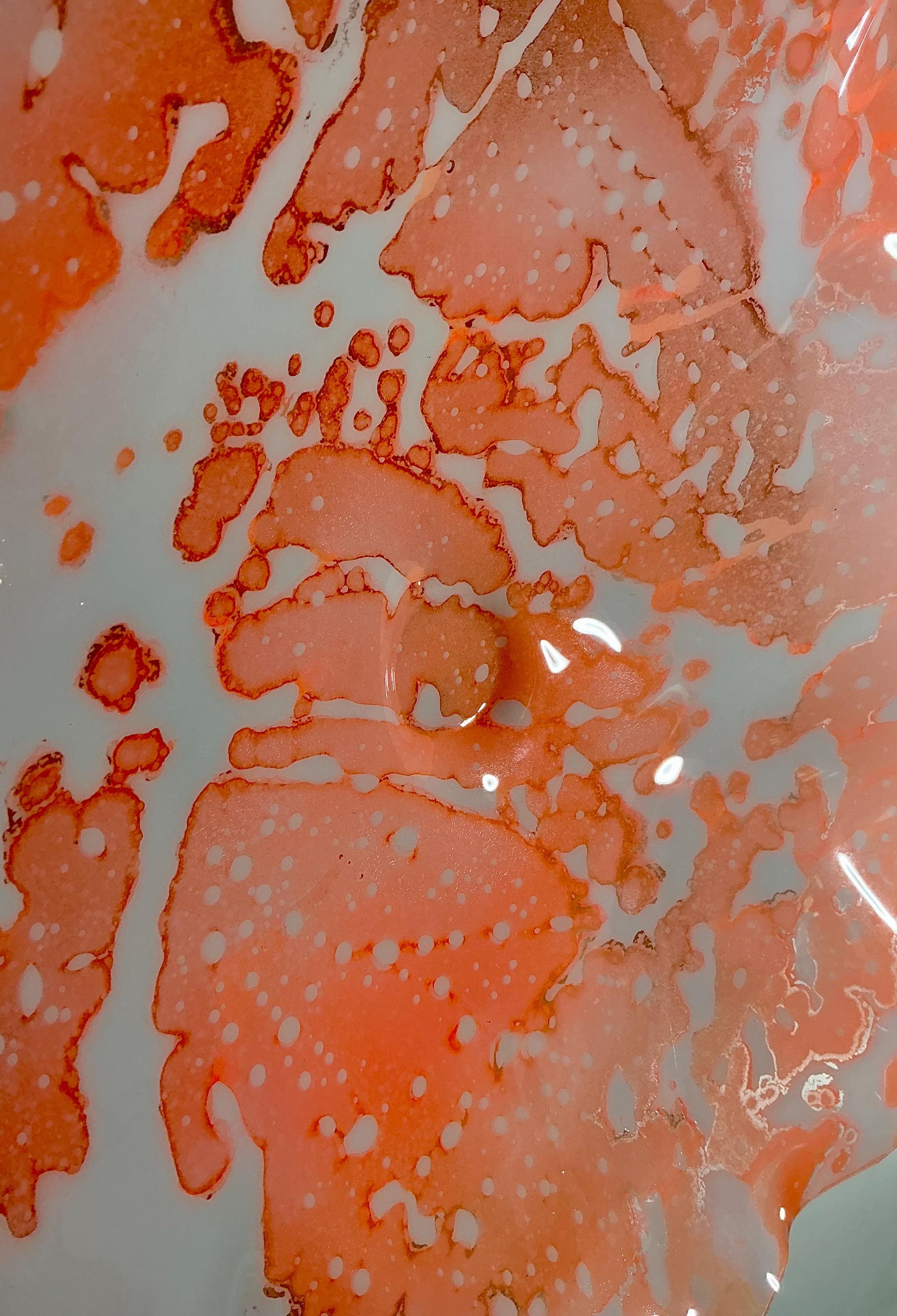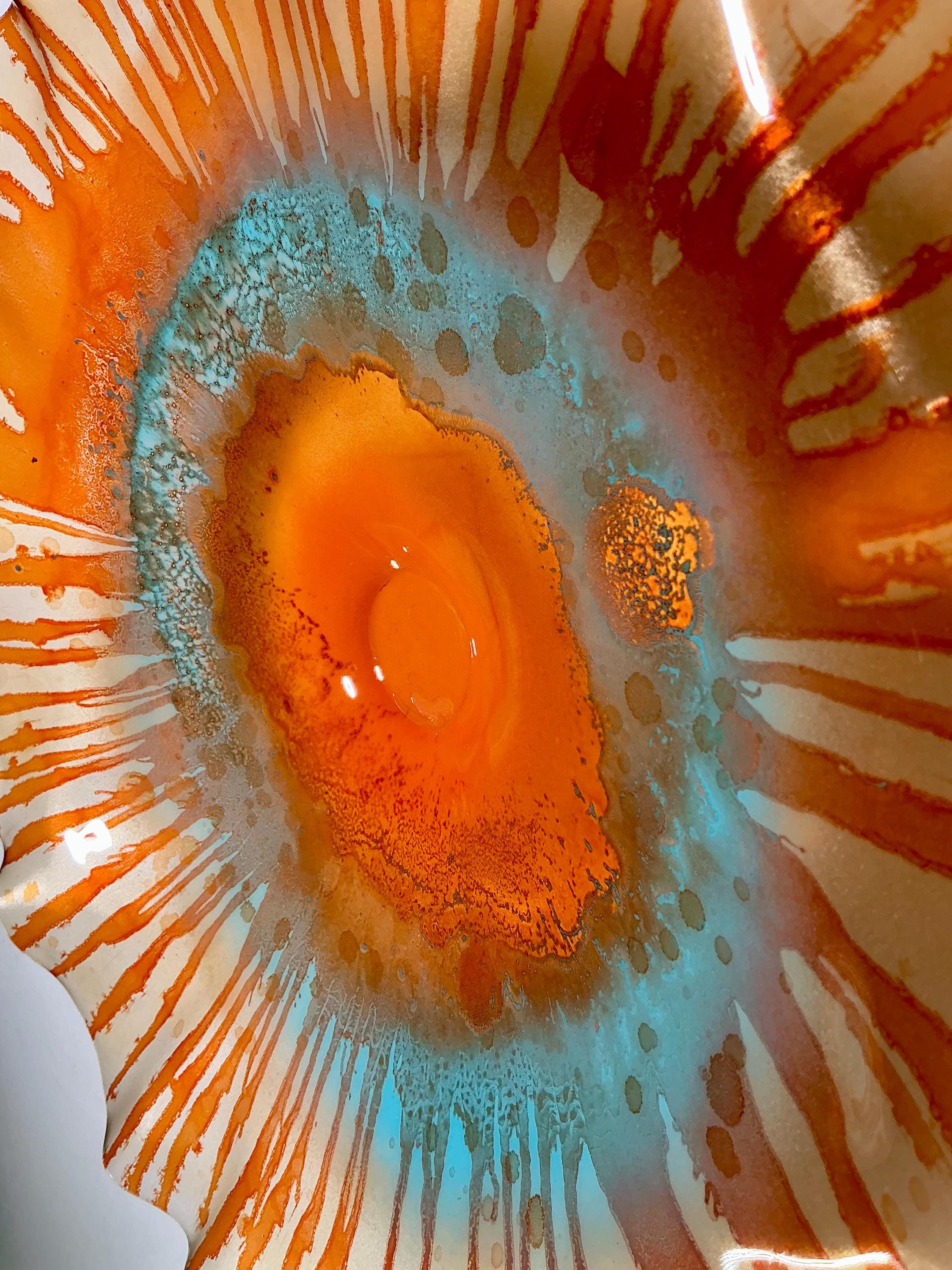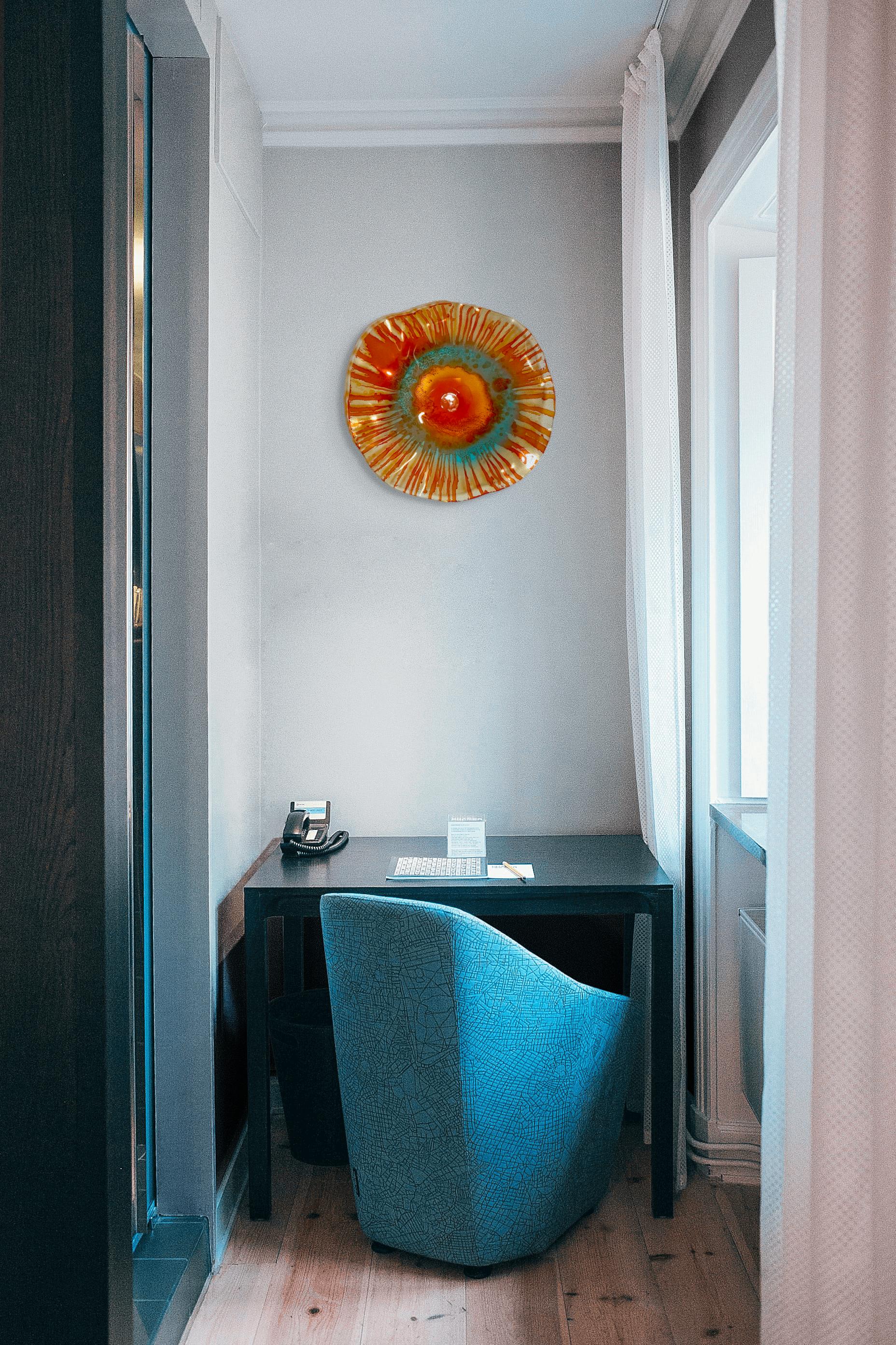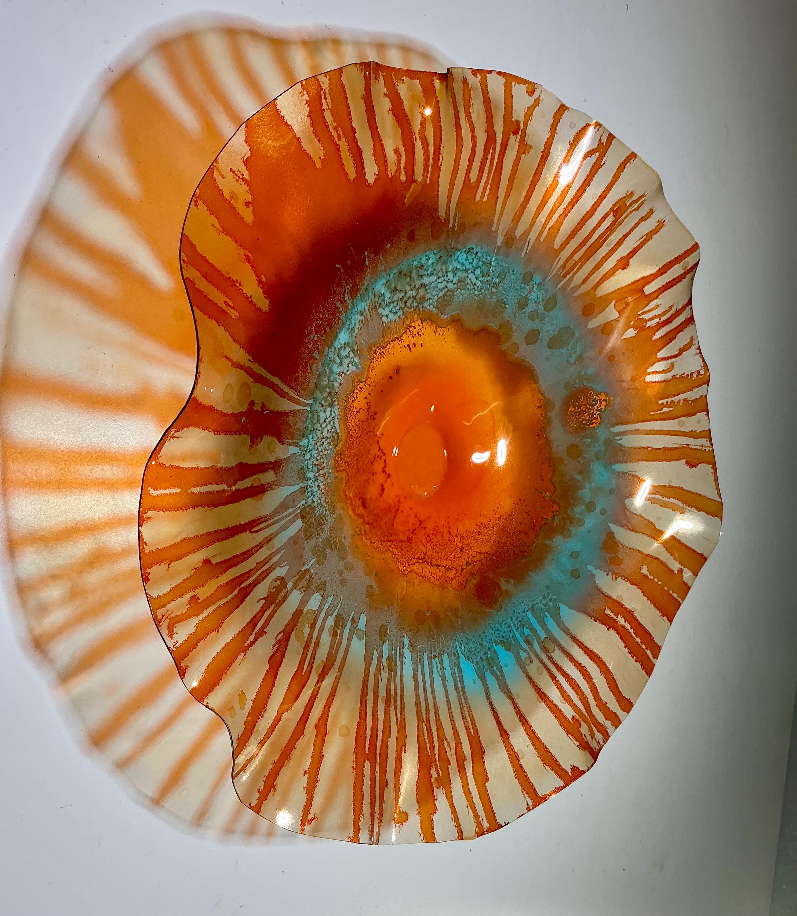 Large Wall flower sculpture. Amazing translucent, orange and aqua blue. large size 15 to 16 inch wide 3 inches deep. The light filters through casting a colorful effect on the hanging surface.
