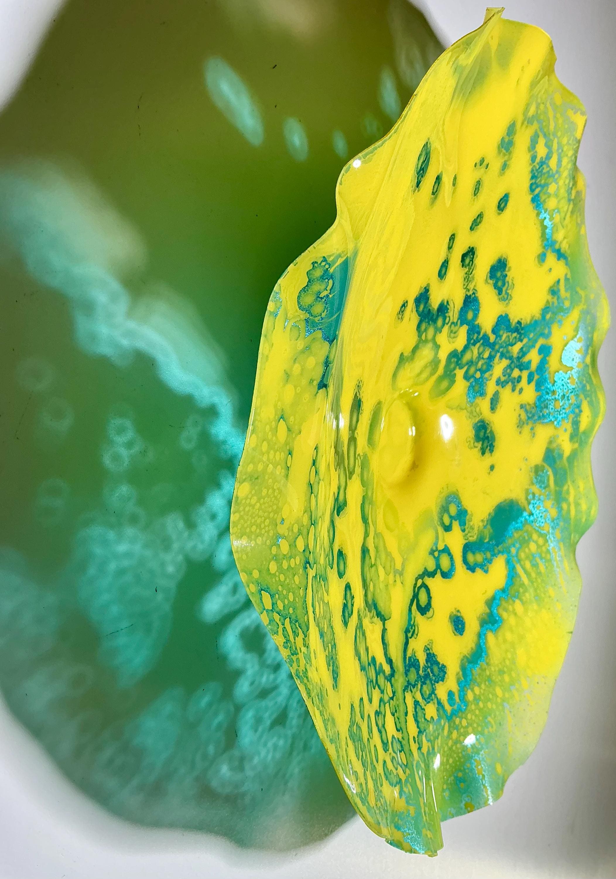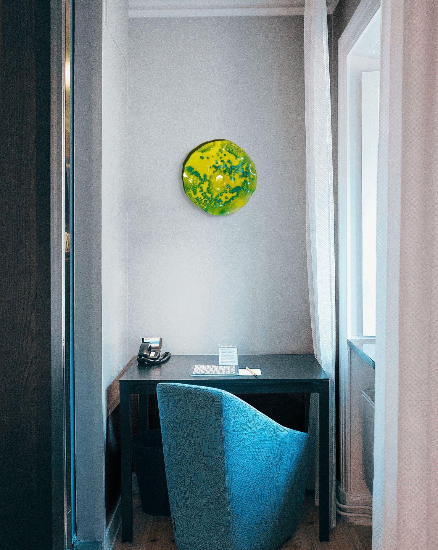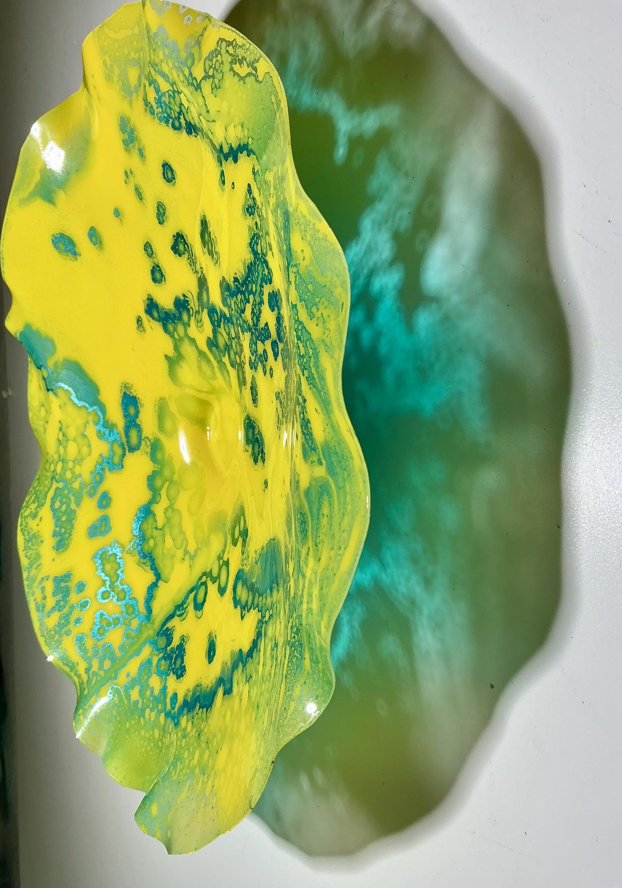 Radiant wall flower vibrant and colorful yellow with metallic teal blue. The light filters through casting a colorful glow to the hanging surface.