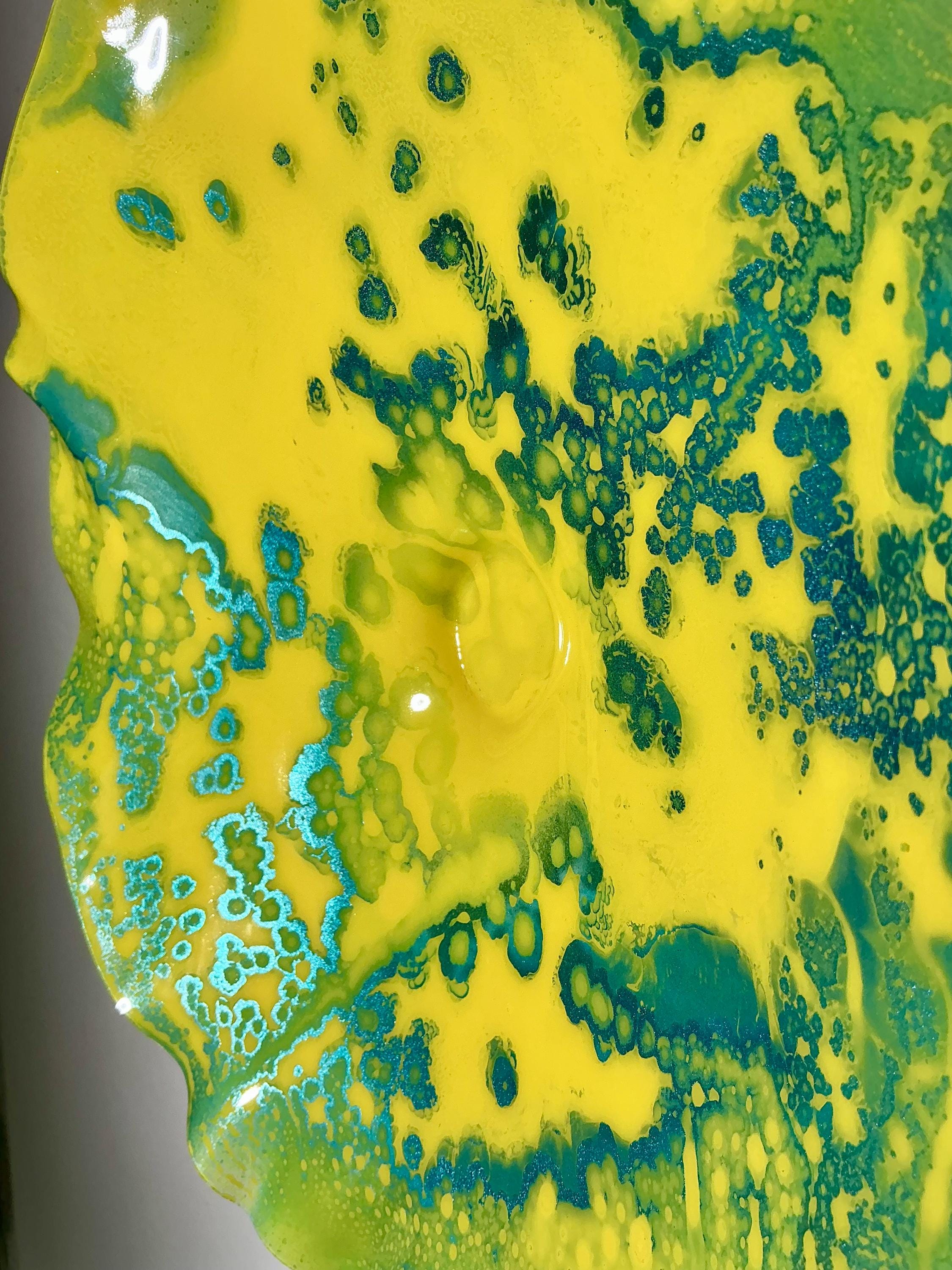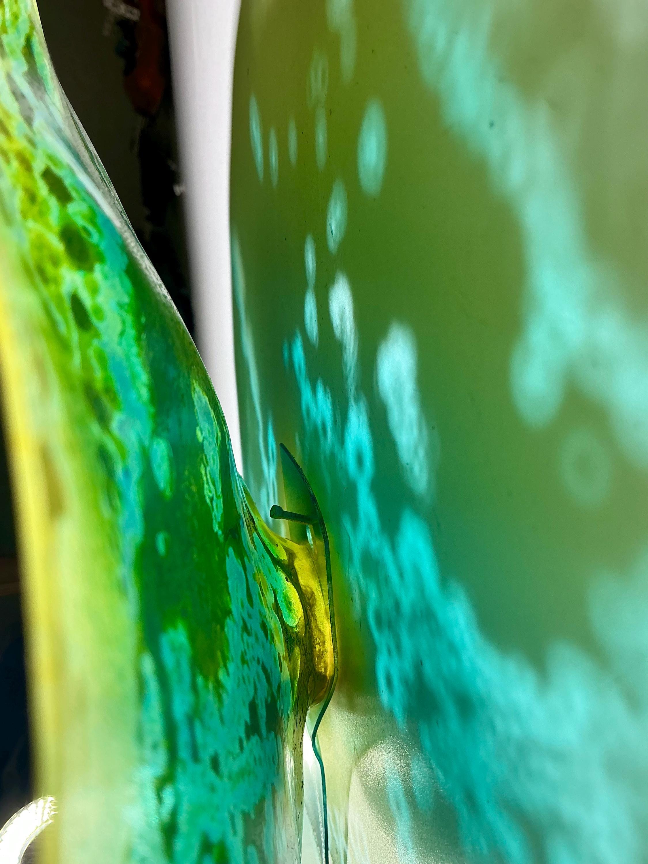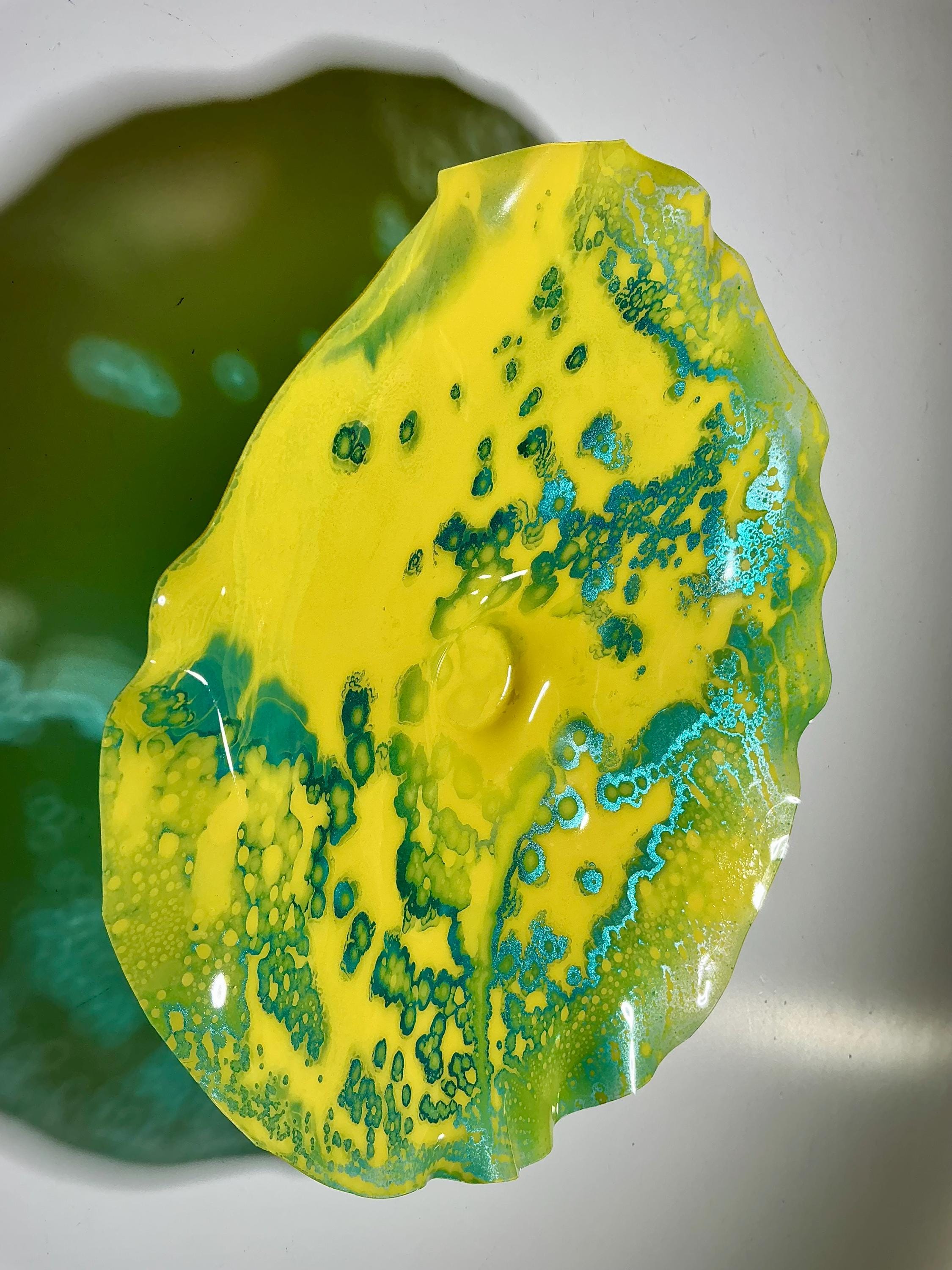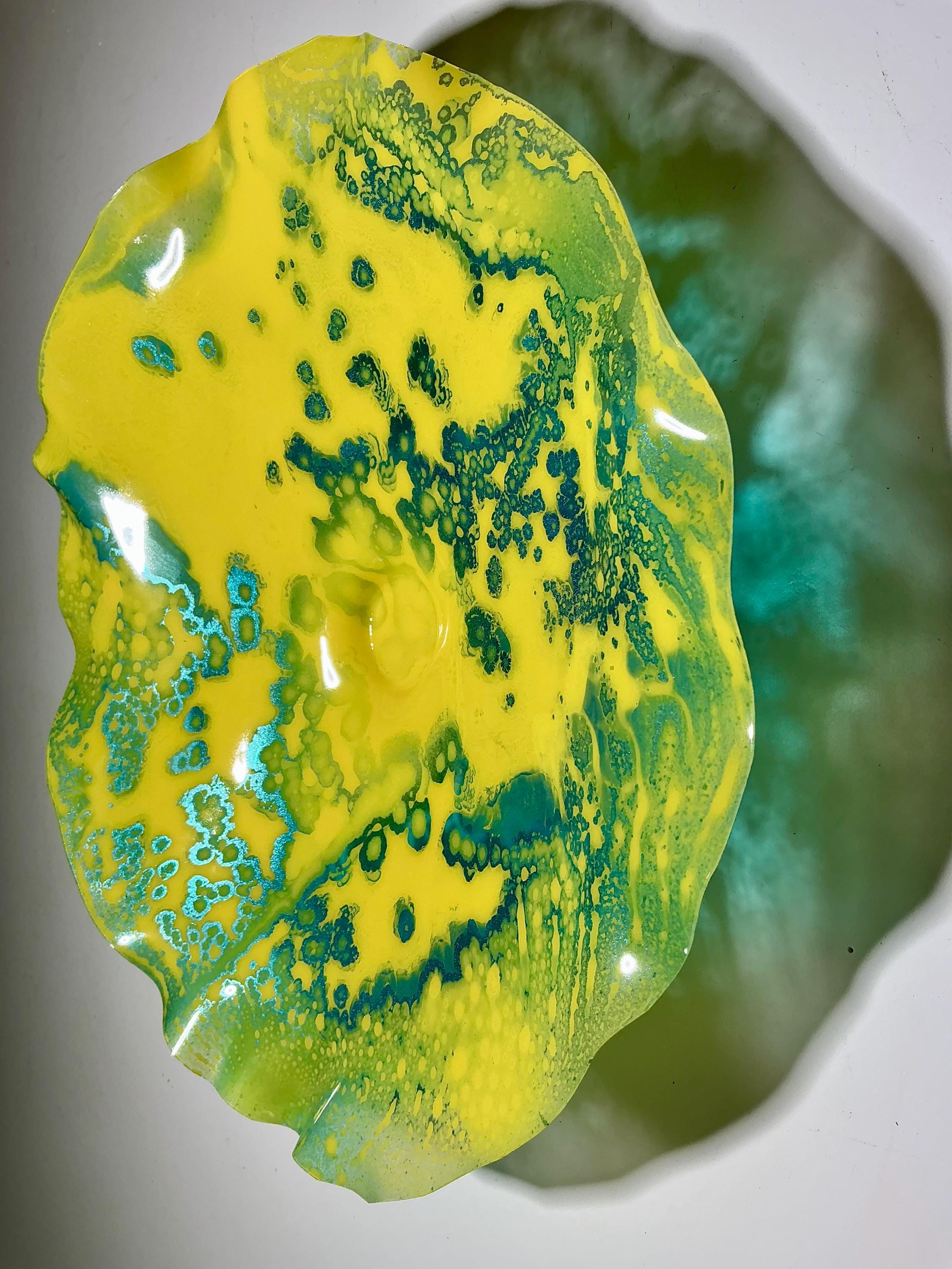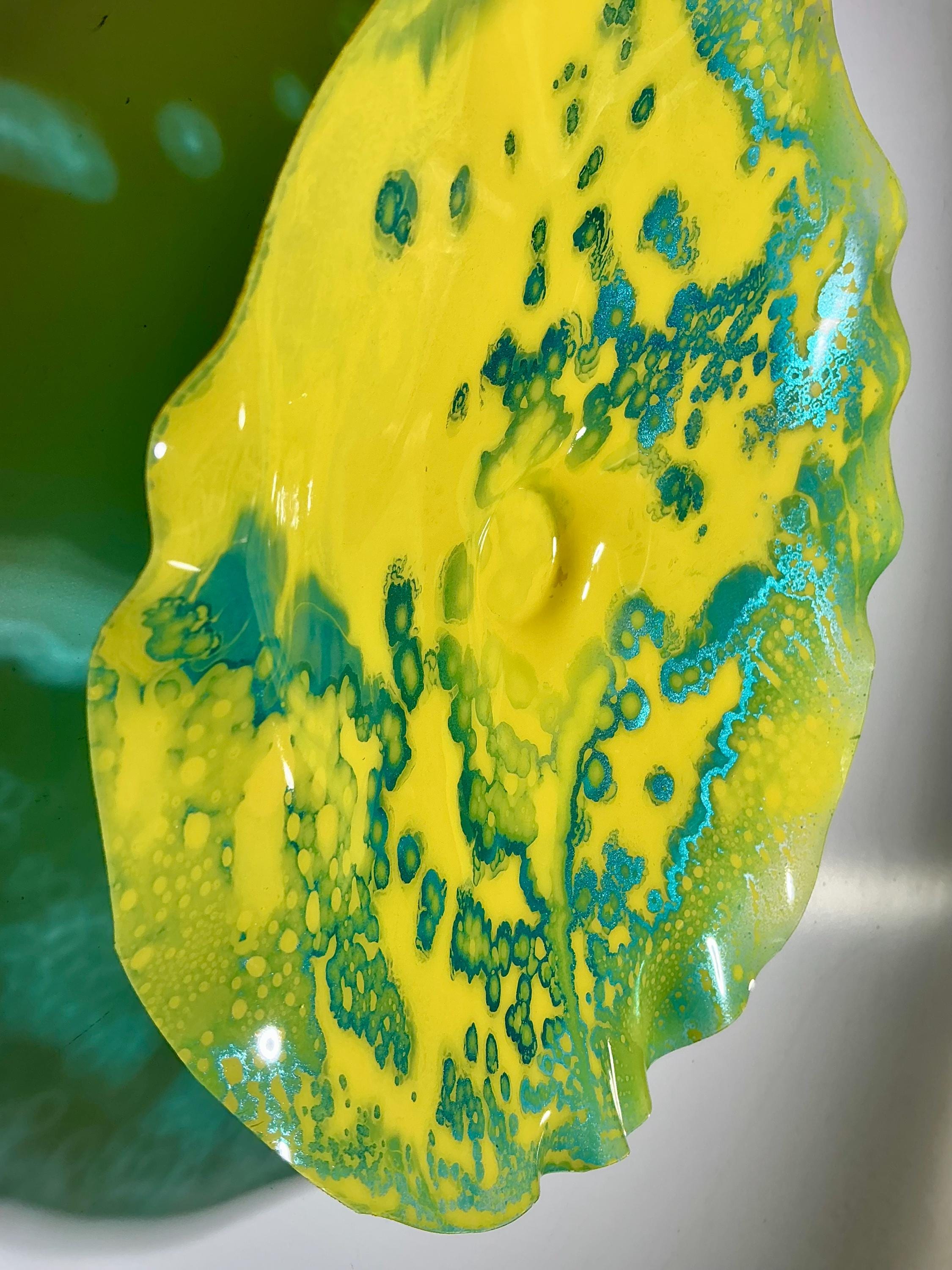Each collectible piece is unique, no two are alike. This permanent, colorful, eye catching art looks and feels like glass. It shimmers in the light resembling water. They are very DURABLE AND LIGHTWEIGHT. This flower is easy to hang all weather and UV resistant. Great for indoor or outdoor decorating.