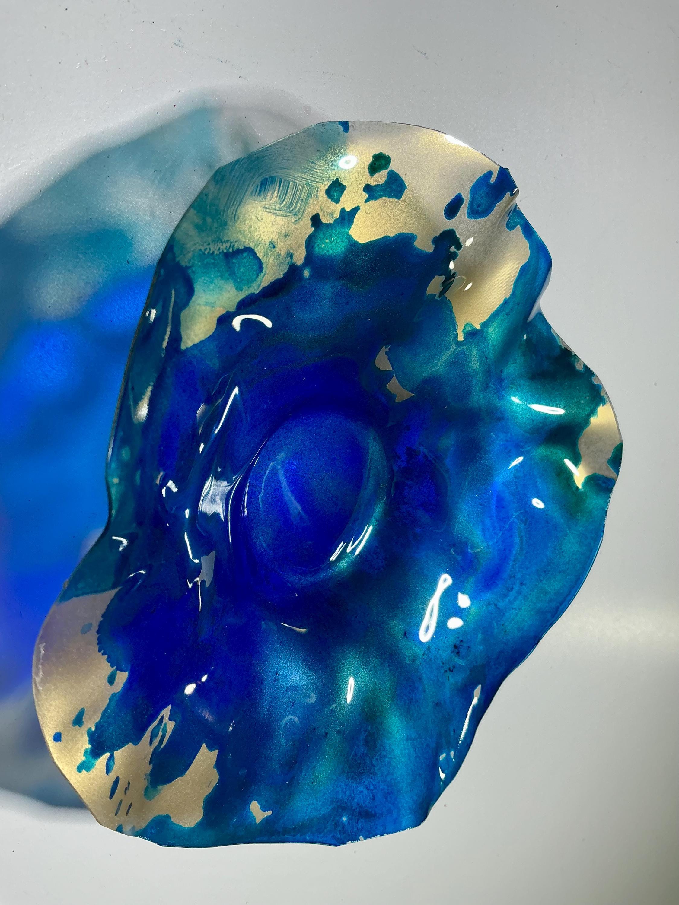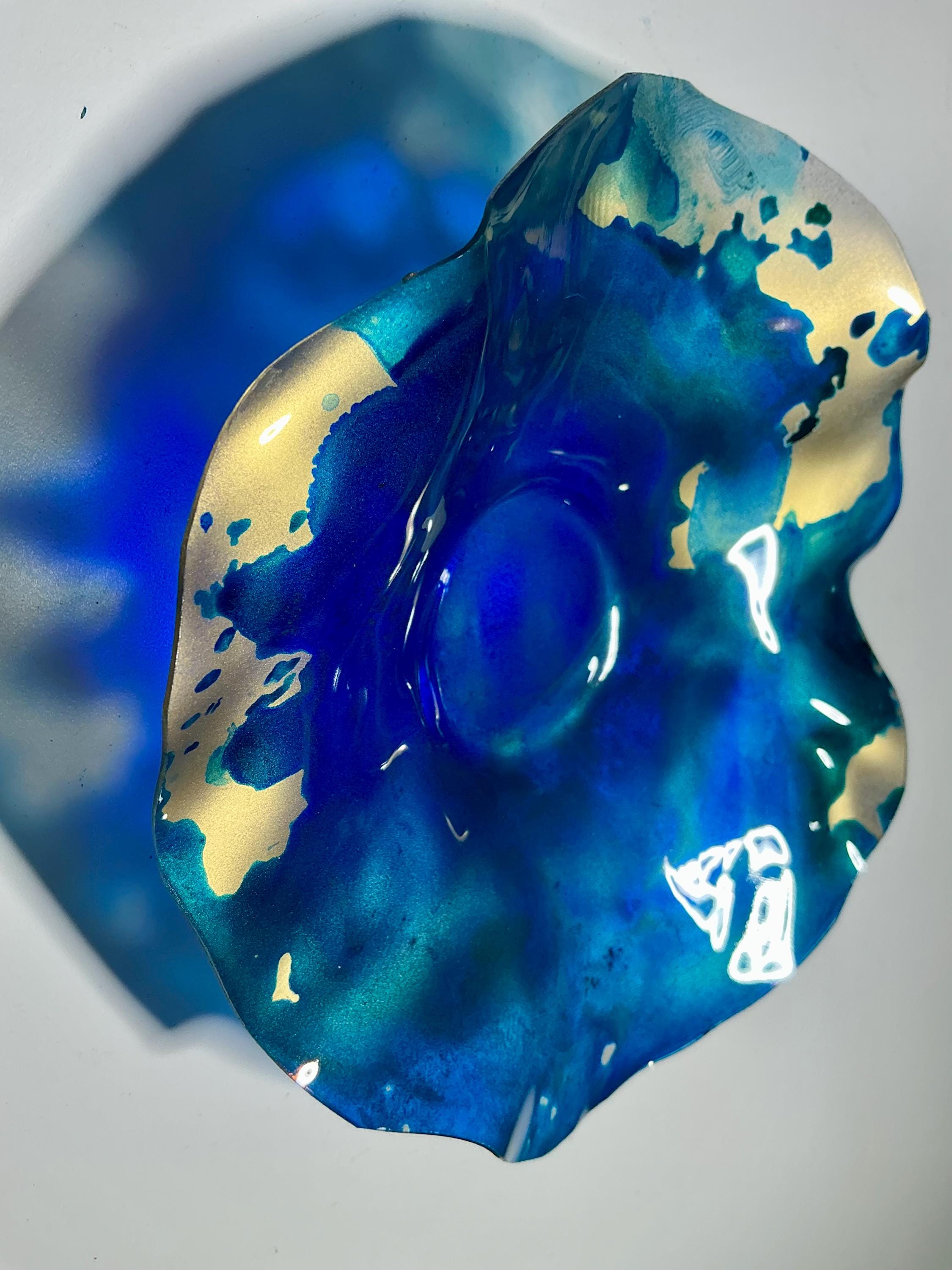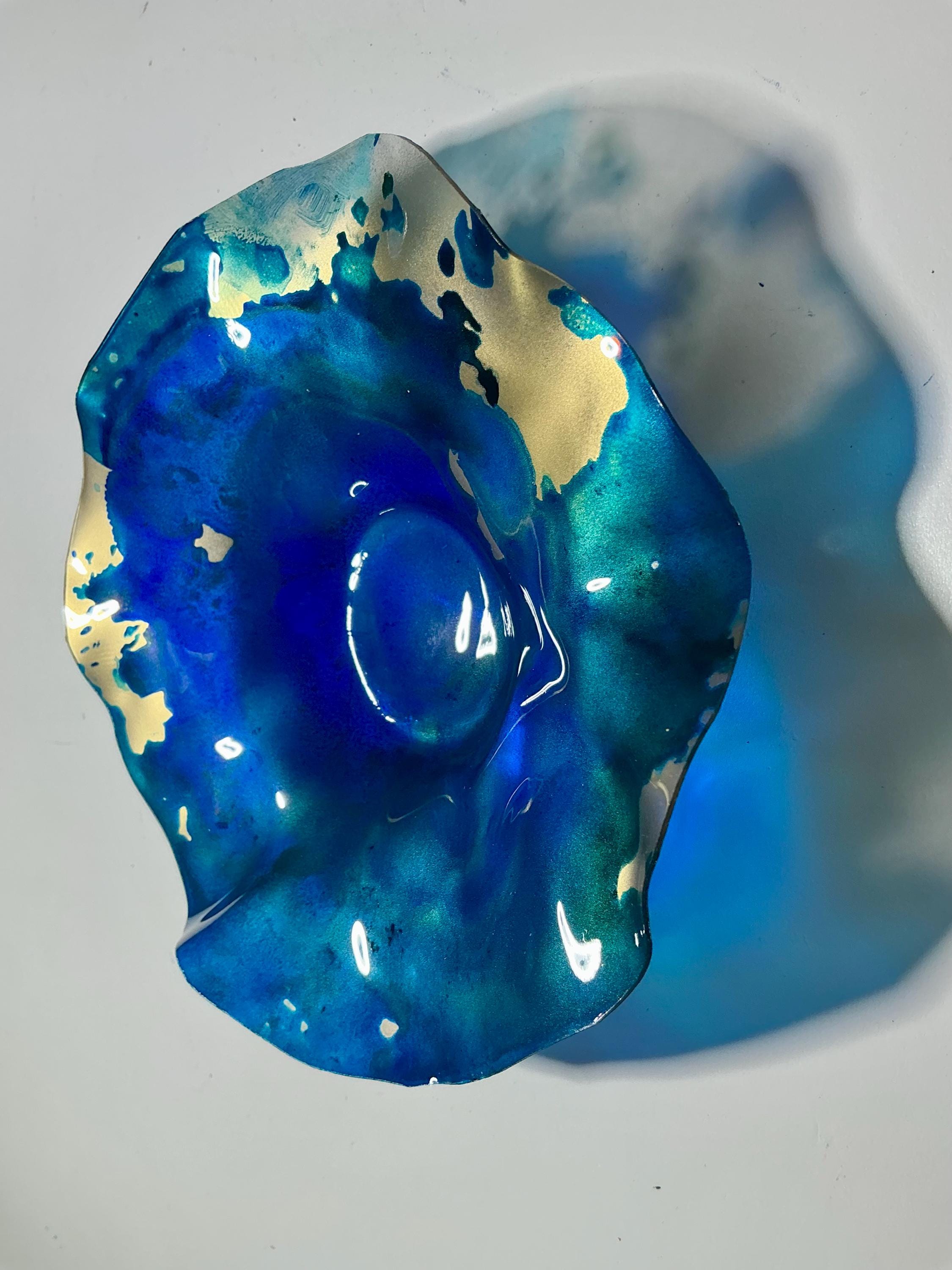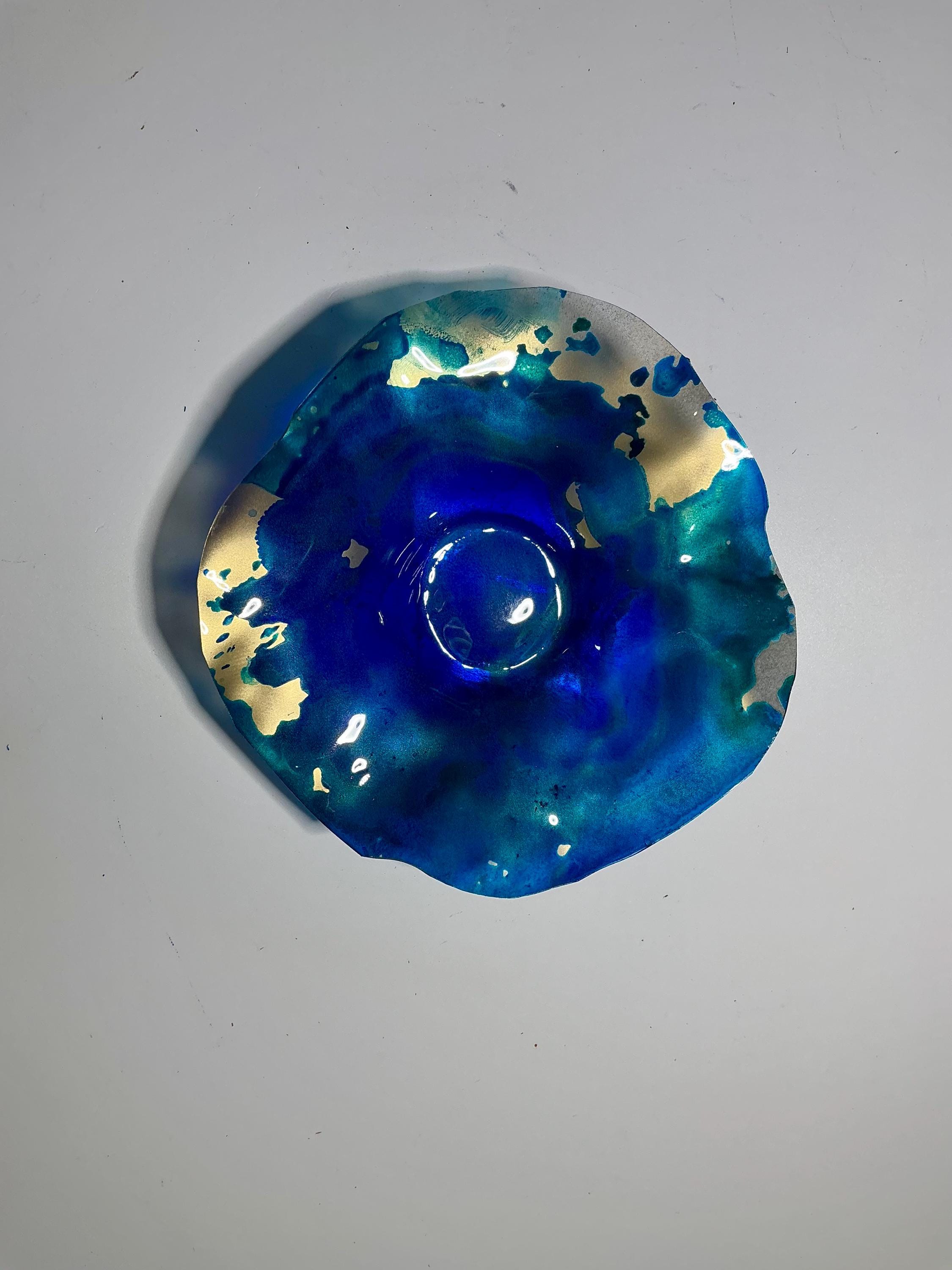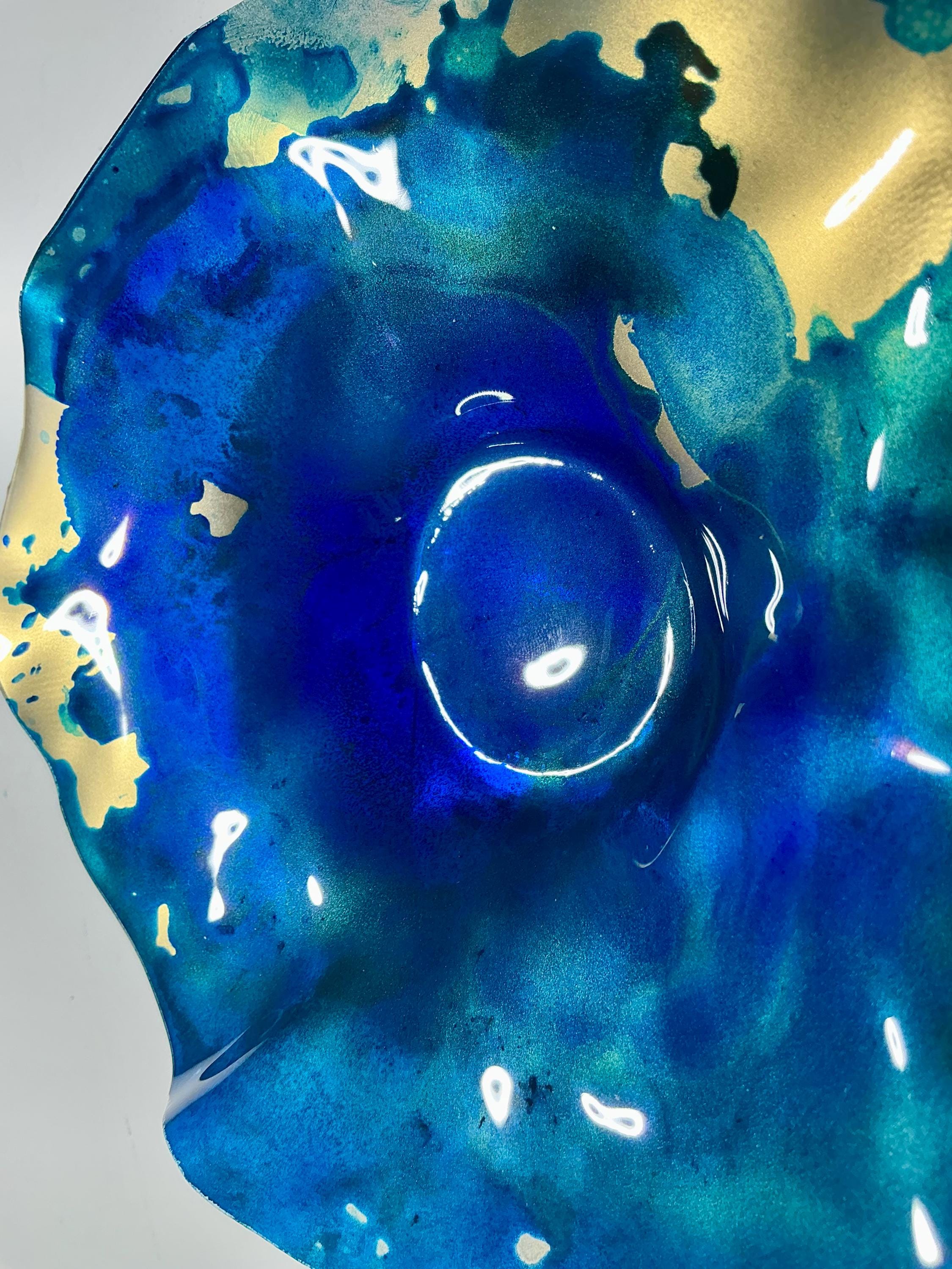 Eye catching wall platter colorful cobalt blue and gold. The light filters through casting a colorful glow to the hanging surface.