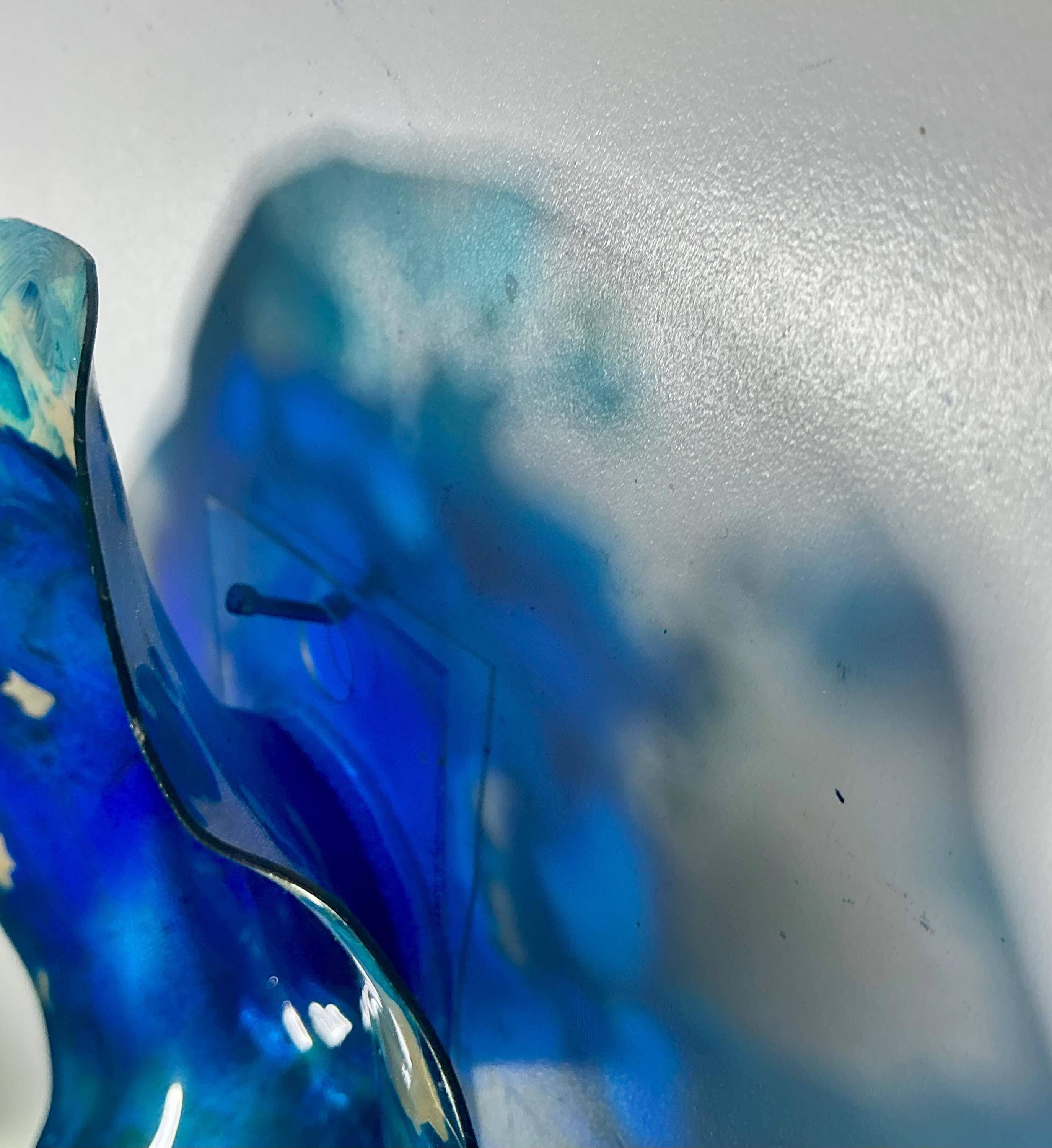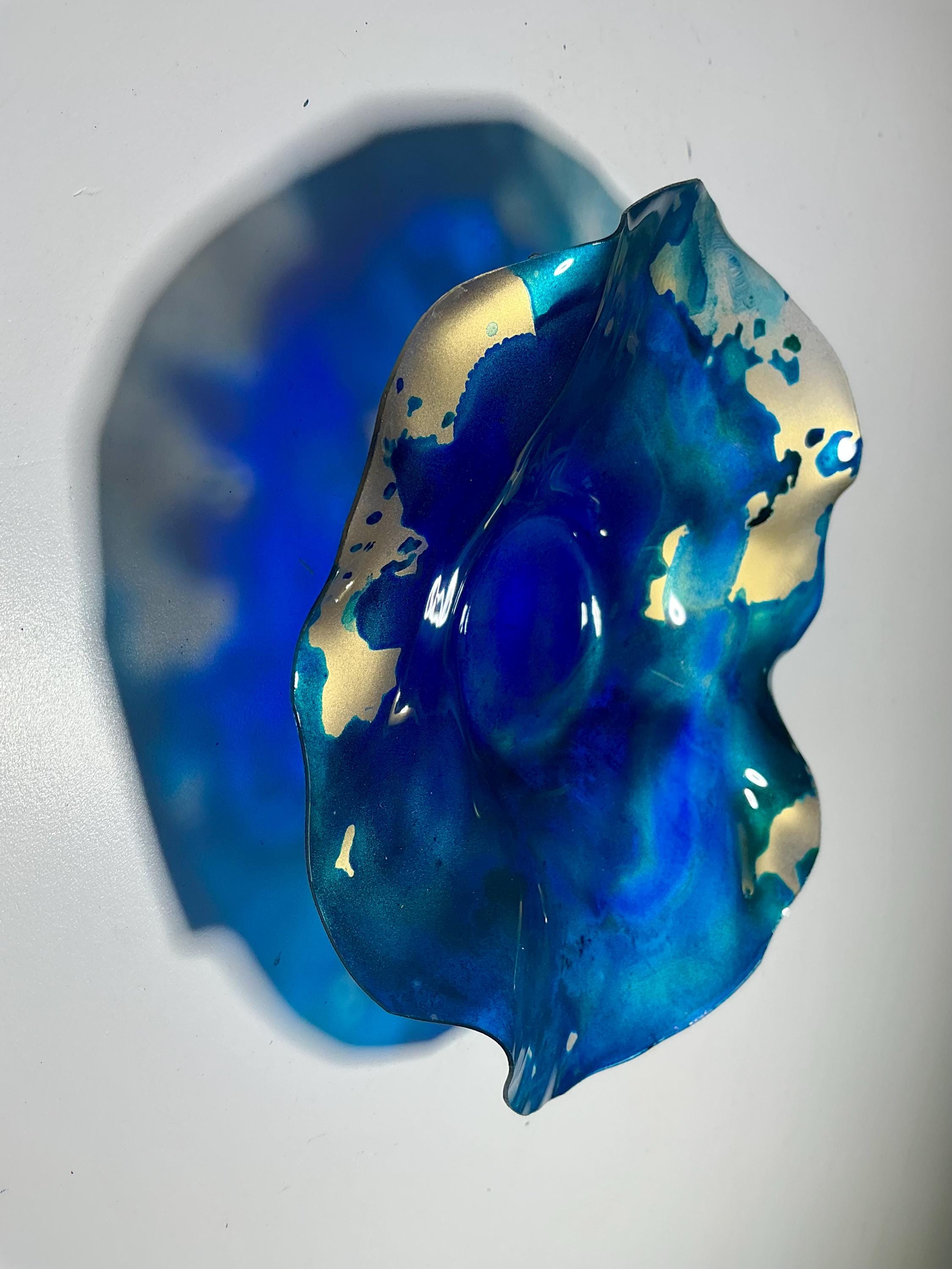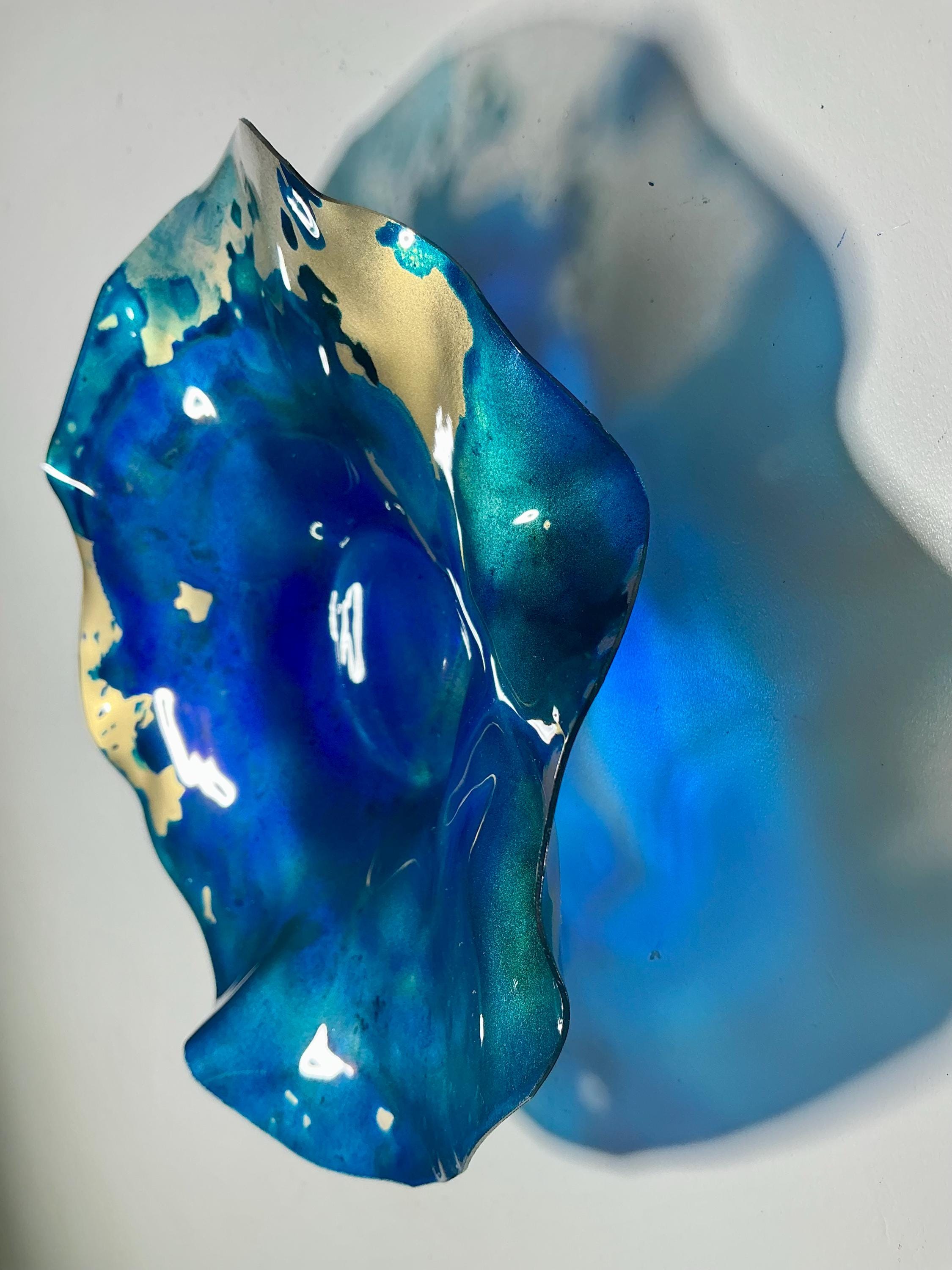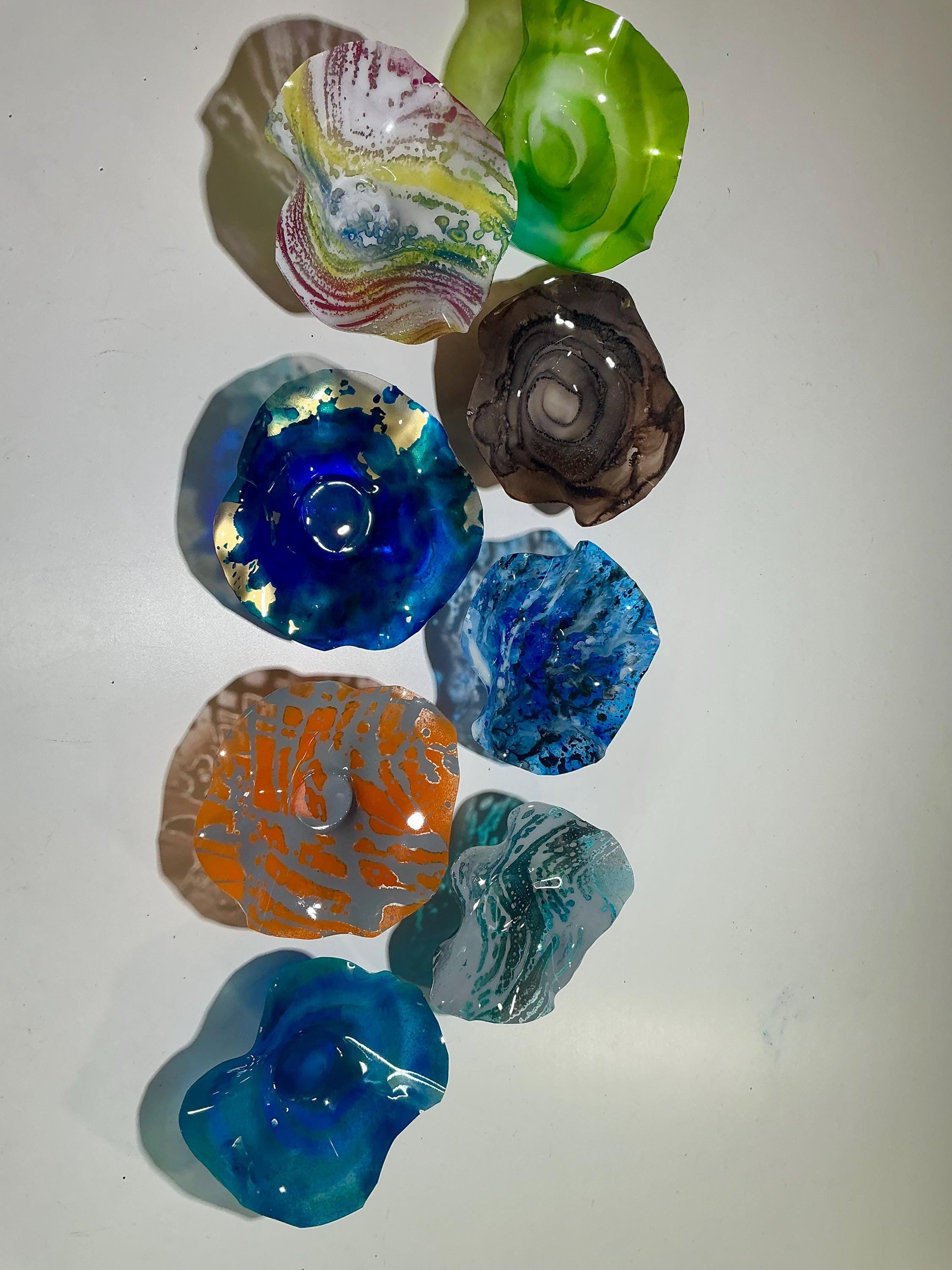 Each collectible piece is unique, no two are alike. This permanent, colorful, eye catching art looks and feels like glass. It shimmers in the light resembling water. They are very DURABLE AND LIGHTWEIGHT. These flowers are easy to hang, are all weather and UV resistant. Great for indoor or outdoor decorating.