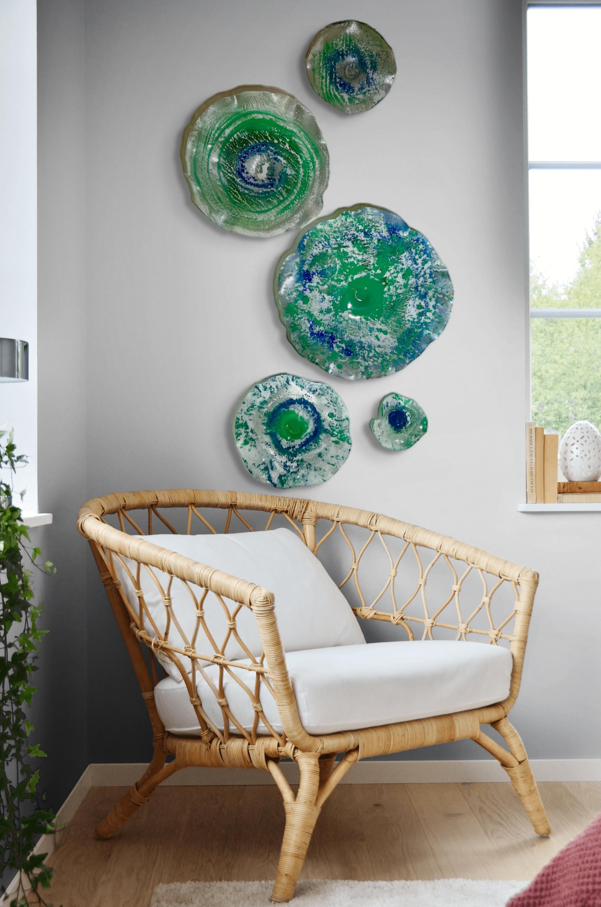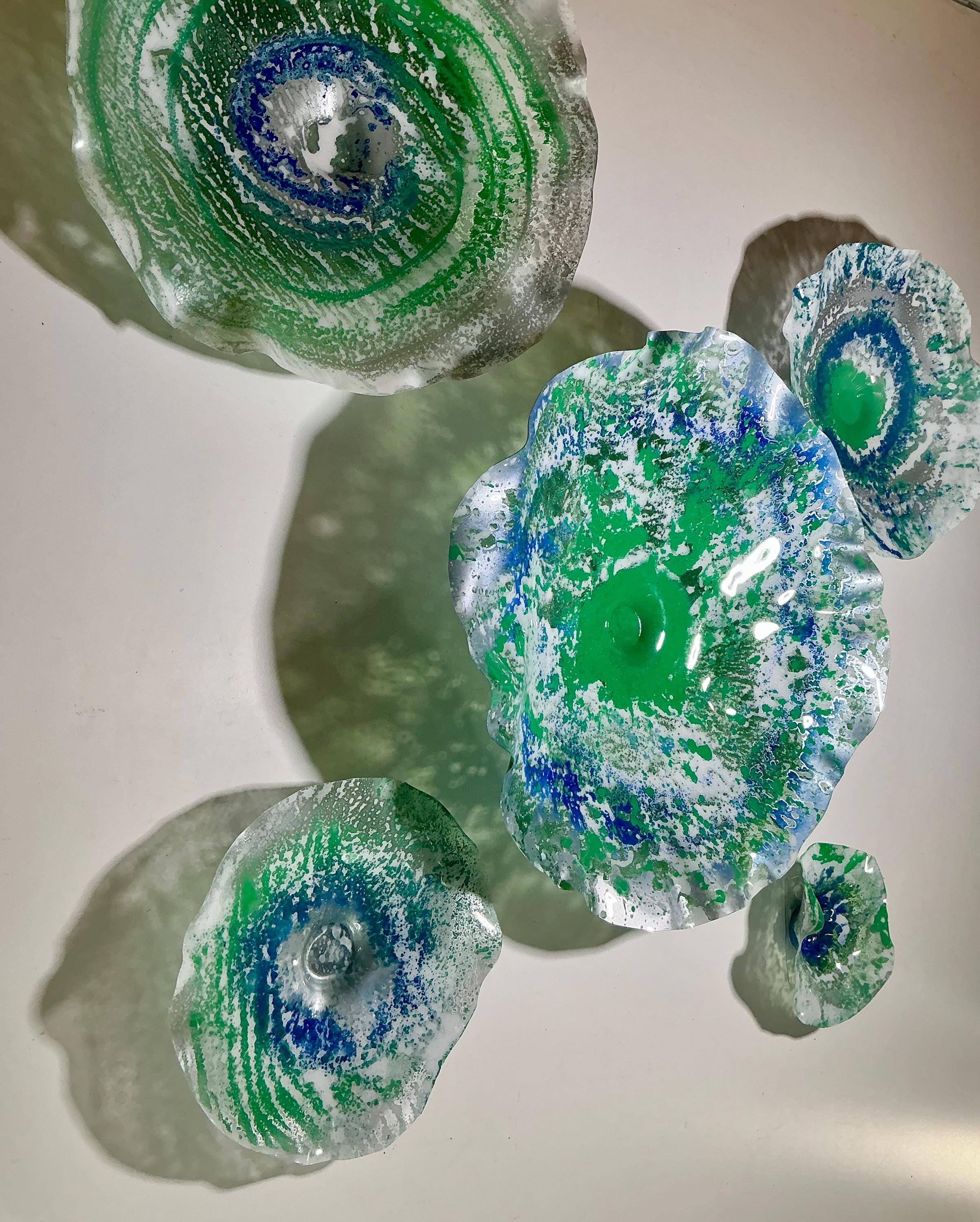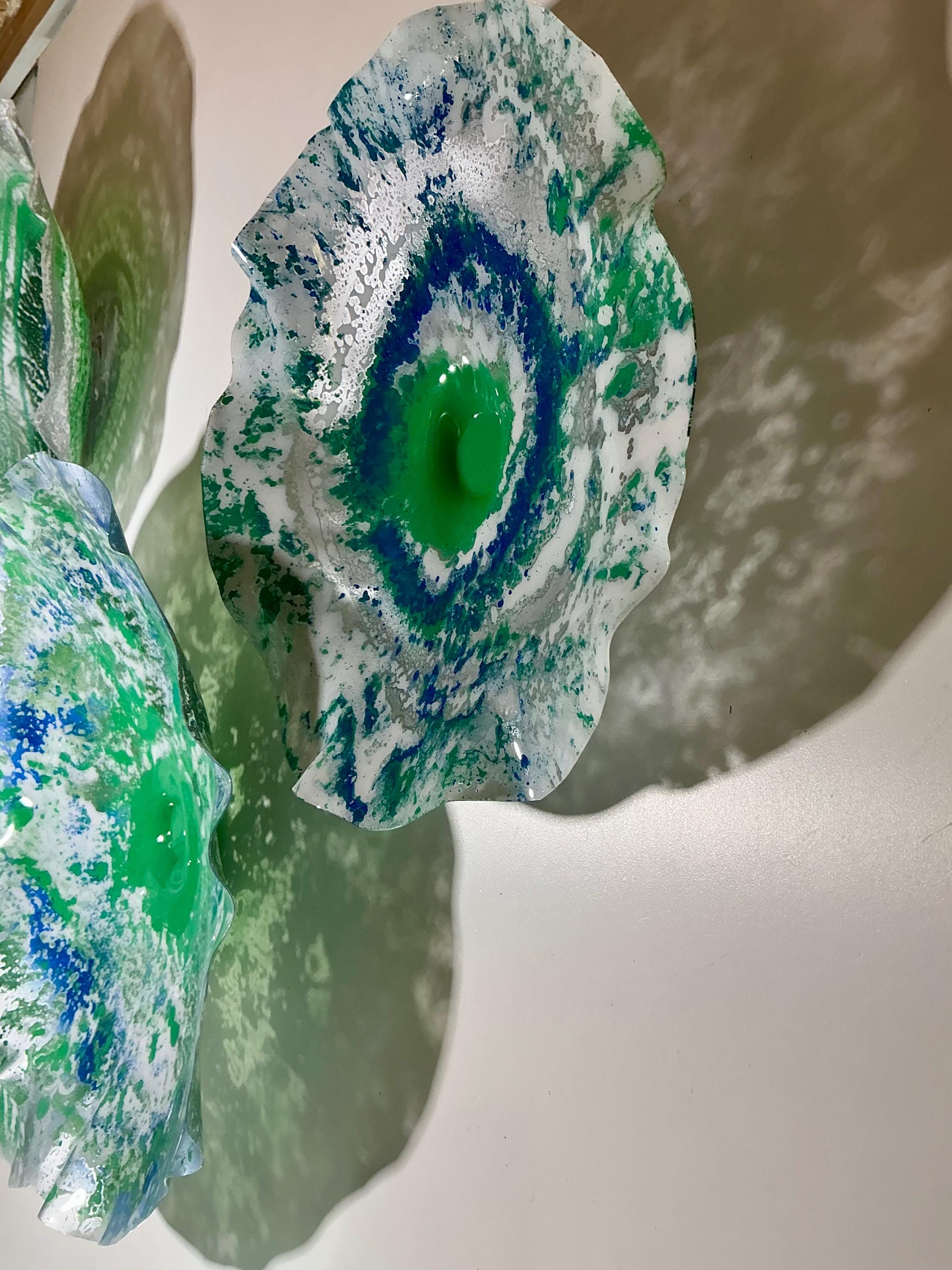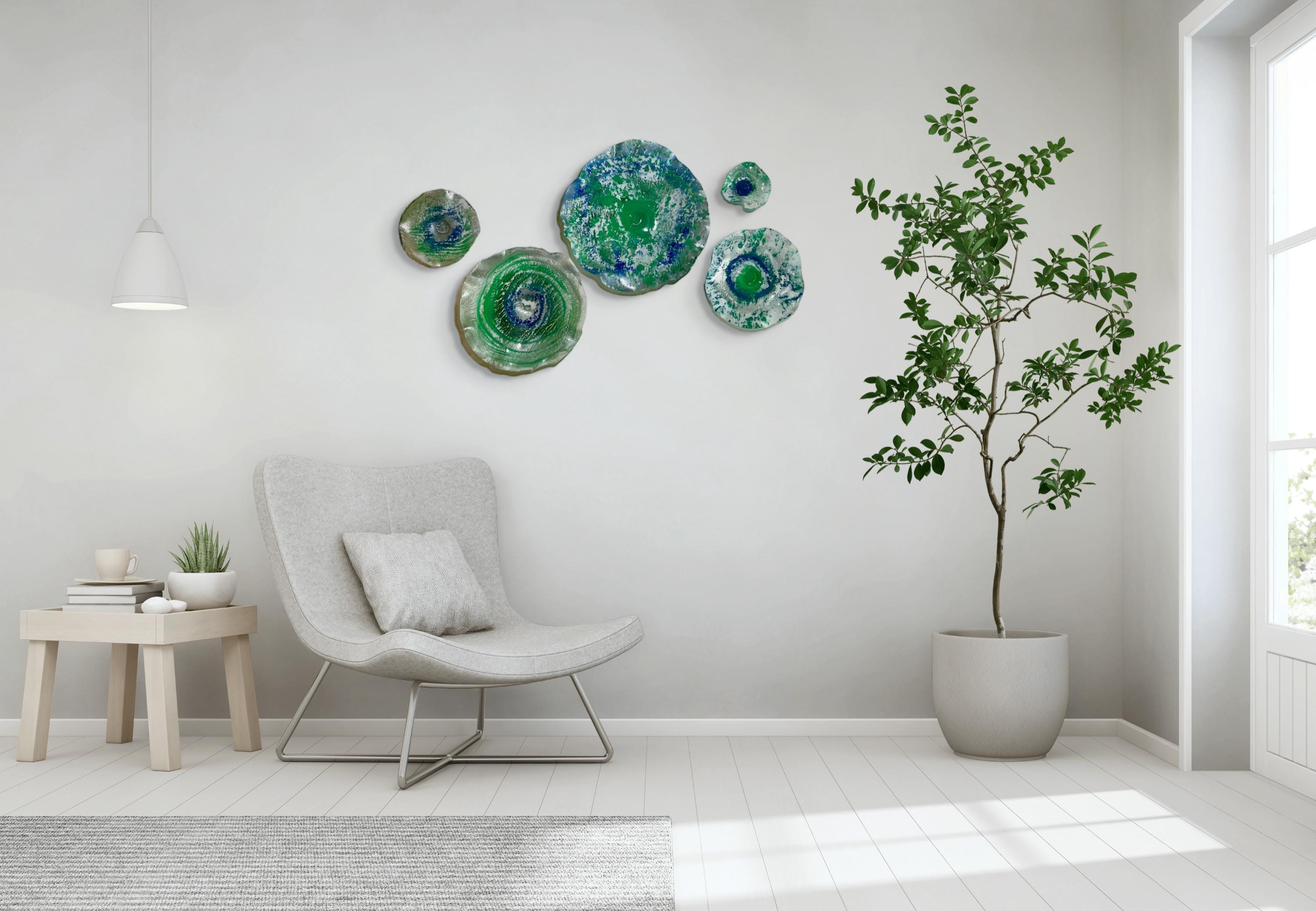 Transform your space with this unique Set of Five Wall Murals, showcasing stunning shades of green, silver, blue, and white. Handmade from upcycled polymer, each piece embodies a beachy decor vibe, making them perfect for adding a touch of coastal charm to any interior. These one-of-a-kind murals are not just art; they're easy to hang and will surely be a conversation starter. Elevate your home decor with this eco-friendly, artistic statement today!