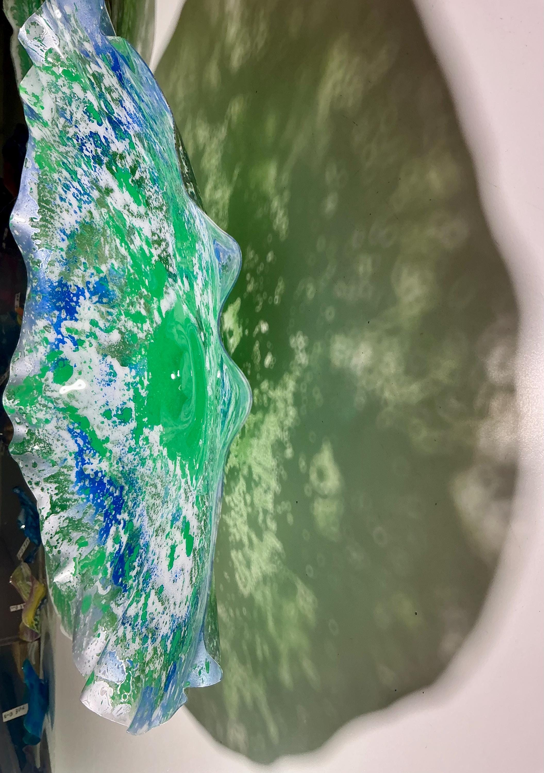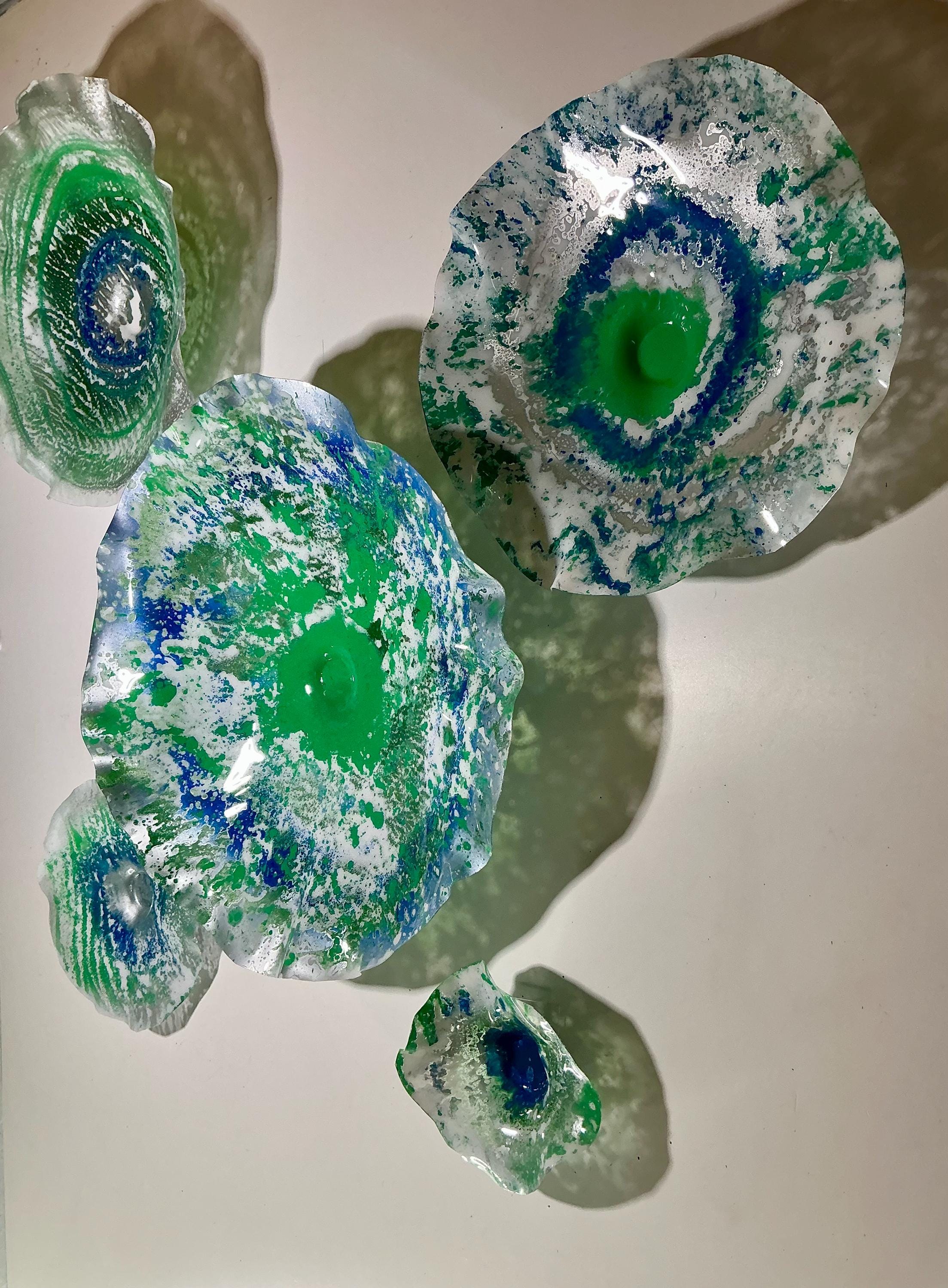 Each collectible piece is unique, no two are alike. This permanent, colorful, eye catching art looks and feels like glass. They shimmer in the light resembling water. They are very DURABLE AND LIGHTWEIGHT . These flowers are easy to hang, are all weather and UV resistant. Great for indoor or outdoor decorating.