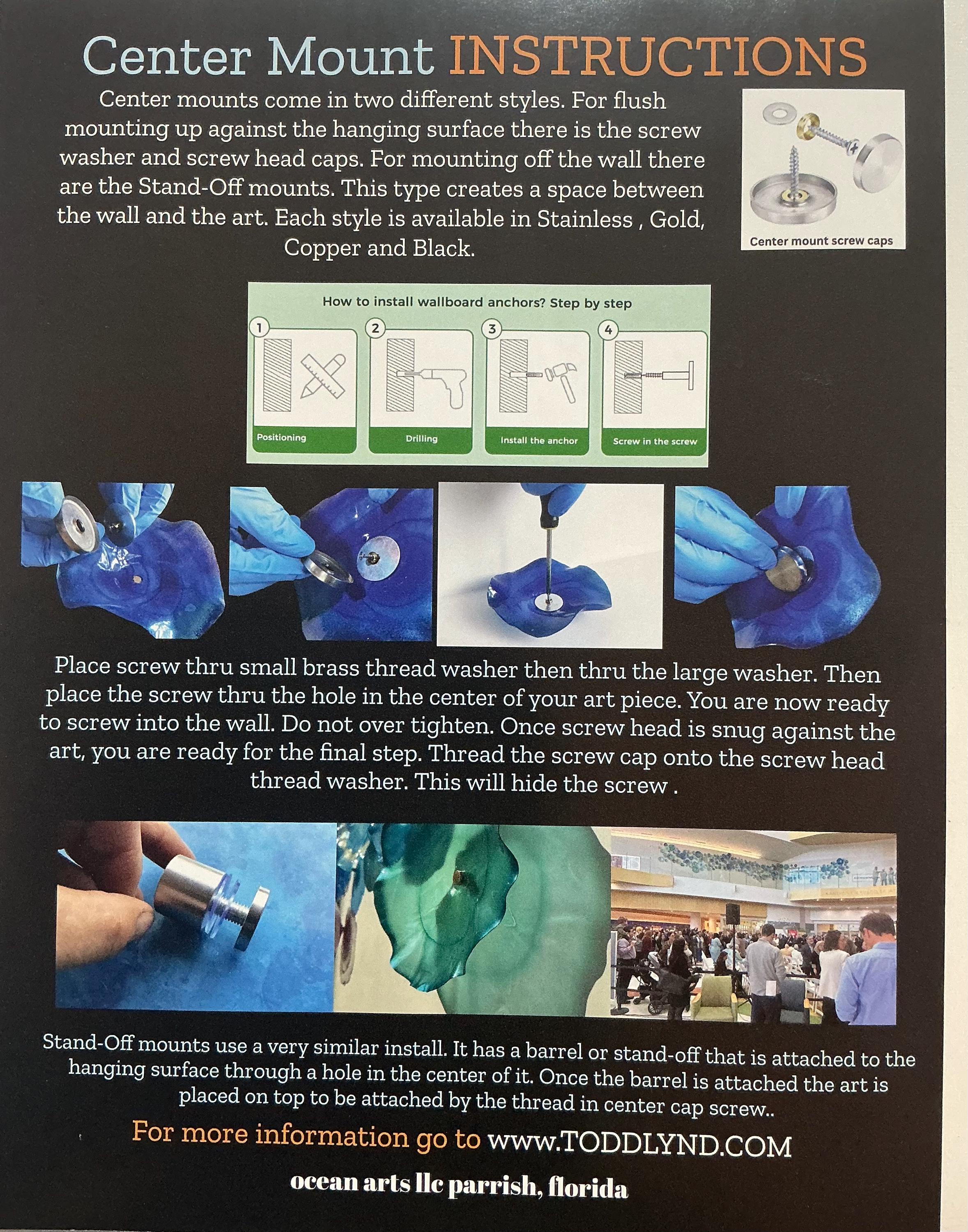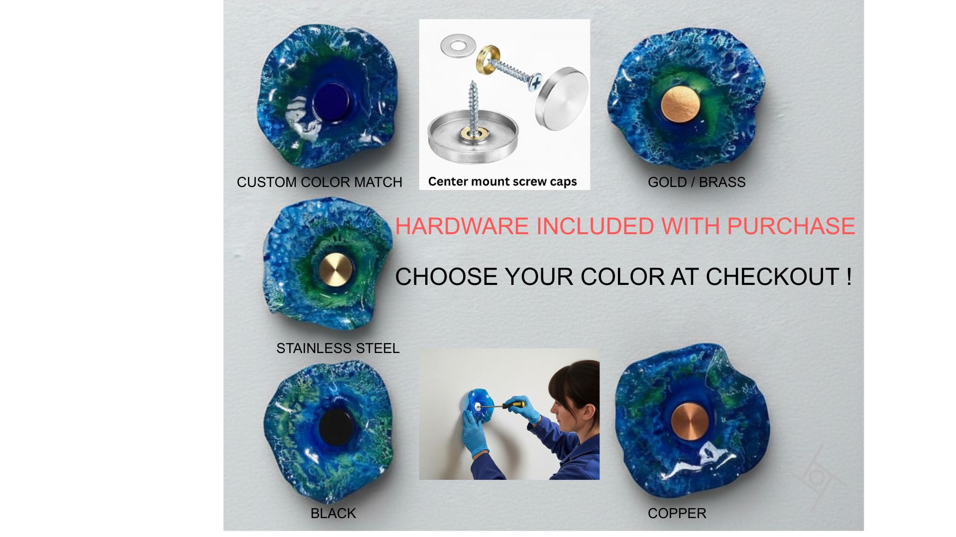 Hang on any surface. For drywall or masonry, use wall anchors and hardware included with all purchases. Center-mount screw caps and covers are available with all purchases. Mounting hardware comes with all purchases and provides a secure center mount for all types of displays. Other mounting styles are available upon request—contact us for more information. At checkout, you will be able to select custom color match or metallic color of your choice.