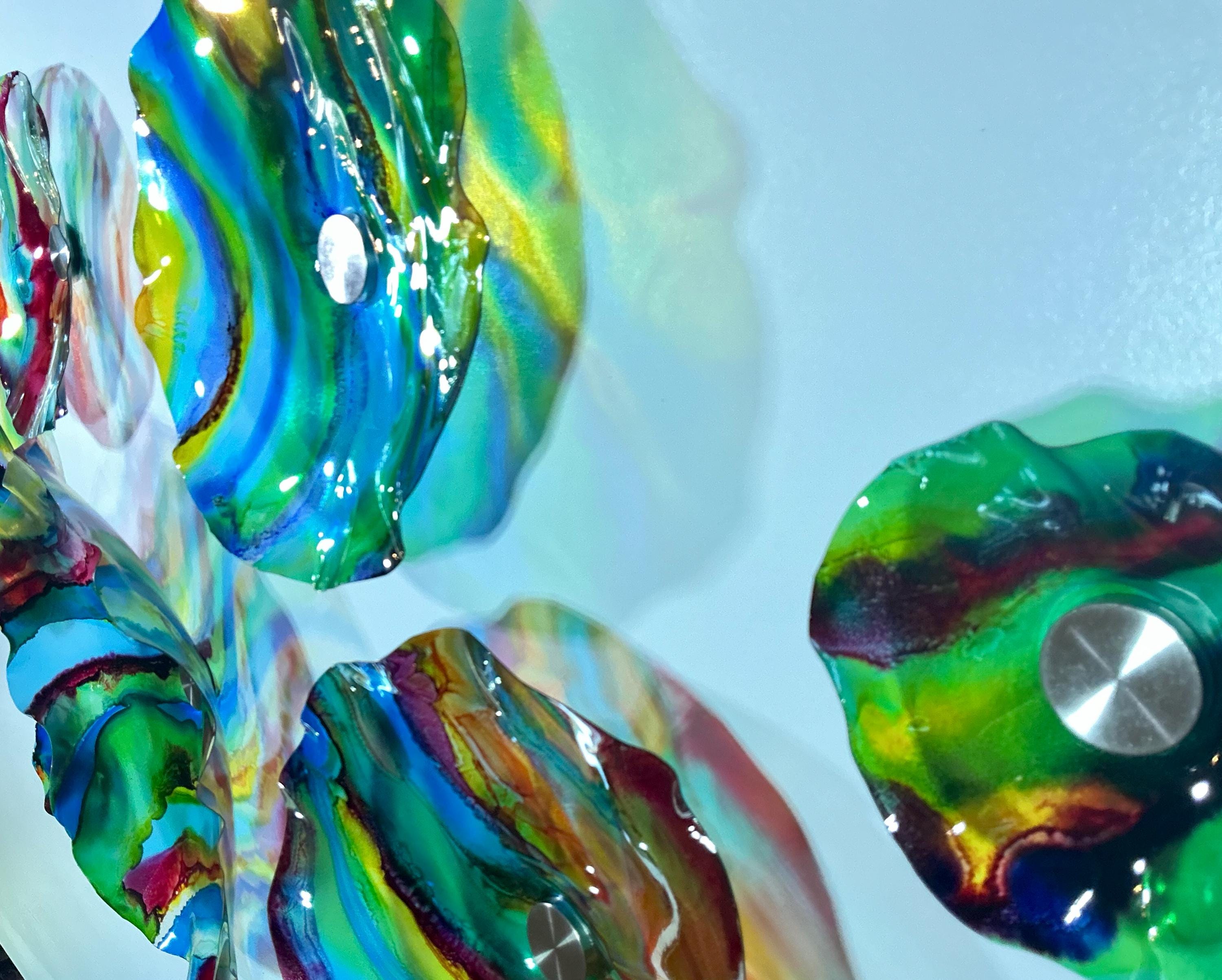 Created by professional artist Todd Lynd, each flower is carefully formed using high heat to fold color into clear recycled material—resulting in vibrant, eye-catching art that truly stands out.