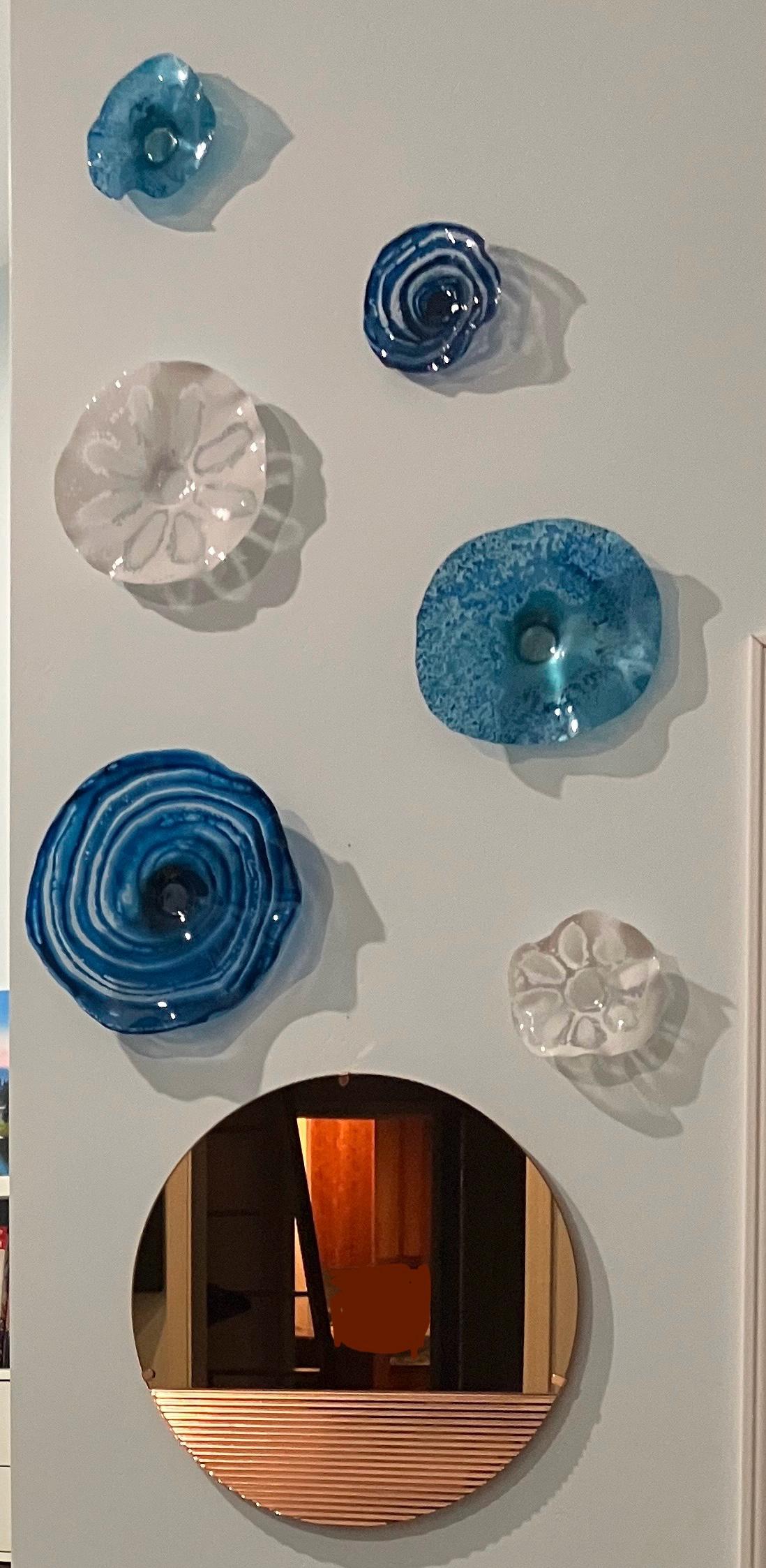 From the wall, they look like glass. The bonuses are that these flowers are light, unbreakable, environmentally friendly, easy to hang, and have no damage to the wall due to drilling for would-be-heavy traditional glass flowers.