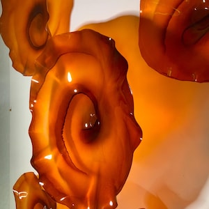 Each collectible piece is unique, no two are alike. This permanent, colorful, eye catching art looks and feels like glass. They shimmer in the light resembling water. They are very DURABLE AND LIGHTWEIGHT. These flowers are easy to hang, all weather and UV resistant. Great for indoor or outdoor decorating.