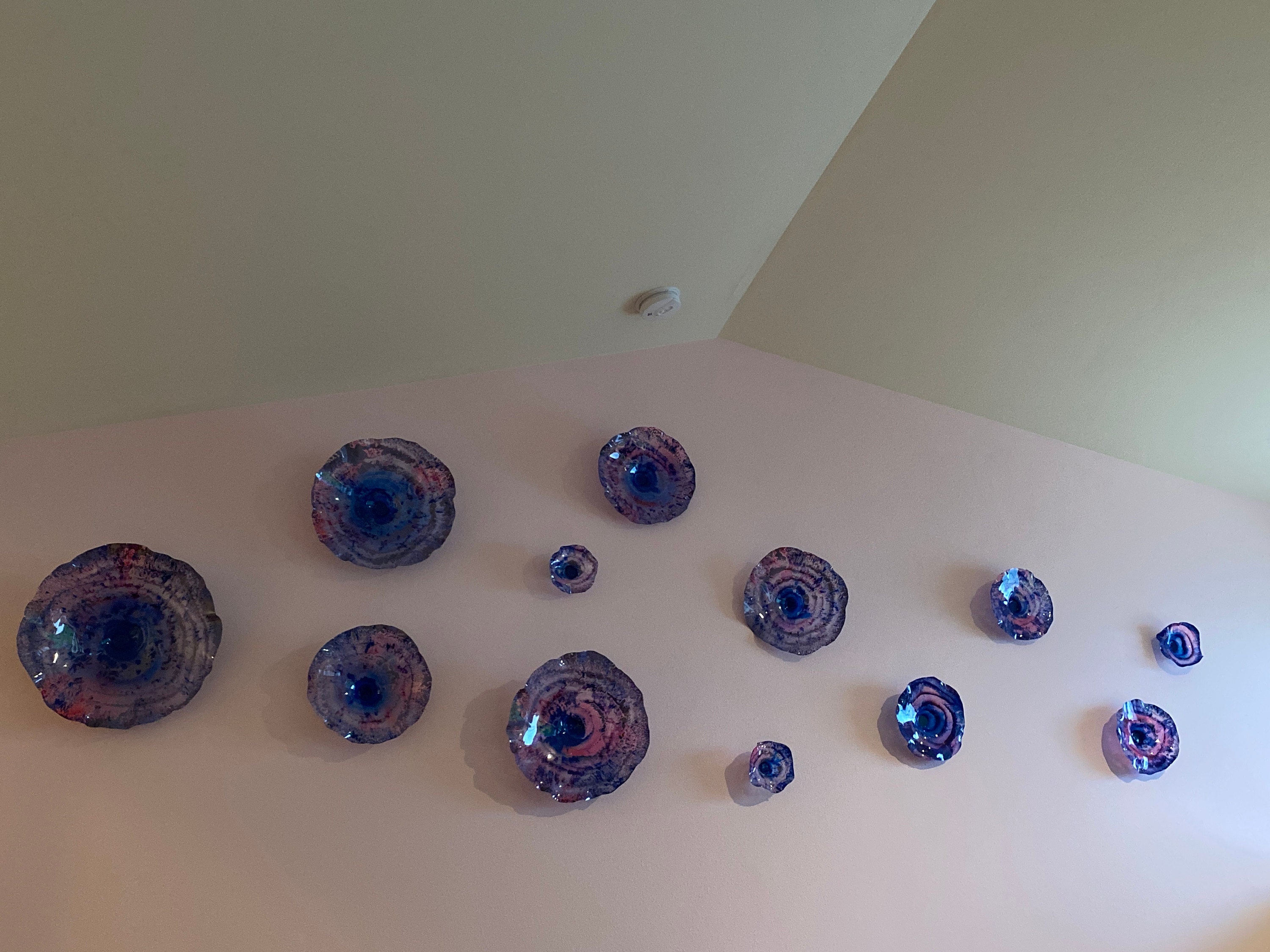 Large wall flower sculpture. Add color and joy to any space with this set of 9 wall art. A Tranquil blend of lavender, blues and pink. This piece can be hung a variety of ways, and will brighten up any space you can envision. The light filters through creating a dramatic effect on the hanging surface.