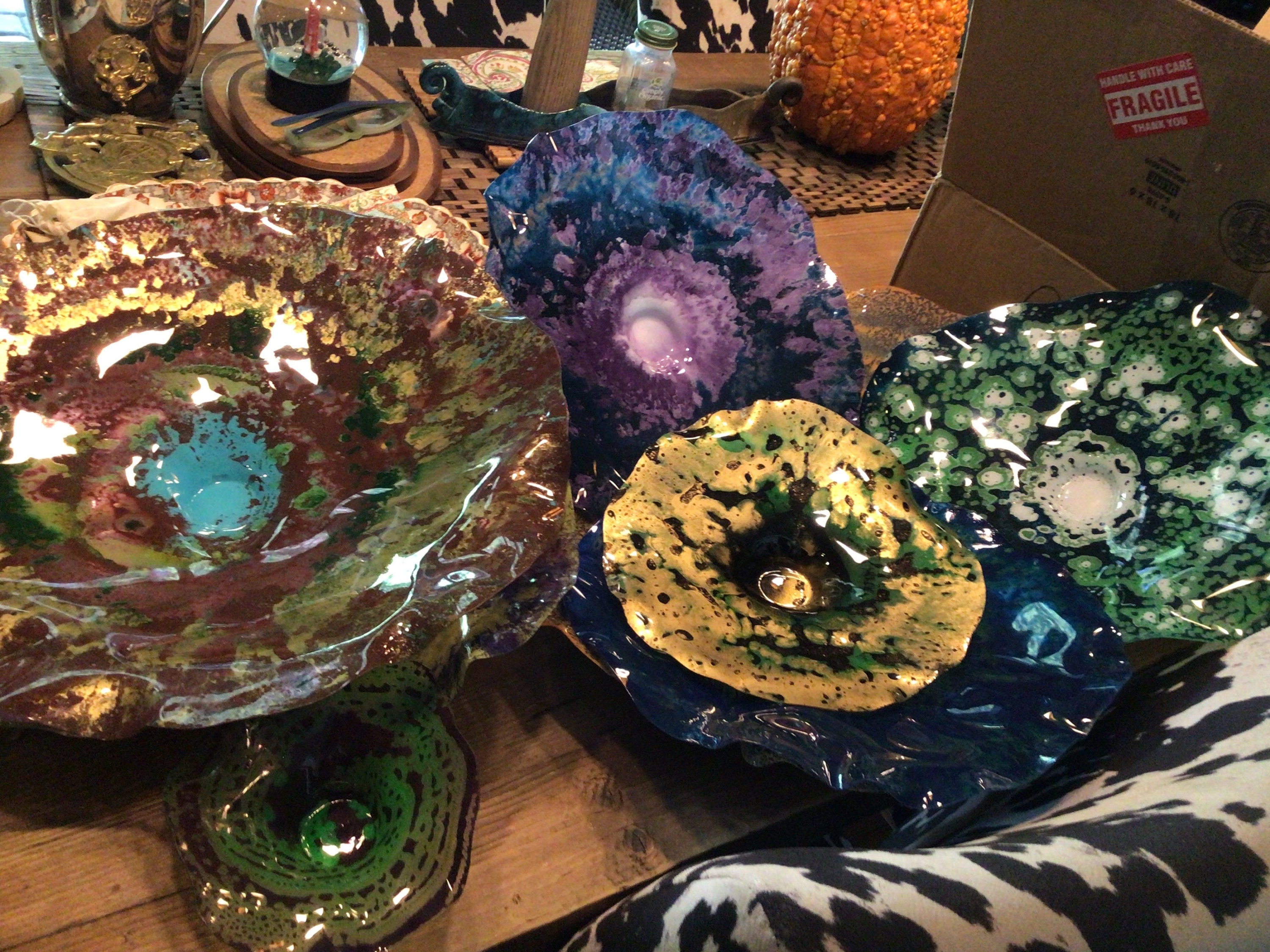 Each collectible piece is unique, no two are alike. This permanent, colorful, eye catching art looks and feels like glass. It shimmers in the light resembling water. They are very DURABLE AND LIGHTWEIGHT. These flowers are easy to hang, are wall weather and will not fade in the sun. Great for indoor or outdoor decorating.