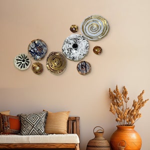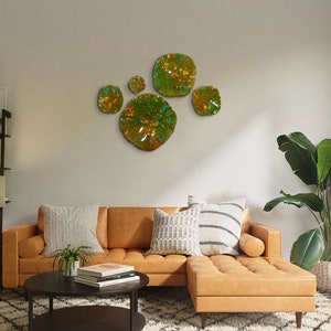 Wall flower sculpture set of 7 This spectacular uplifting set will brighten up any space metallic silver with orange blend. The light filters through creating a dramatic effect on the hanging surface.