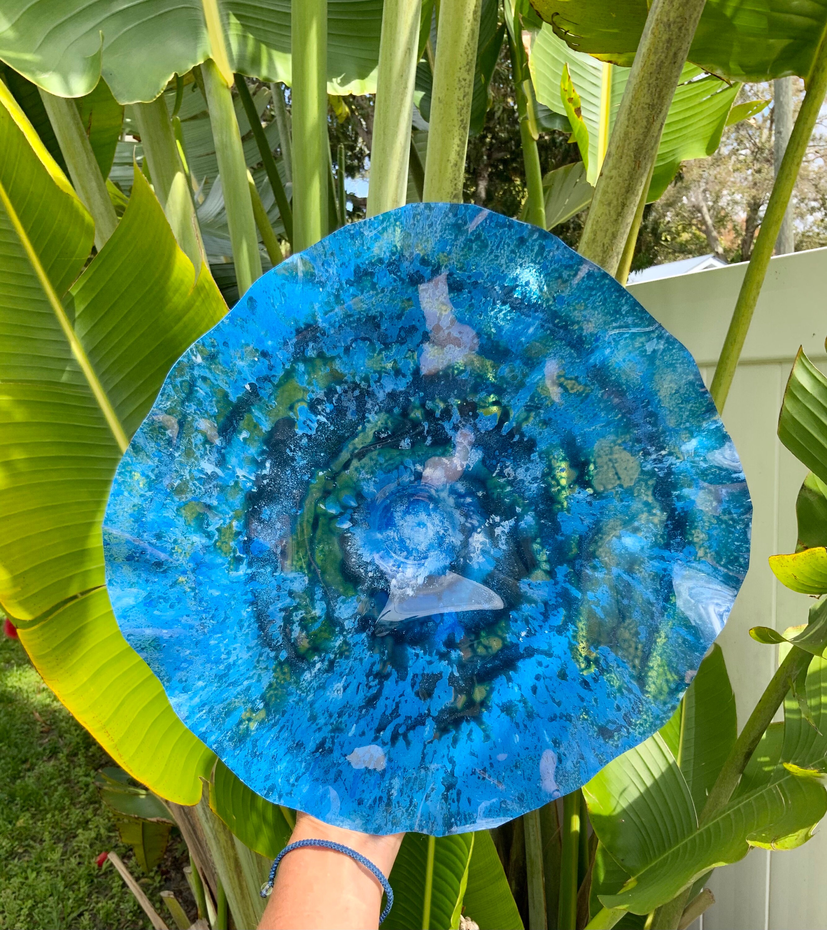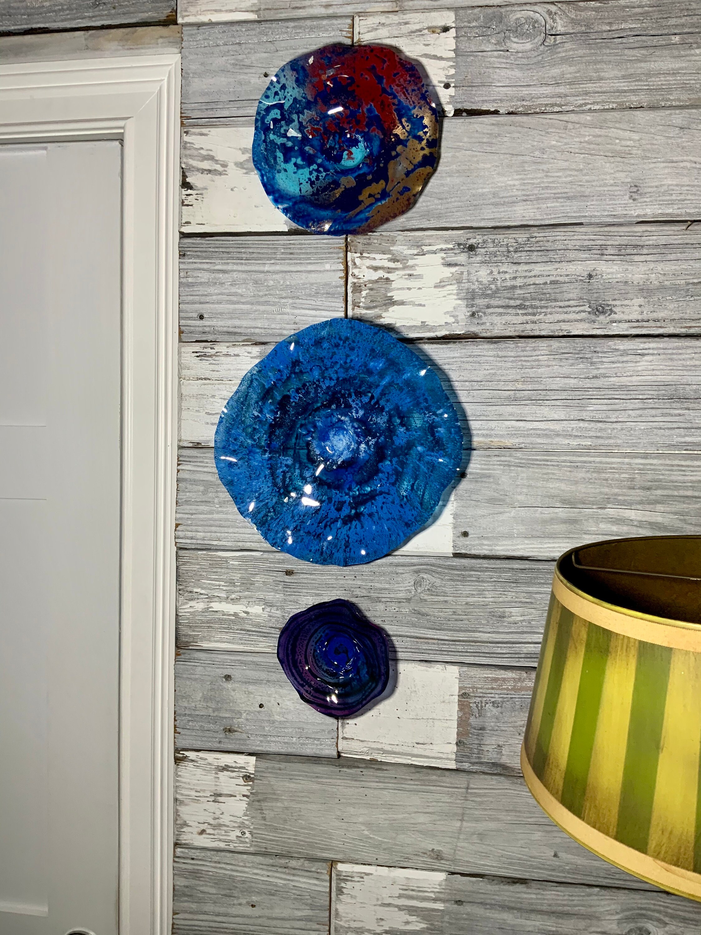 Each flower come with a hanger with a hole in the back for easy hanging. Each piece is light weight and all you will need is a nail or thumb tack to hang it from. If you can hang a picture, you can hang these plates. Each order comes with a set of hanging instructions. For outdoor hanging, please request our free outdoor hardware. For ceiling hanging please request velcro.